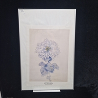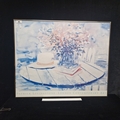 A 1987 'Patrick Livingstone' gallery poster print featuring a still life of a hat, flowers and books. Housed in a brushed metal frame behind glass.
