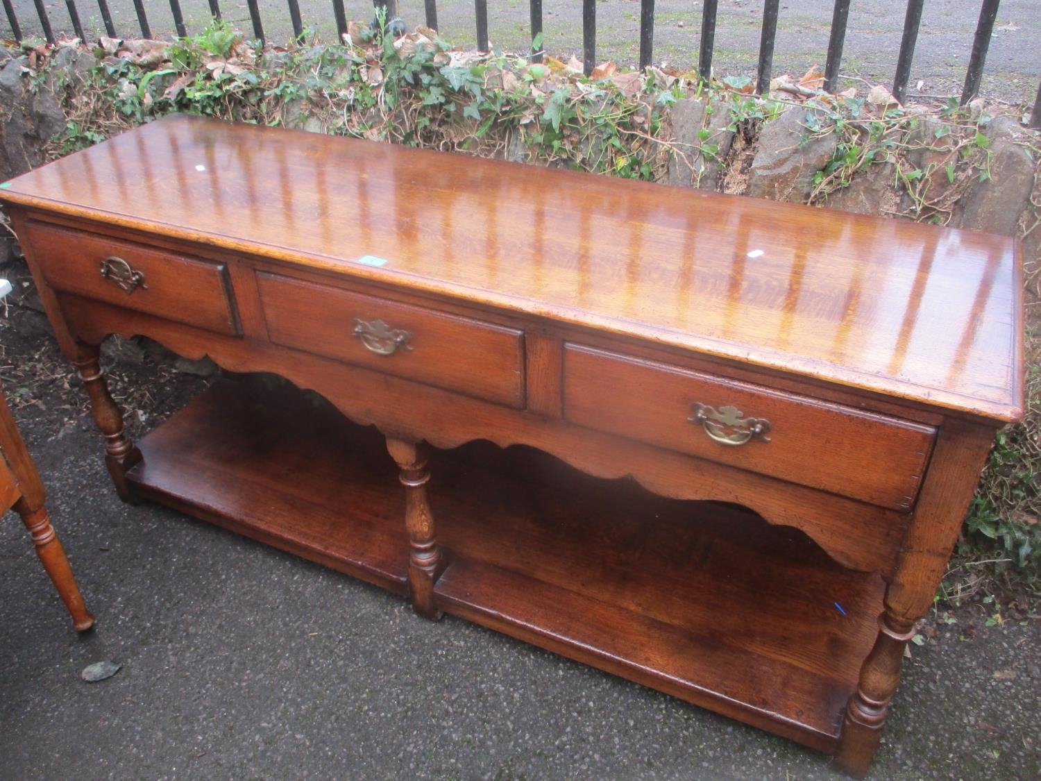 A reproduction oak Titchmarsh & Goodwin dresser base with three drawers and shelf below 76cm h x 168 cm w