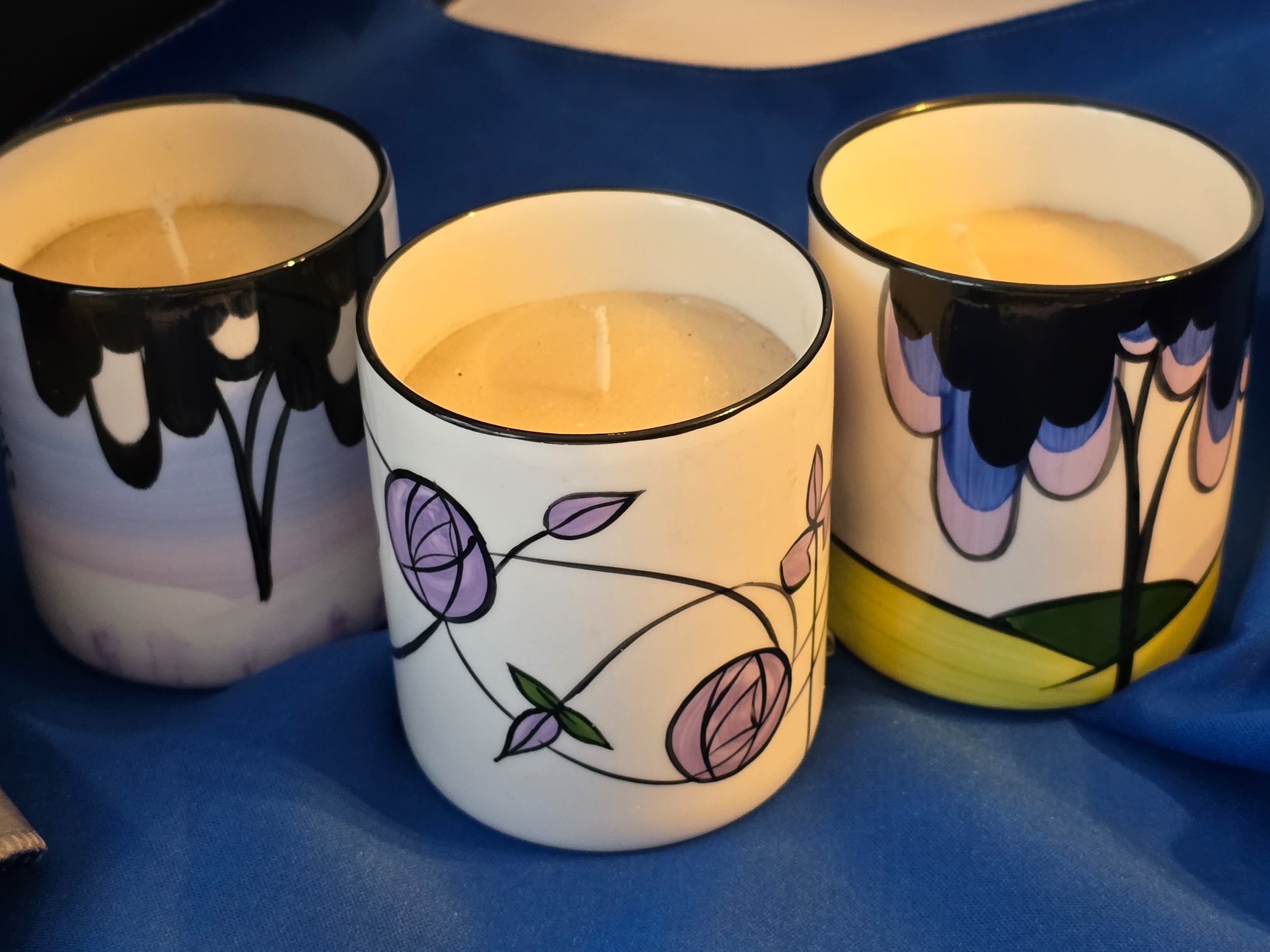 Three quality ceramic candle-holders (with candles) - Hand -painted by Brian Wood Ceramics in Stoke-on-trent. In the Madison, Val D'isere, and Elmfield patterns. Highly collectable. As new condition. Each 81mm tall, 73mm diam.