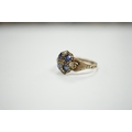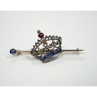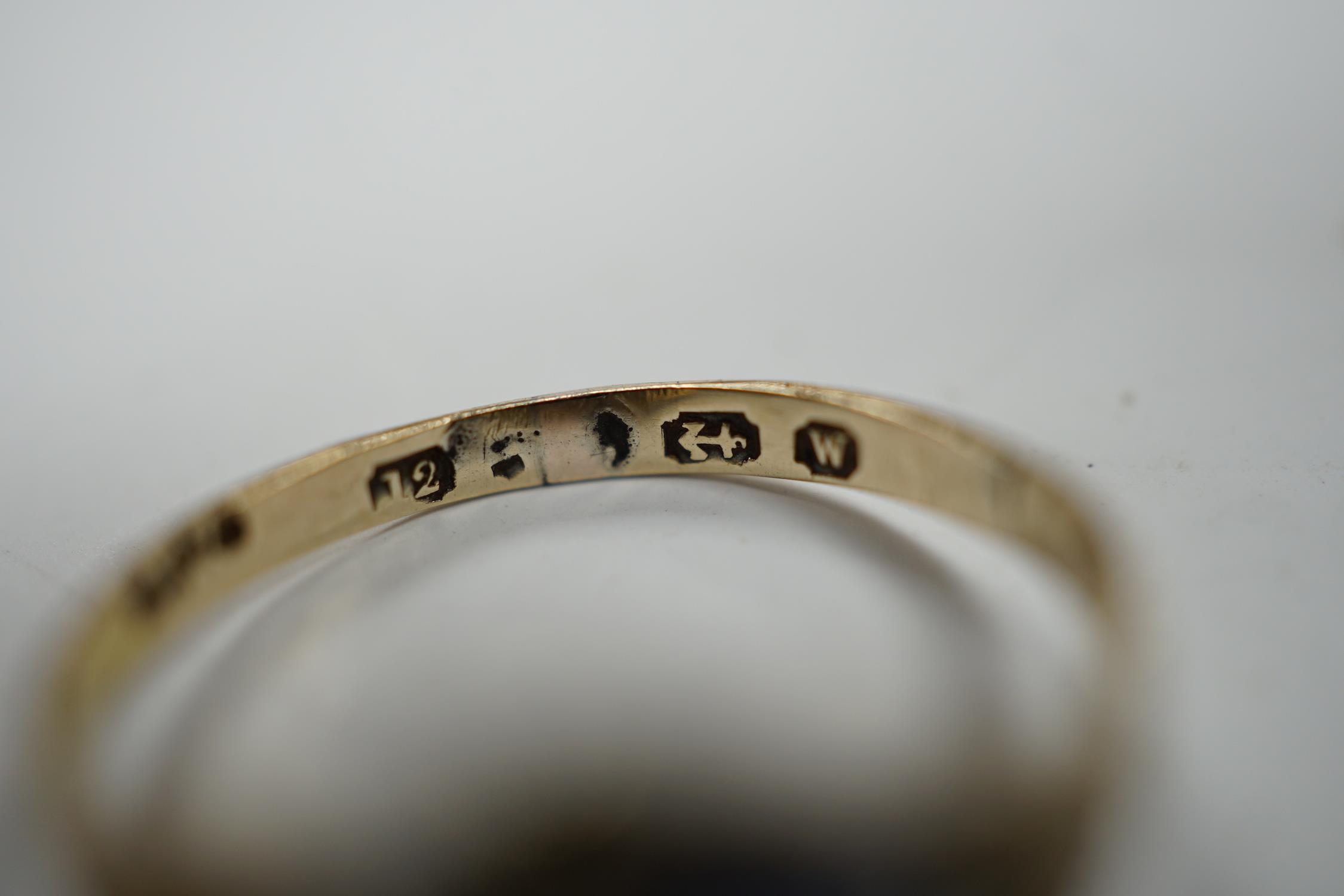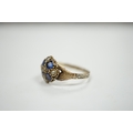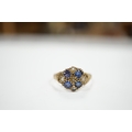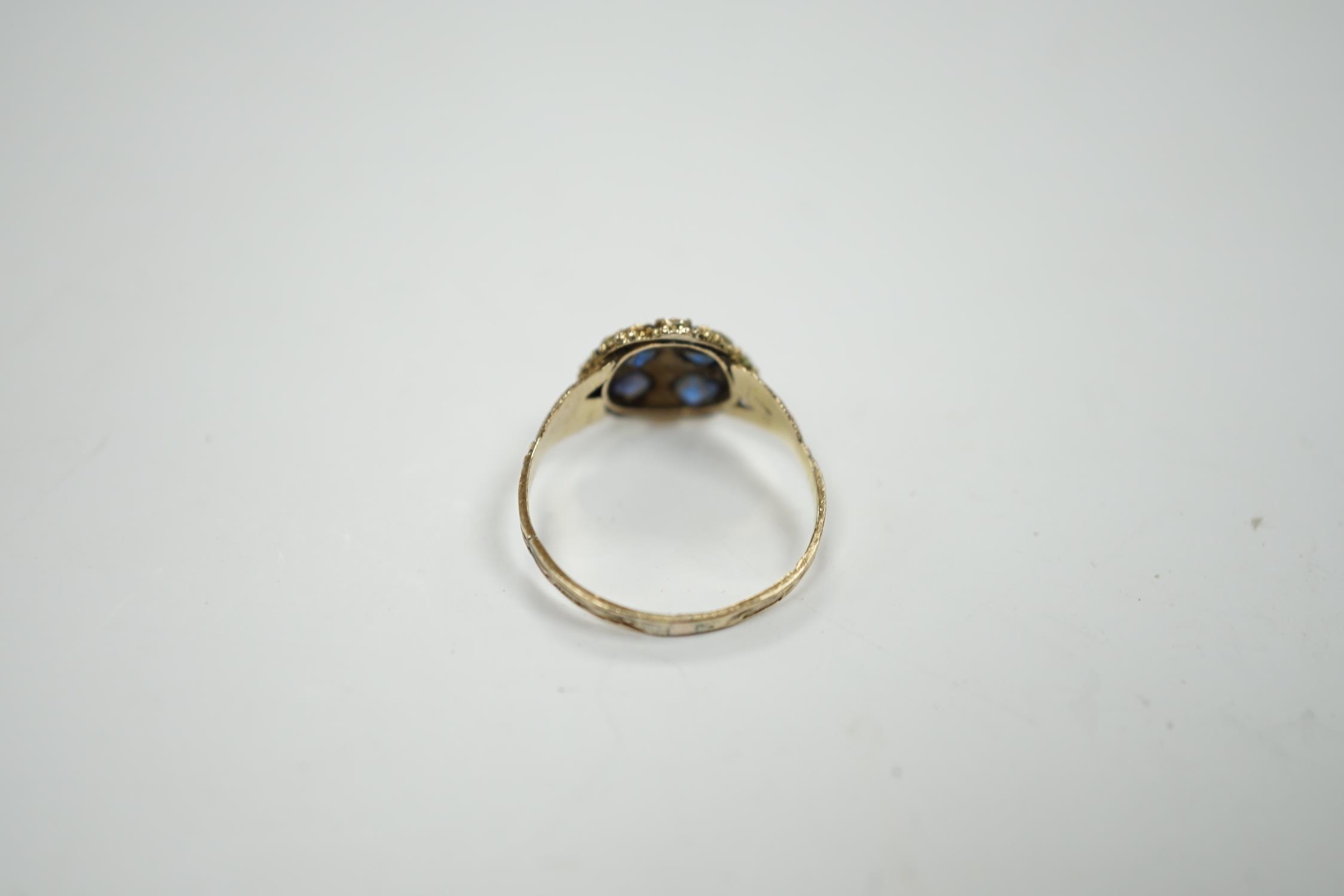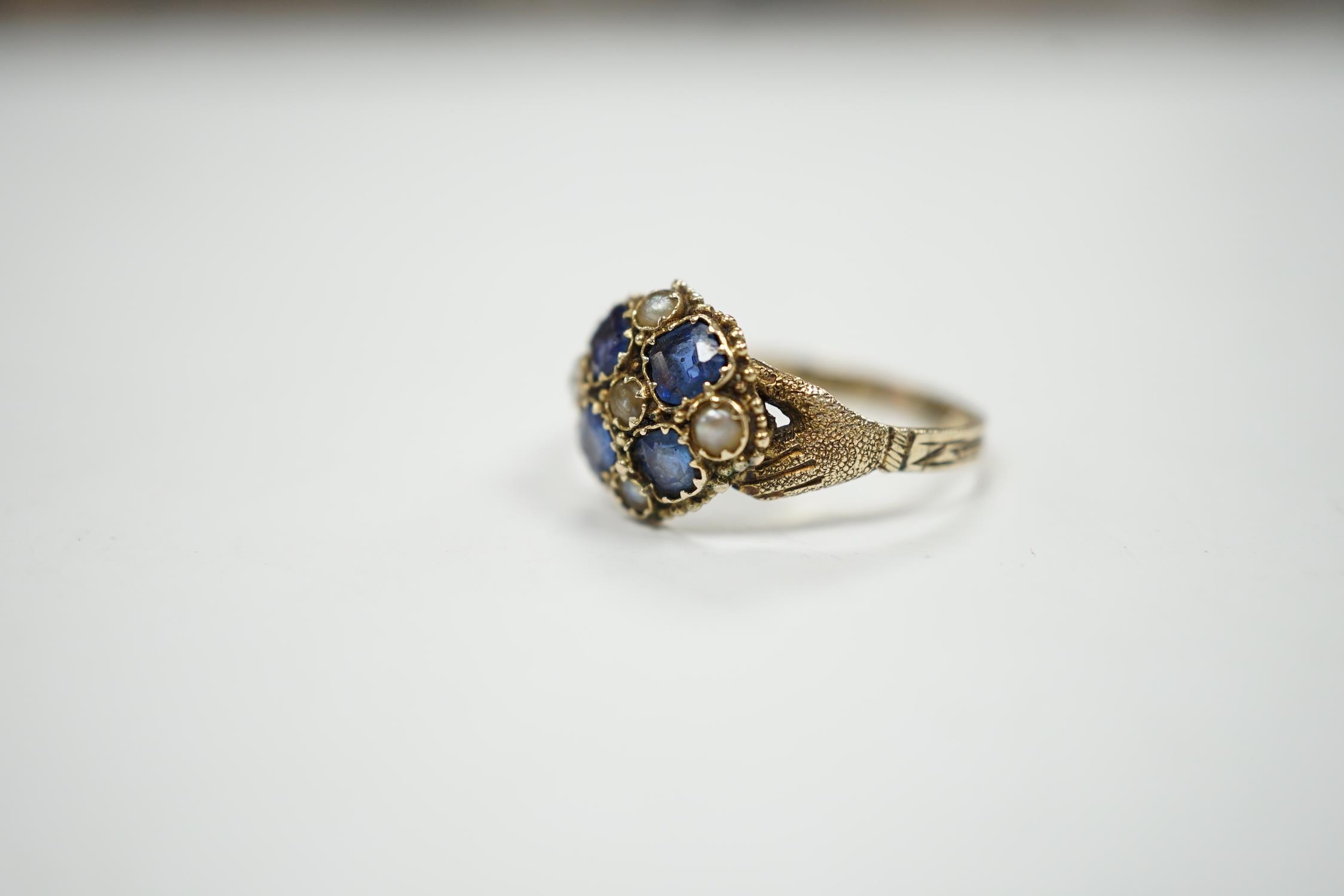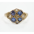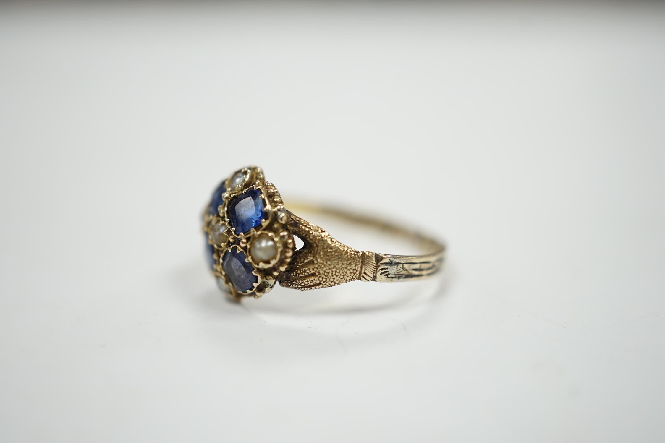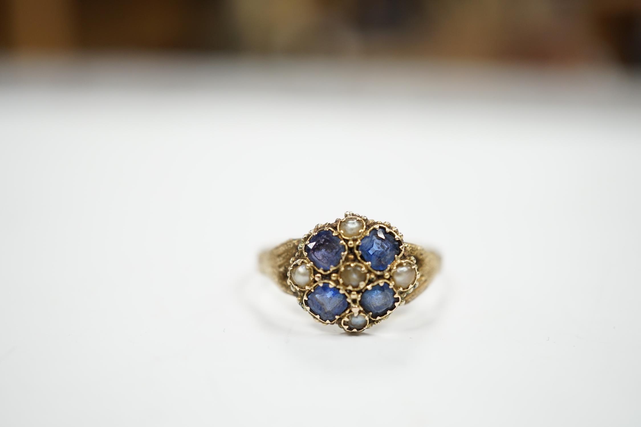 A Victorian 12ct gold sapphire and seed pearl cluster set ring, size M, gross weight 1.6 grams.