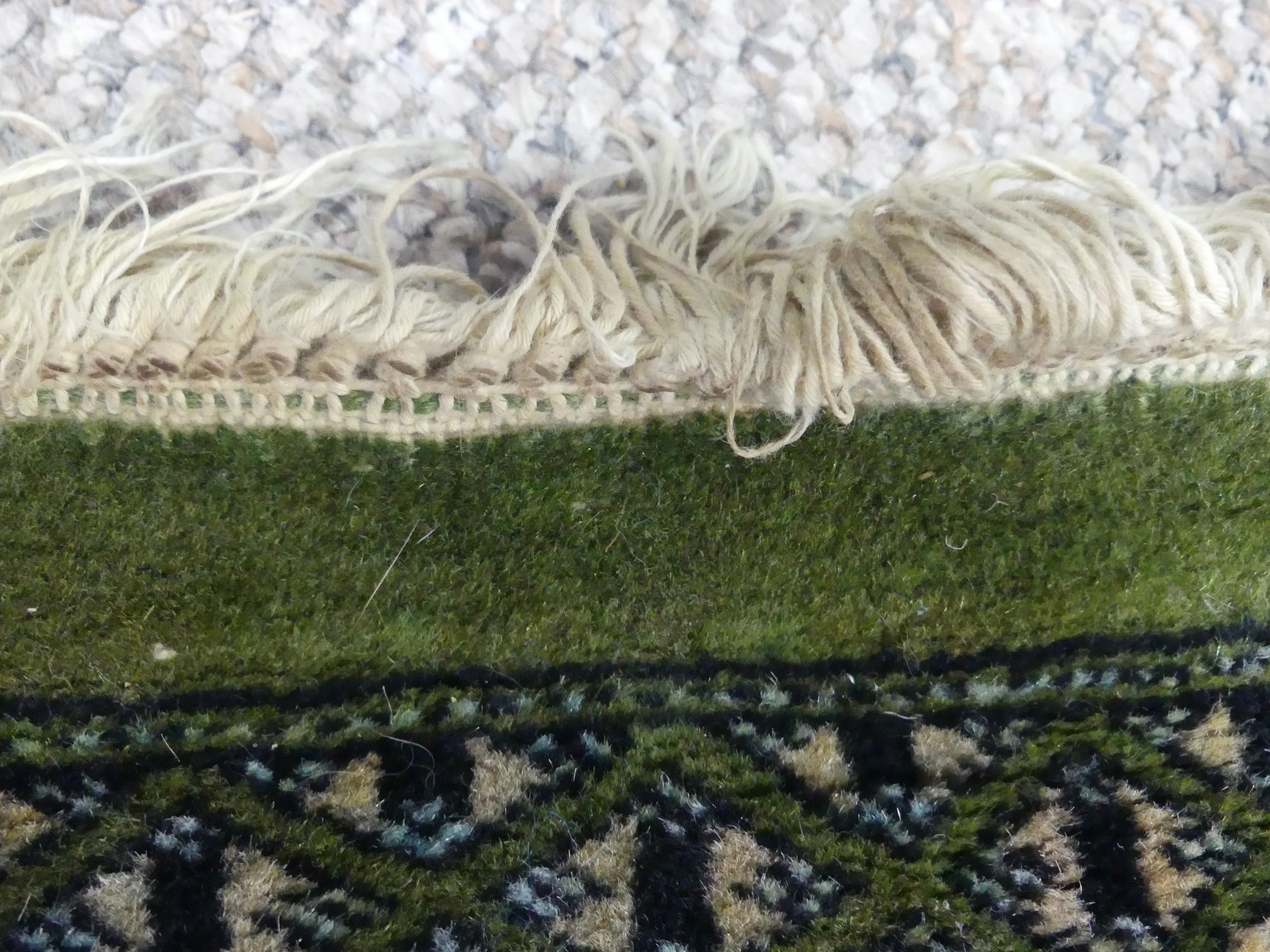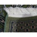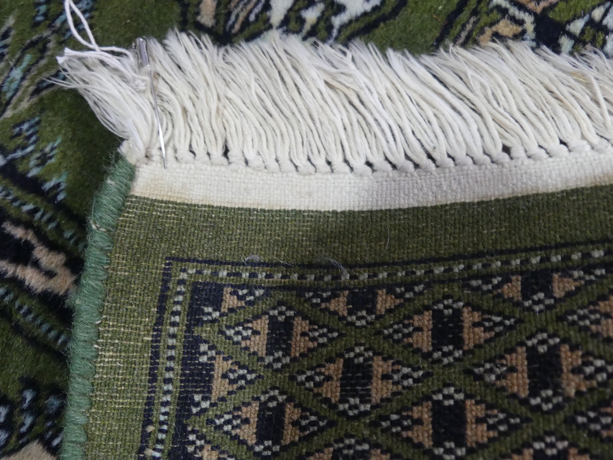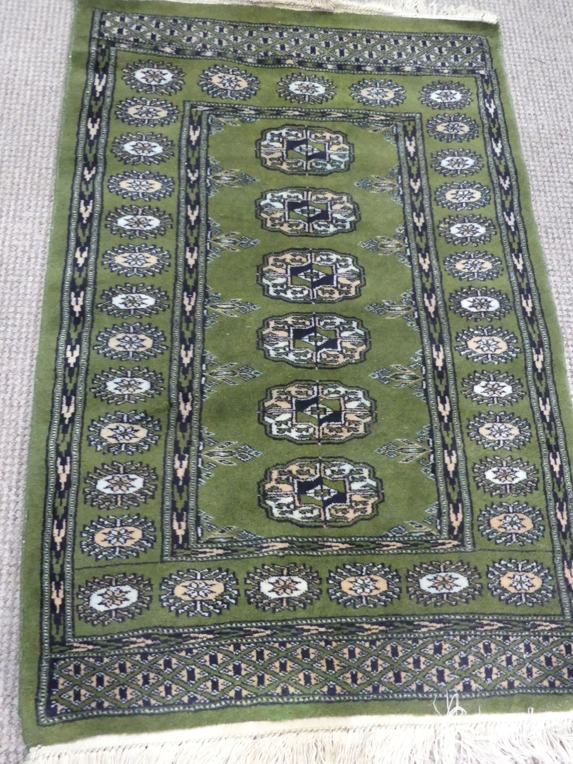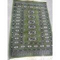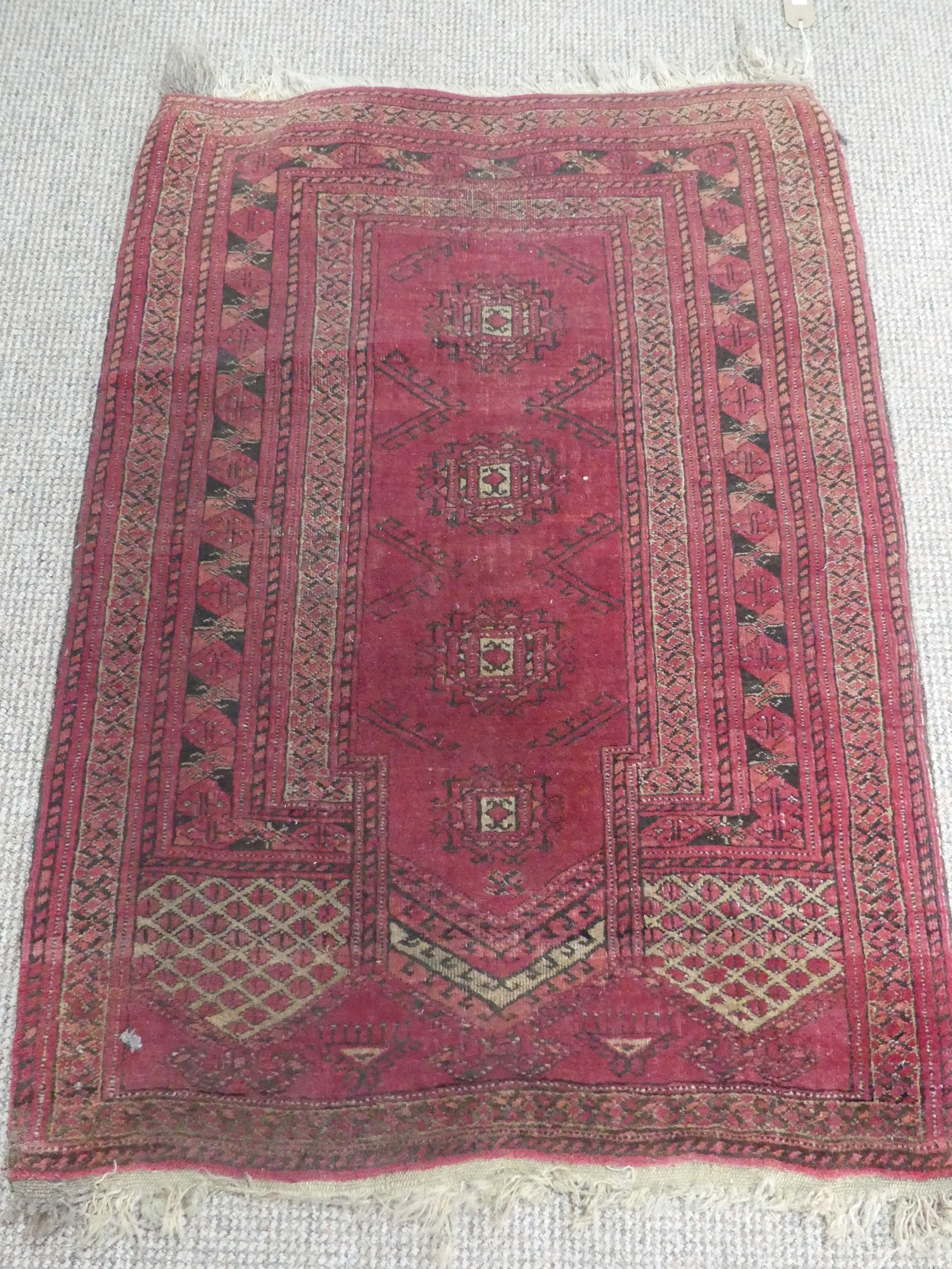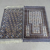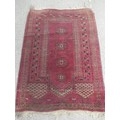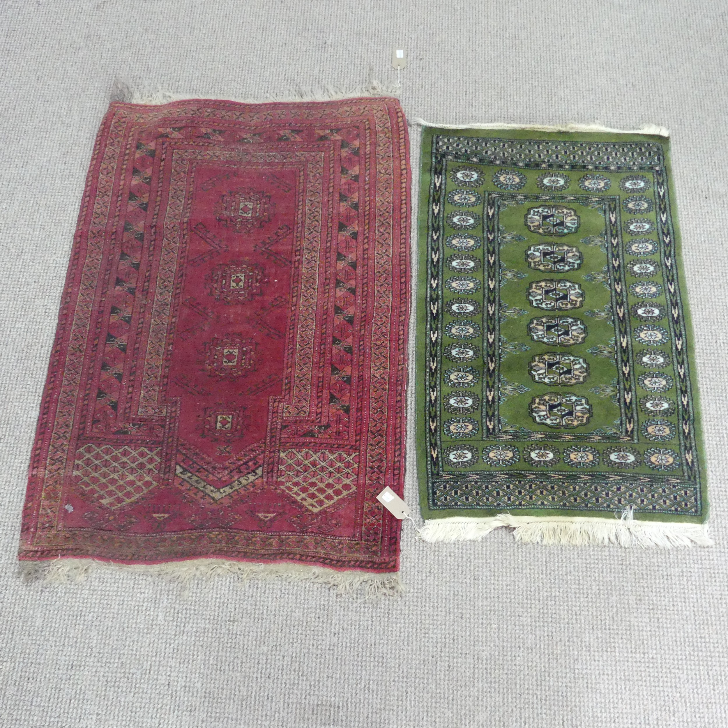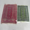 Tribal Rugs; a red ground Belouchi Prayer Rug, 100% wool, 117cm x 79cm, together with a finely knotted green ground Bokhara rug wool pile on cotton base, 104cm x 61cm, both in good condition (2)