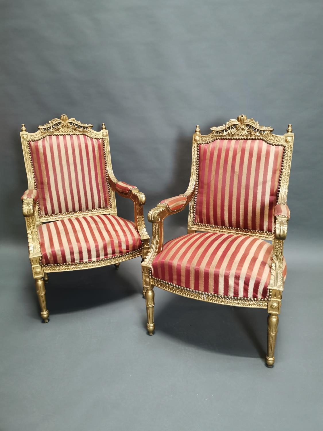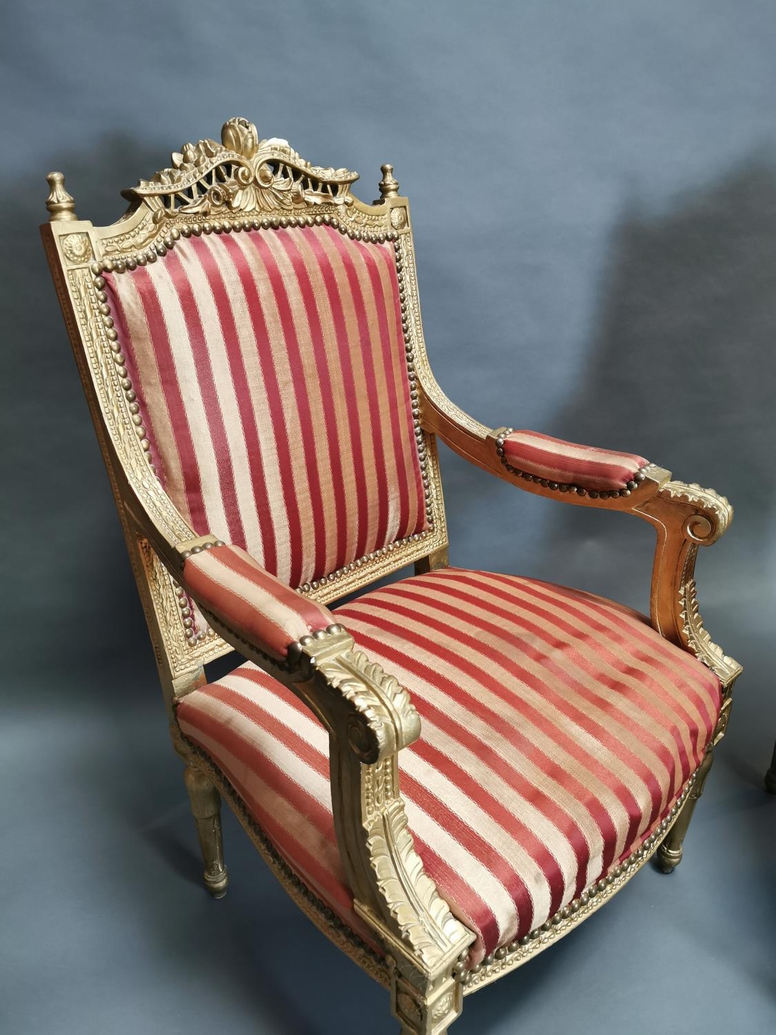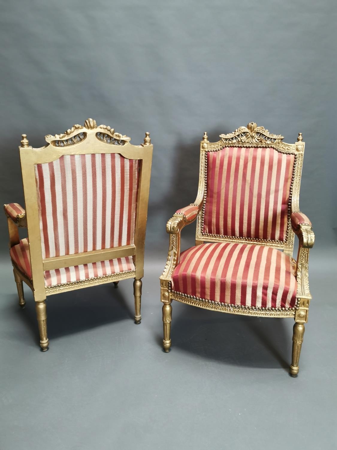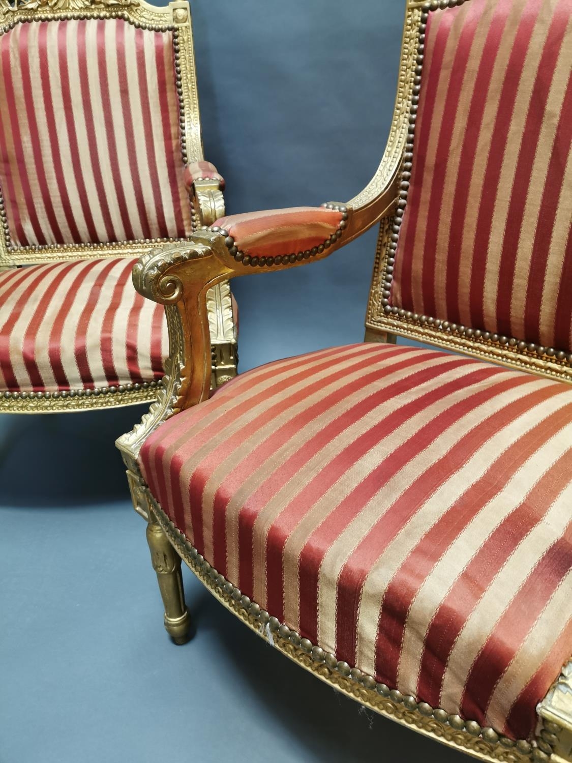 Pair of carved giltwood and upholstered arm chairs in the French style {108 cm H x 56 cm W x 56 cm D}.