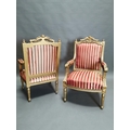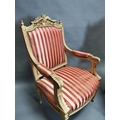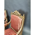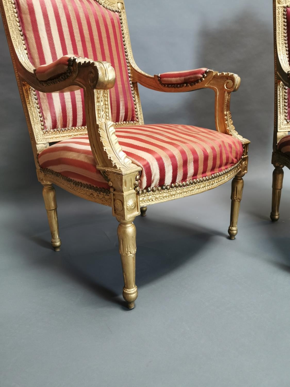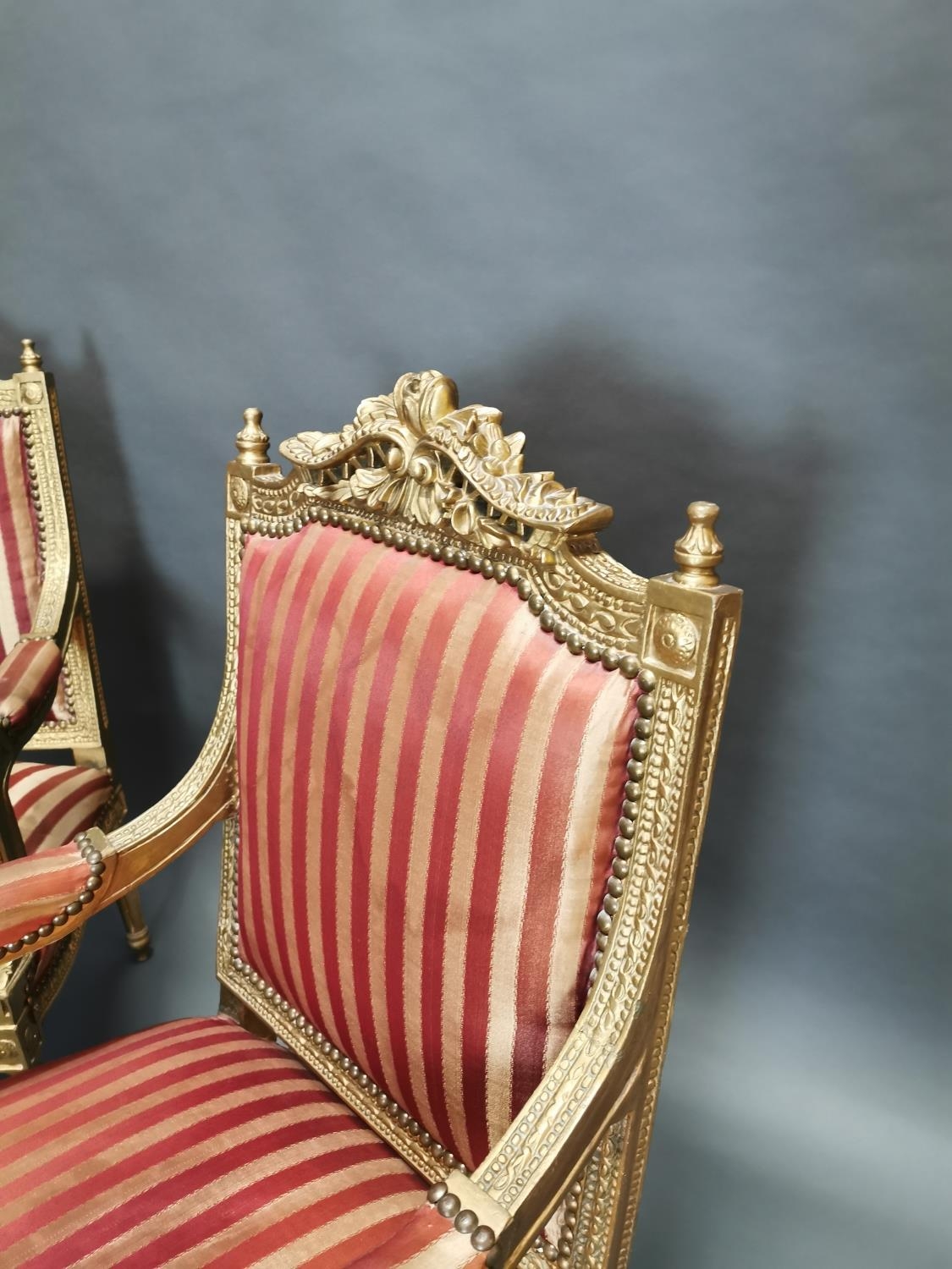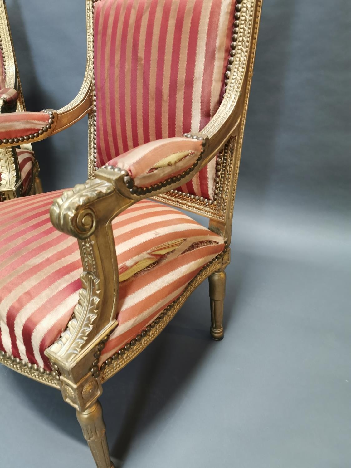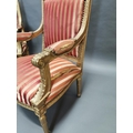 Pair of carved giltwood and upholstered arm chairs in the French style {108 cm H x 56 cm W x 56 cm D}.