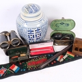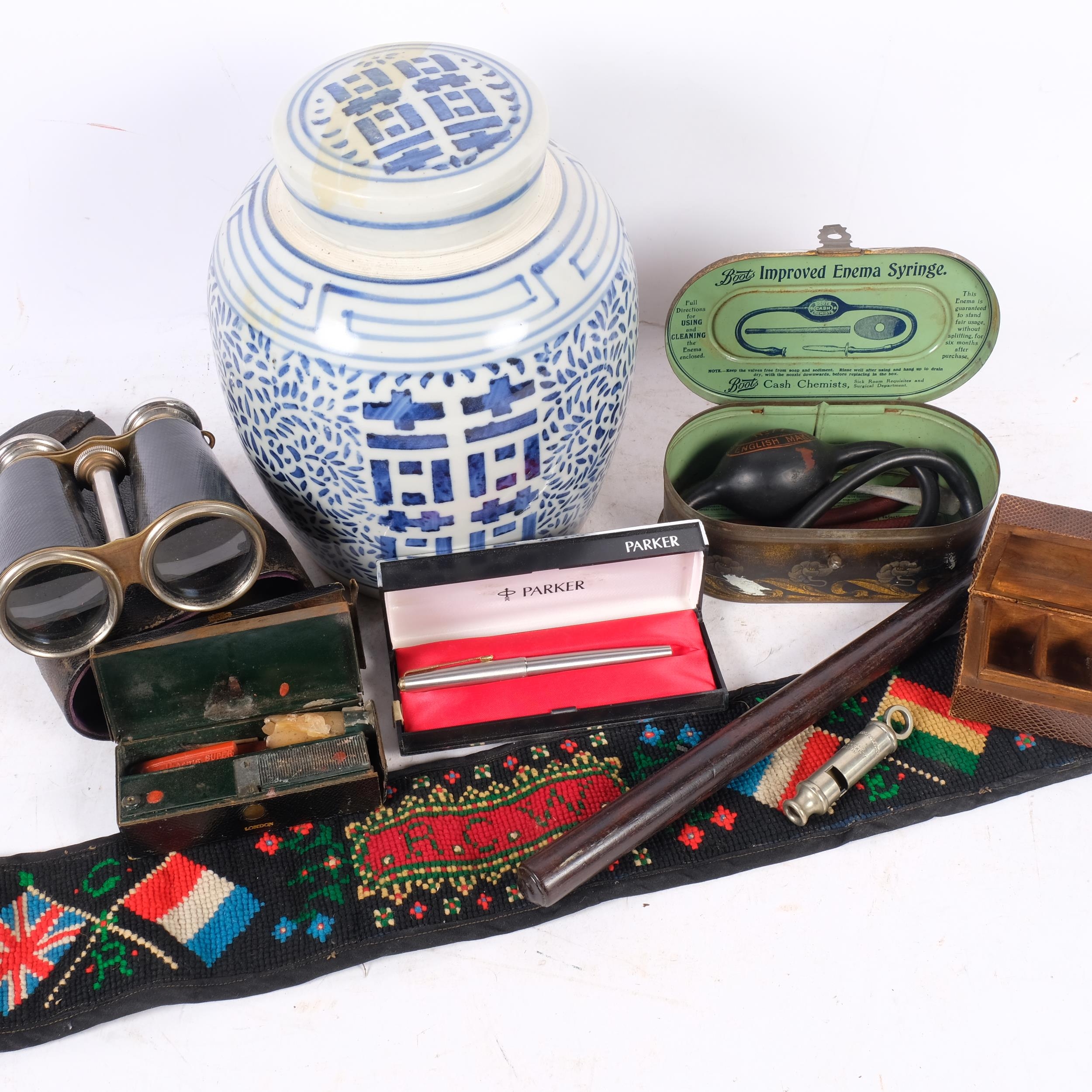A small collection of various collectables, including a Vintage Boots Improved enema syringe, original tin box, stamp box, a Metropolitan whistle, a Victorian leather-covered desk seal set with patent, a rolling rule, Parker pen, opera glasses, etc