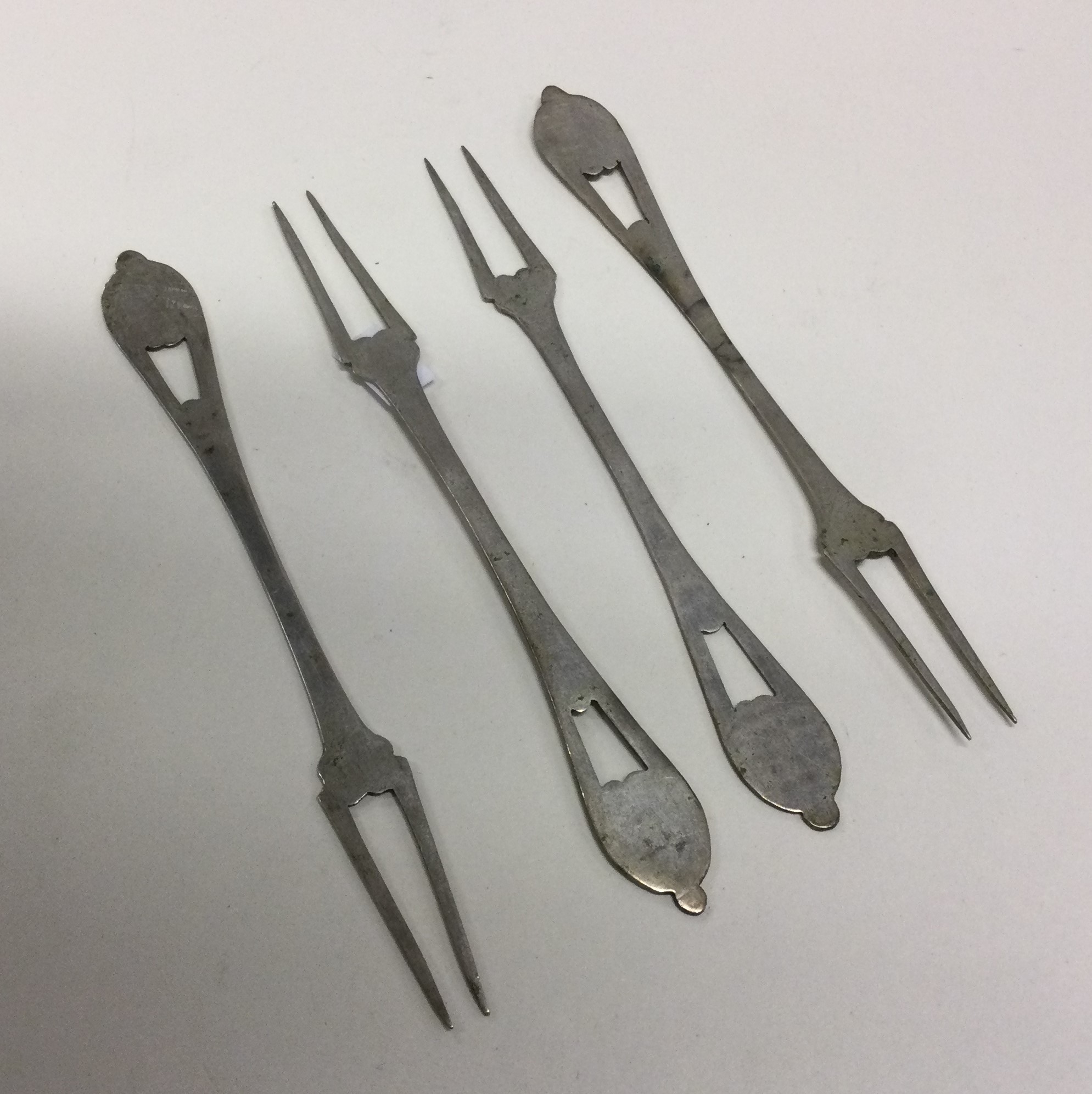 A set of four silver pickle forks. Apparently unmarked. Approx. 19 grams. Est. £30 - £50.