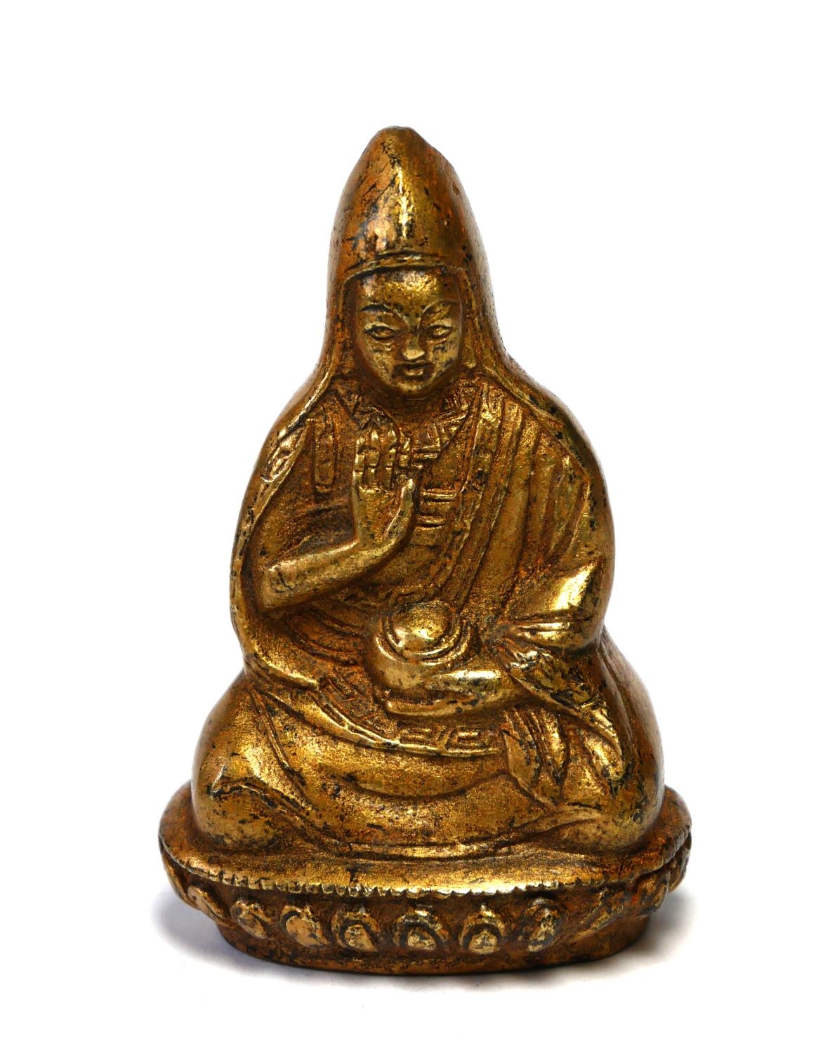 A SMALL CHINESE/TIBETAN GILT BRONZE BUDDHA