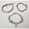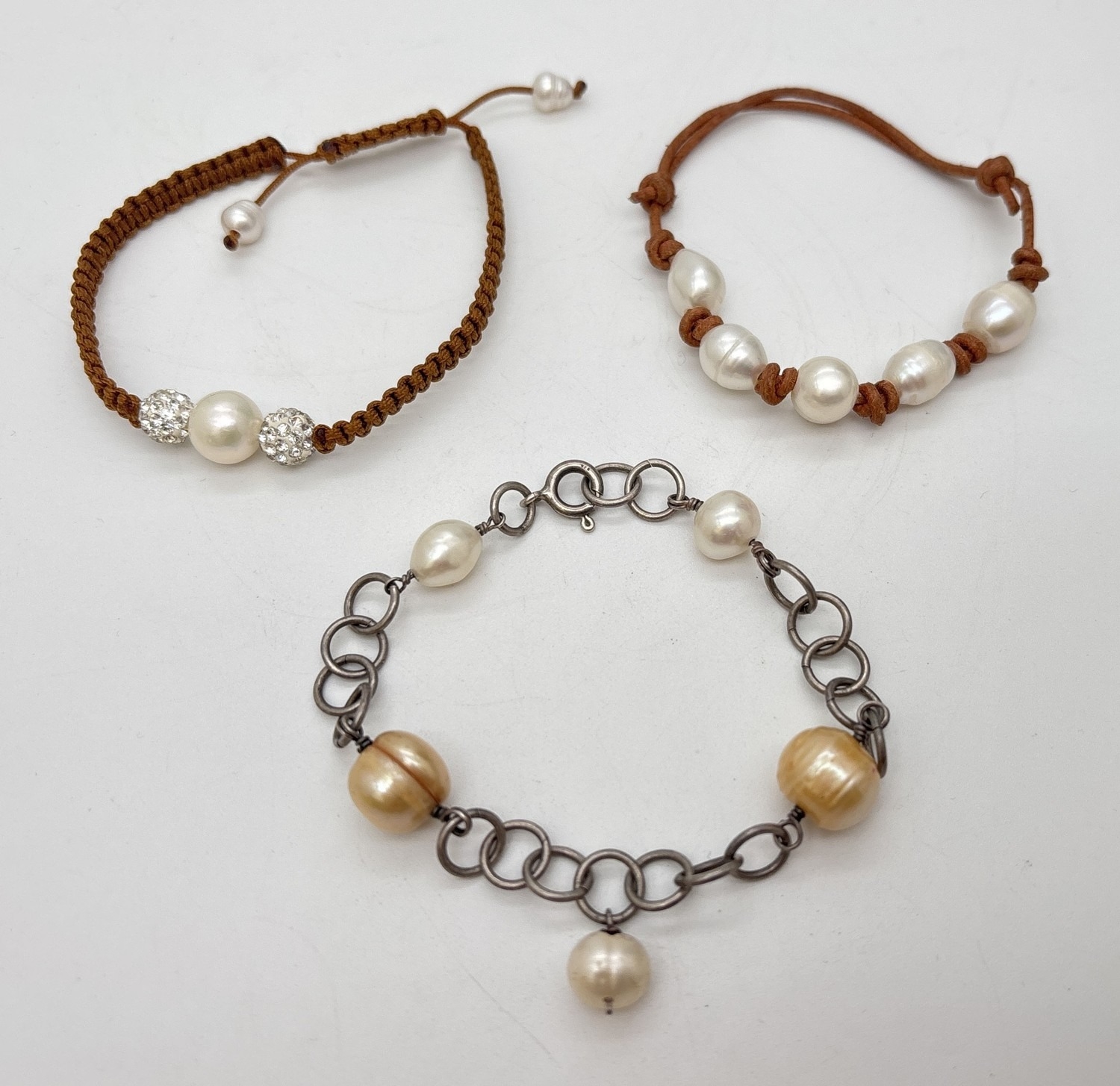 3 freshwater pearl bracelets. A silver circular link bracelet with 2 pale yellow and 3 white pearls, stamped 925, a brown leather adjustable bracelet with 5 white pearls and an adjustable brown cord bracelet with white pearl and disco ball decoration.