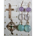 A pair of 9ct gold quartz ear pendants, an Edwardian 9ct gold cross pendant and an Edwardian 9ct gold and paste pendant.