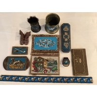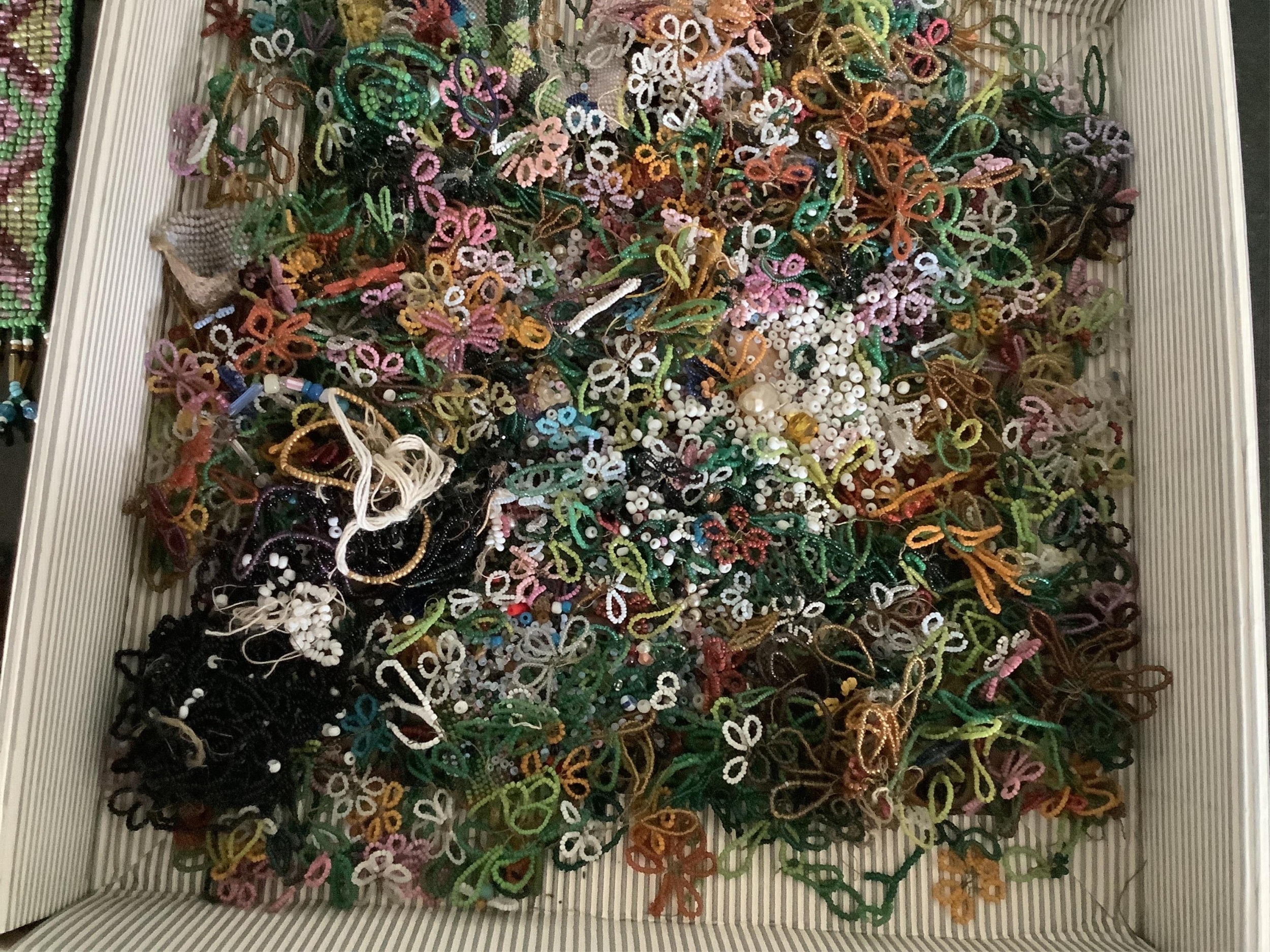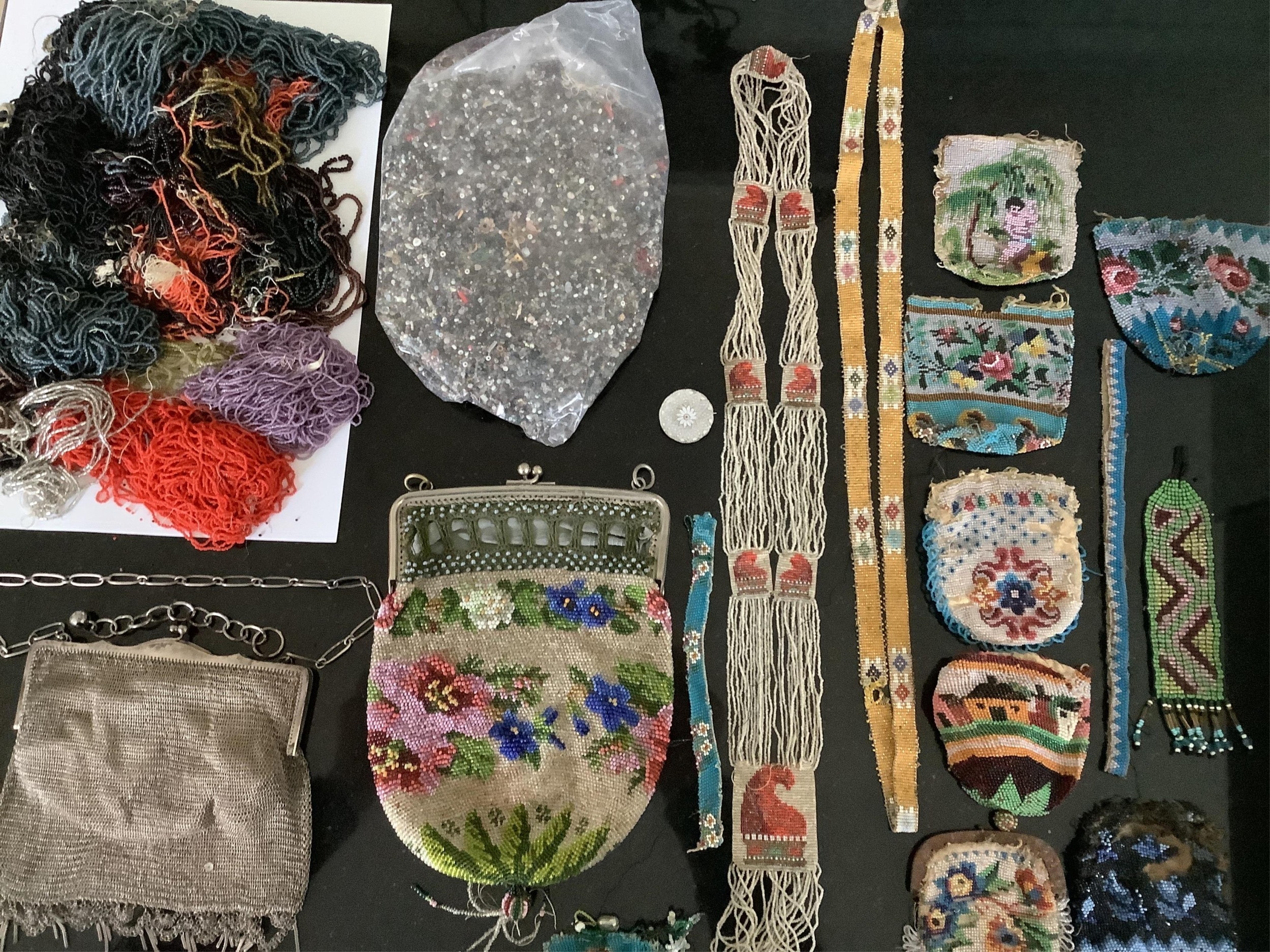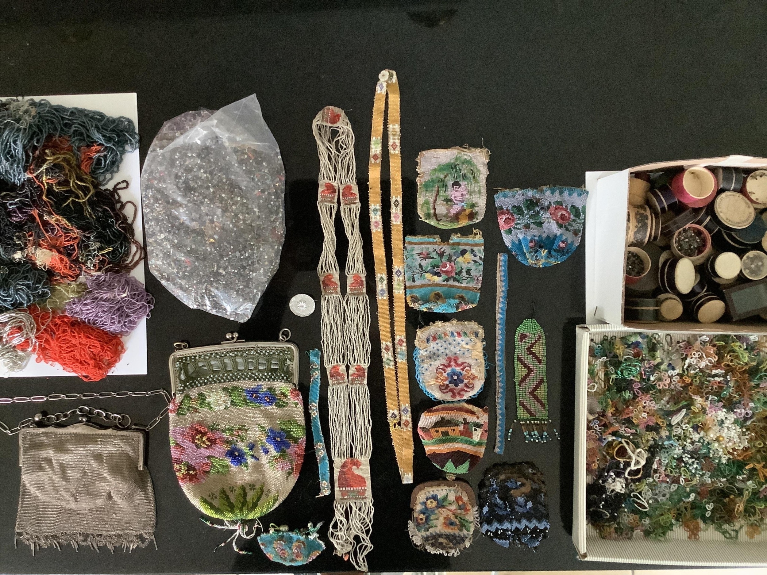A fine chain mail evening bag, a collection of early 19th century hand beaded purses, a similar bag and an unusual collection of finely beaded motifs, fringing, etc. and loose boxed beads (in two boxes)