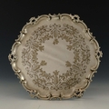A Victorian Old Sheffield Plate salver, Roberts, Cadman and Co., Sheffield circa 1850, circular with ogee rim in the Mannerist style, engraved foliate scroll decoration, on three fleur de lys bracket feet, 28cm diameter