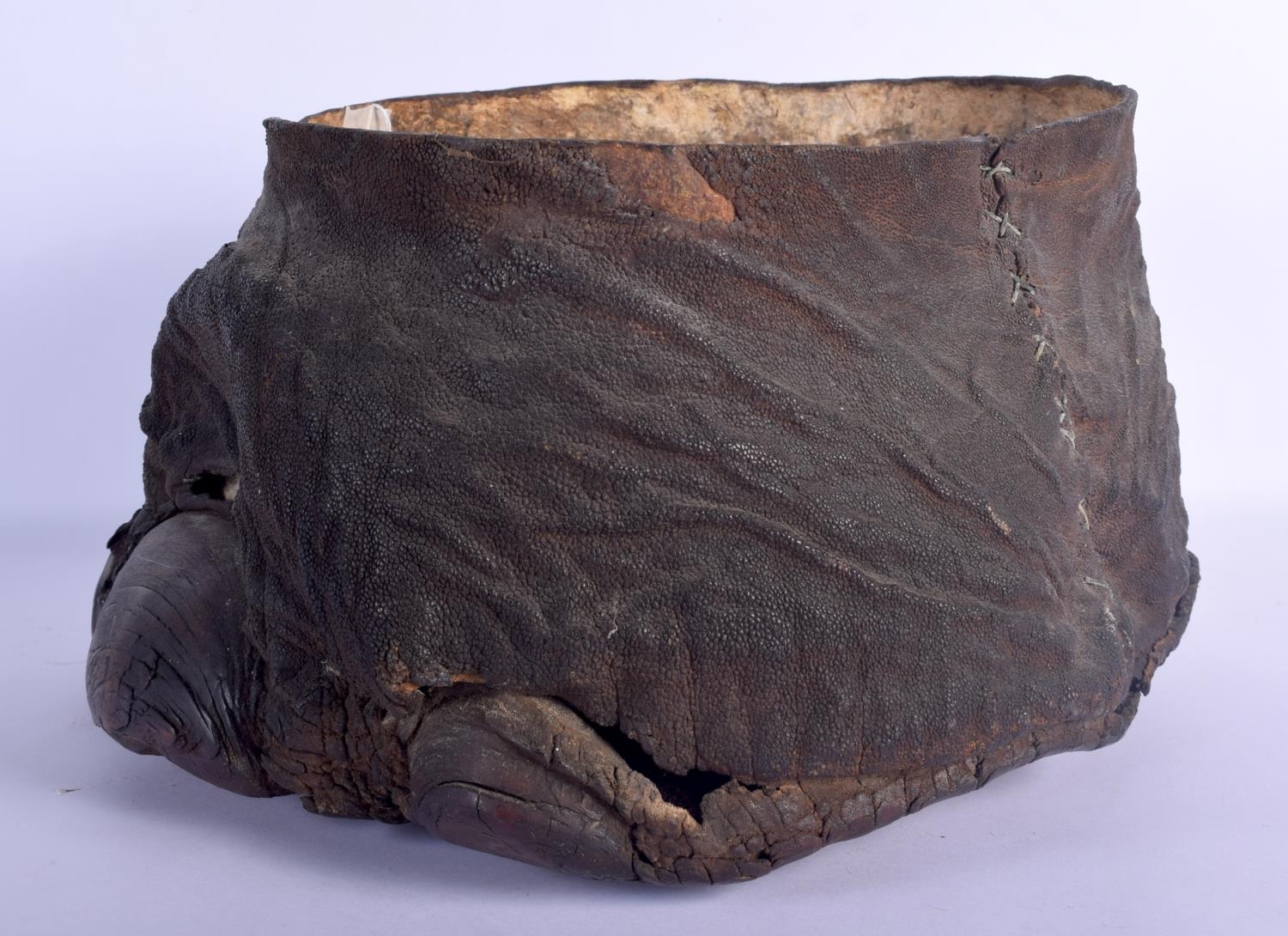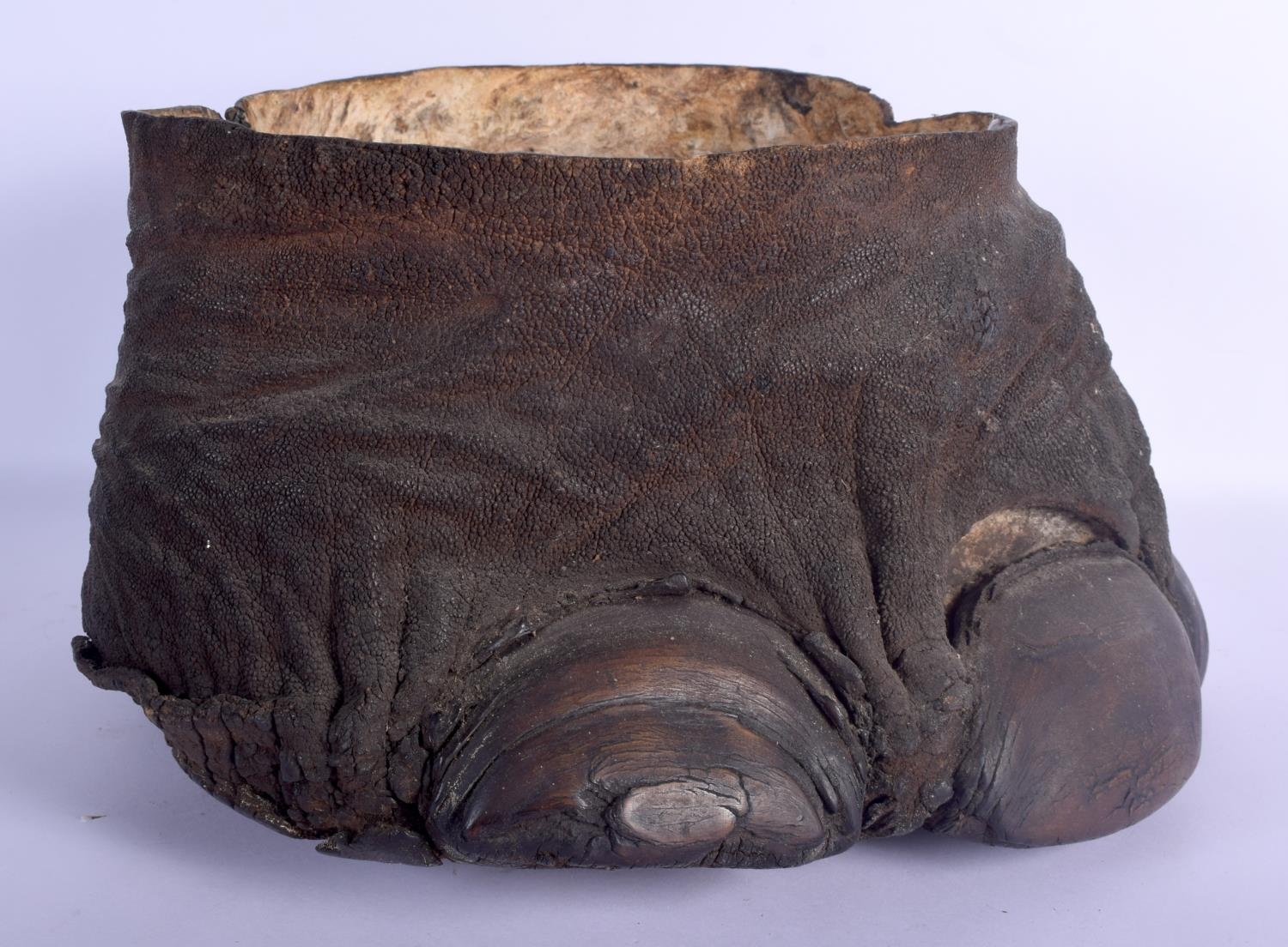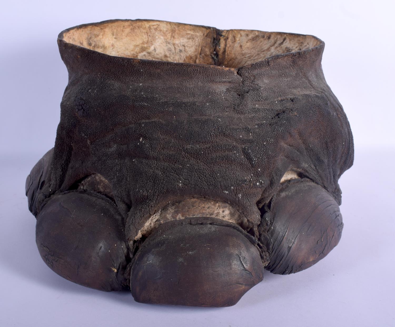 A VICTORIAN TAXIDERMY ELEPHANT FOOT PLANTER. 33 cm x 22 cm.