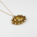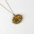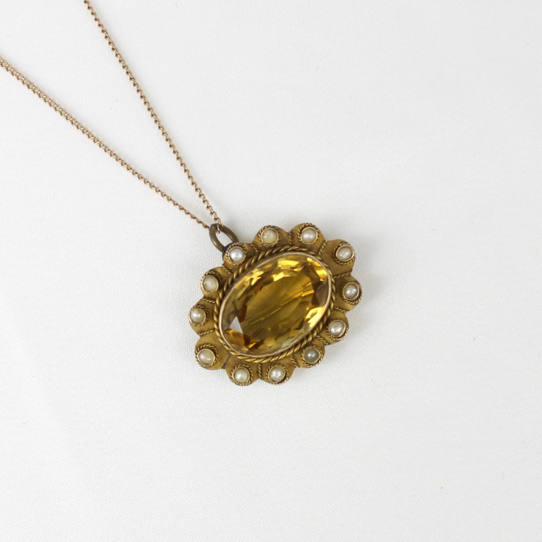 An early 20th century citrine pendant/brooch, the oval cut citrine within scalloped edged mount, set with ‘pearls’ stamped ‘AJS 9ct’ 3cm wide, upon a yellow metal trace link chain, bolt ring stamped ‘9ct’ 7gms, total citrine weight estimated 12ct