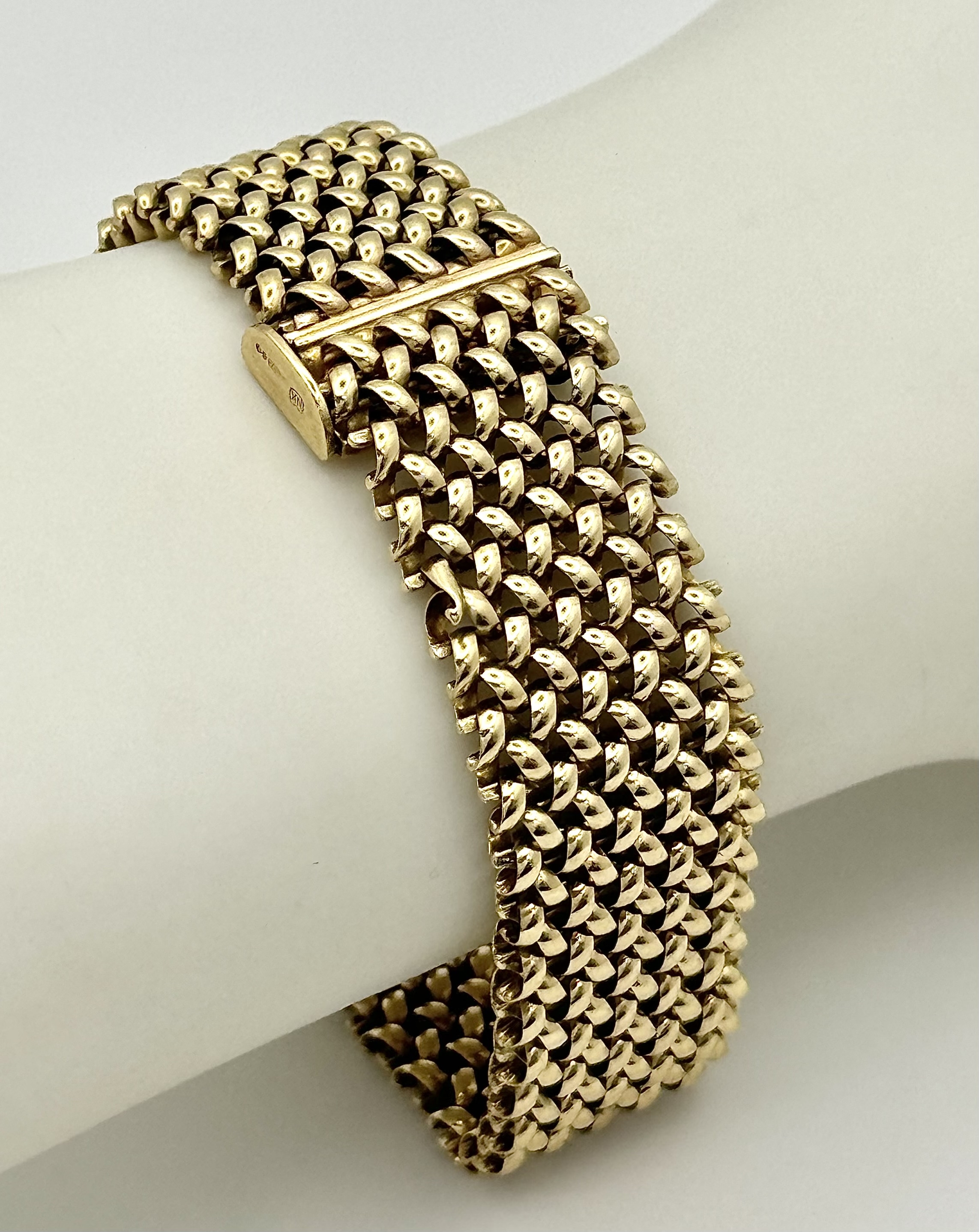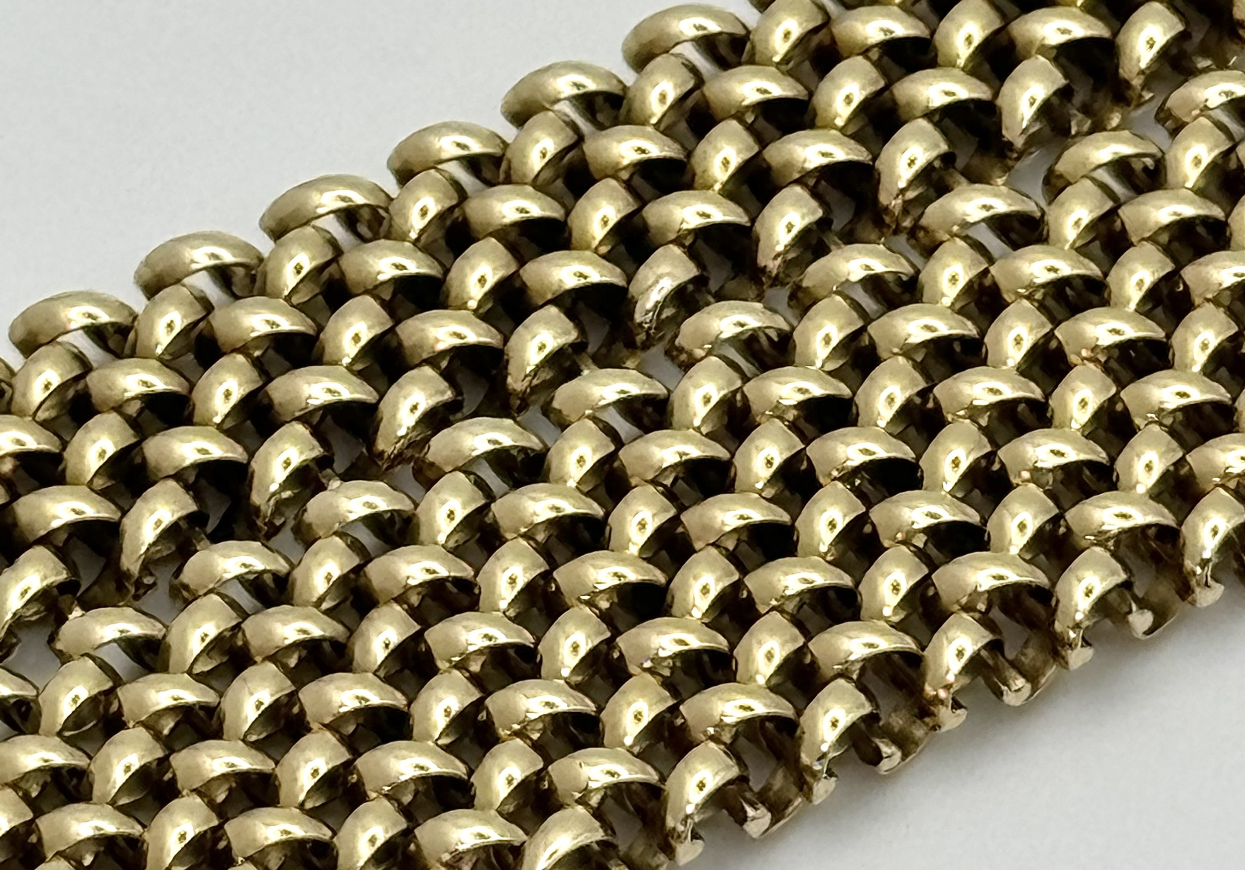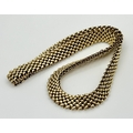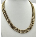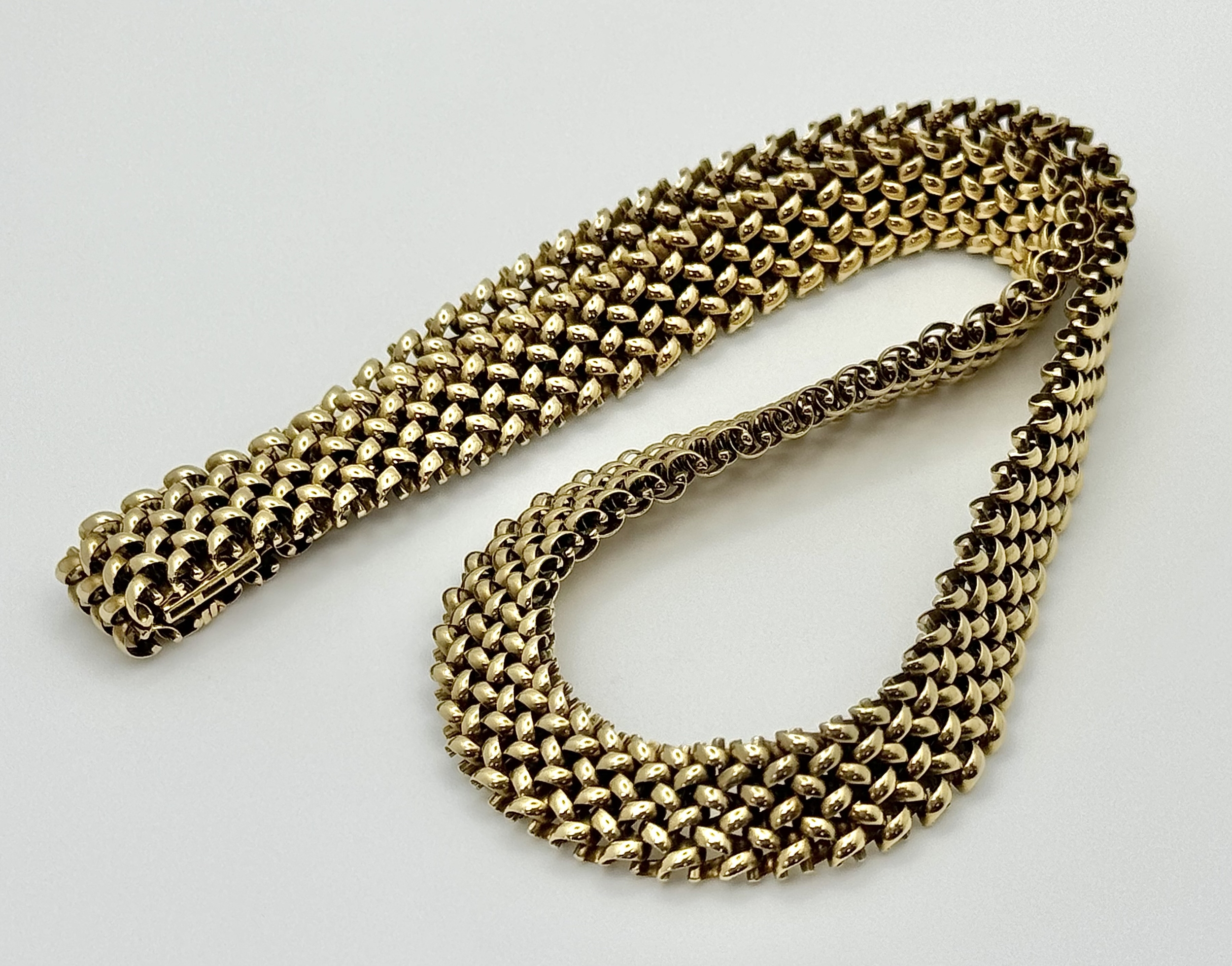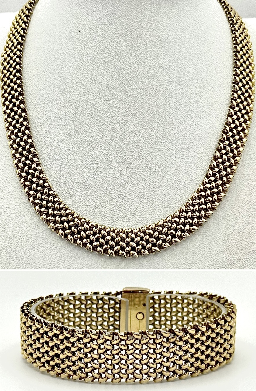 A Glamourous Vintage 9K Yellow Gold Necklace and Bracelet Set. Intricate curved links create a stunning woven effect. Necklace - 11mm width, 42cm length - 43.5g. Bracelet - 17mm width, 18.5cm length - 31g. Total weight - 74.5g. Both items have sturdy push clasps and are in very good wearable condition.