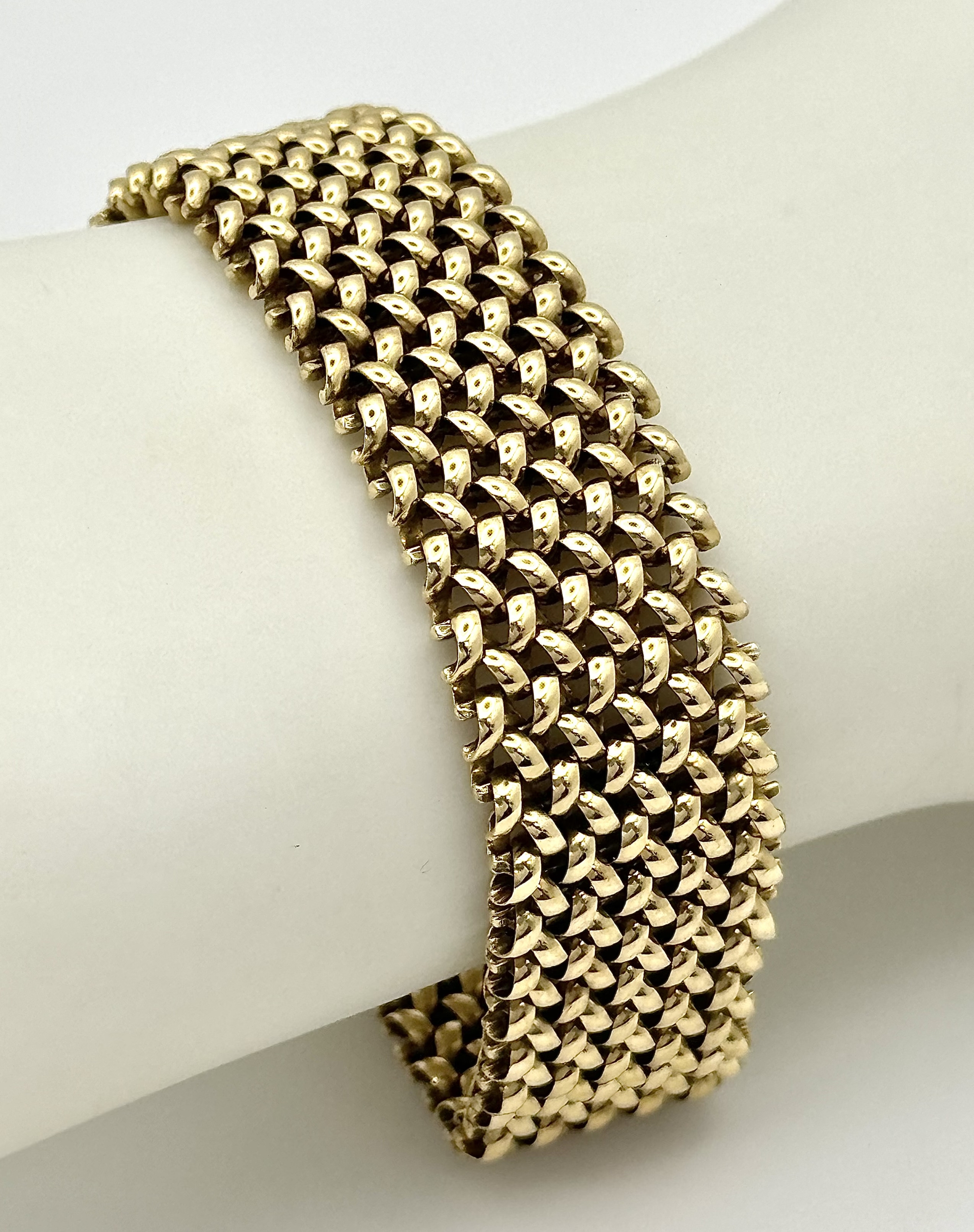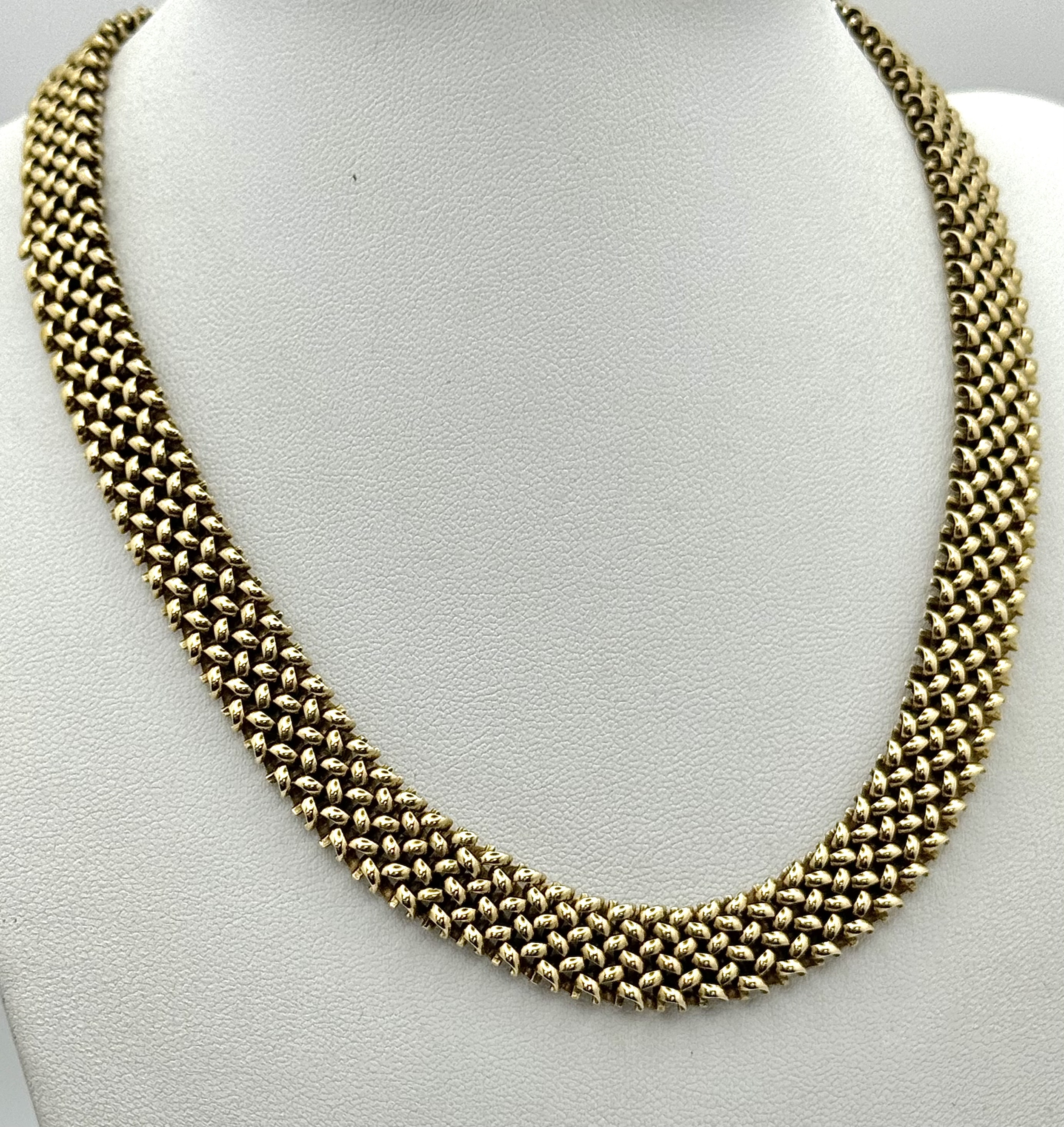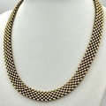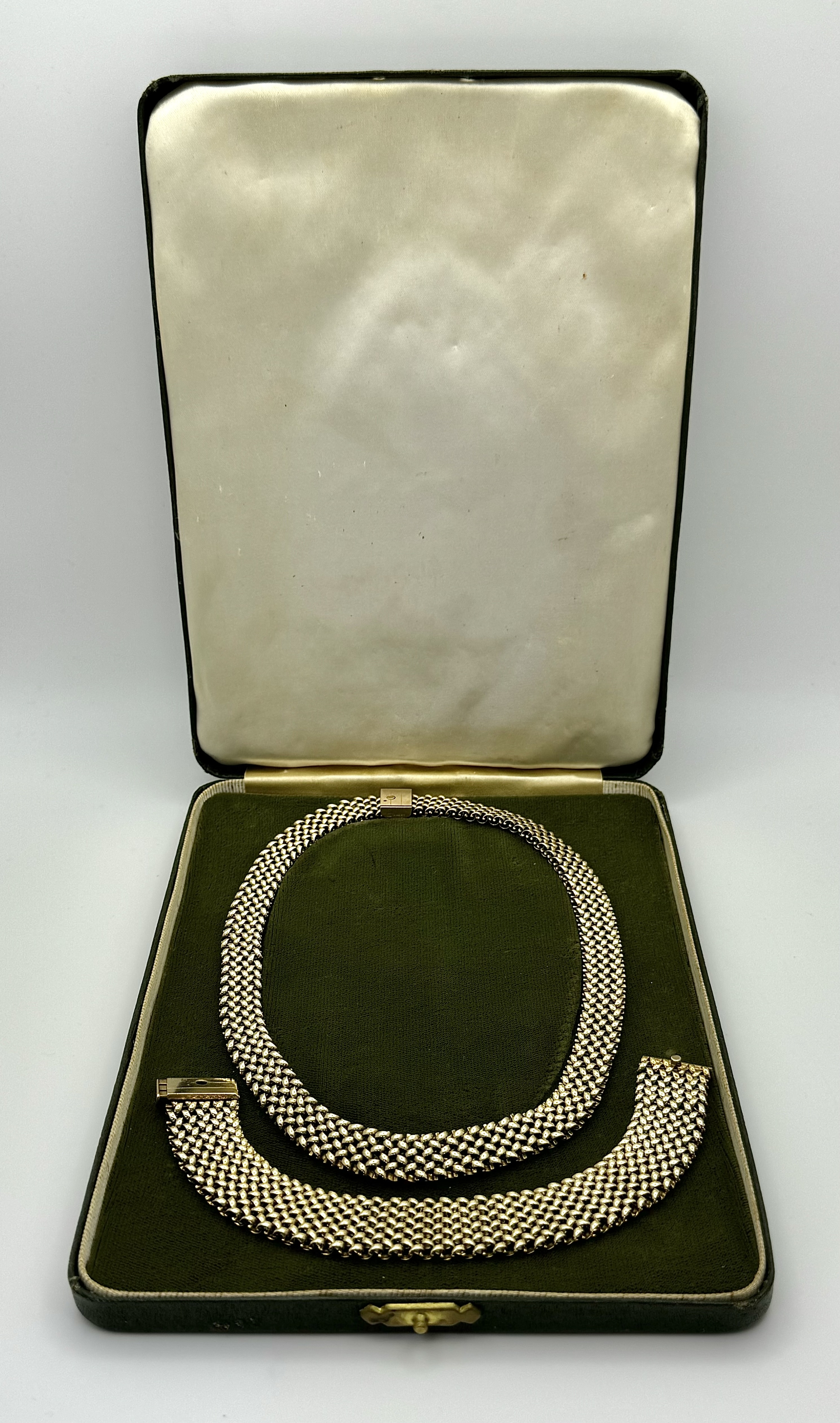 A Glamourous Vintage 9K Yellow Gold Necklace and Bracelet Set. Intricate curved links create a stunning woven effect. Necklace - 11mm width, 42cm length - 43.5g. Bracelet - 17mm width, 18.5cm length - 31g. Total weight - 74.5g. Both items have sturdy push clasps and are in very good wearable condition.