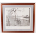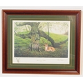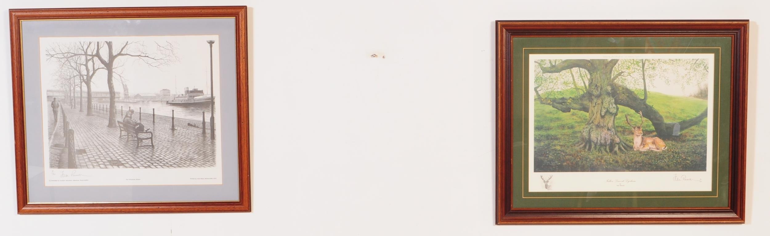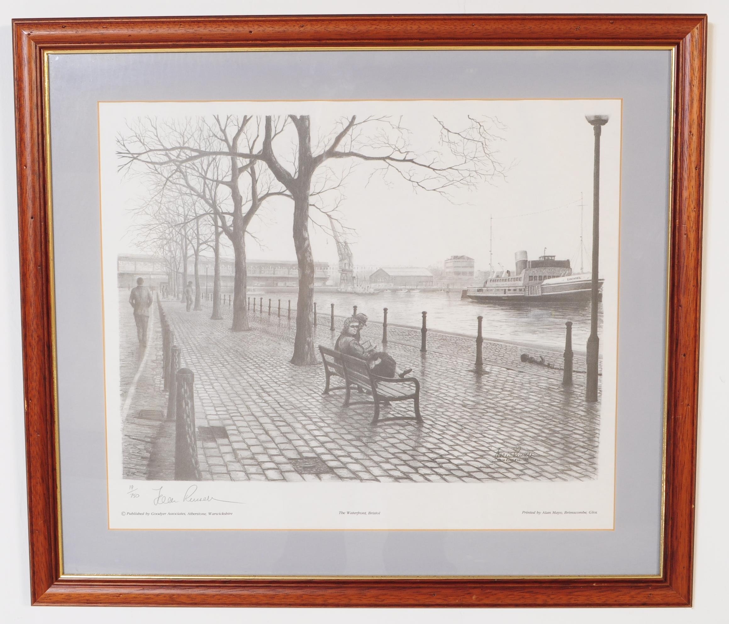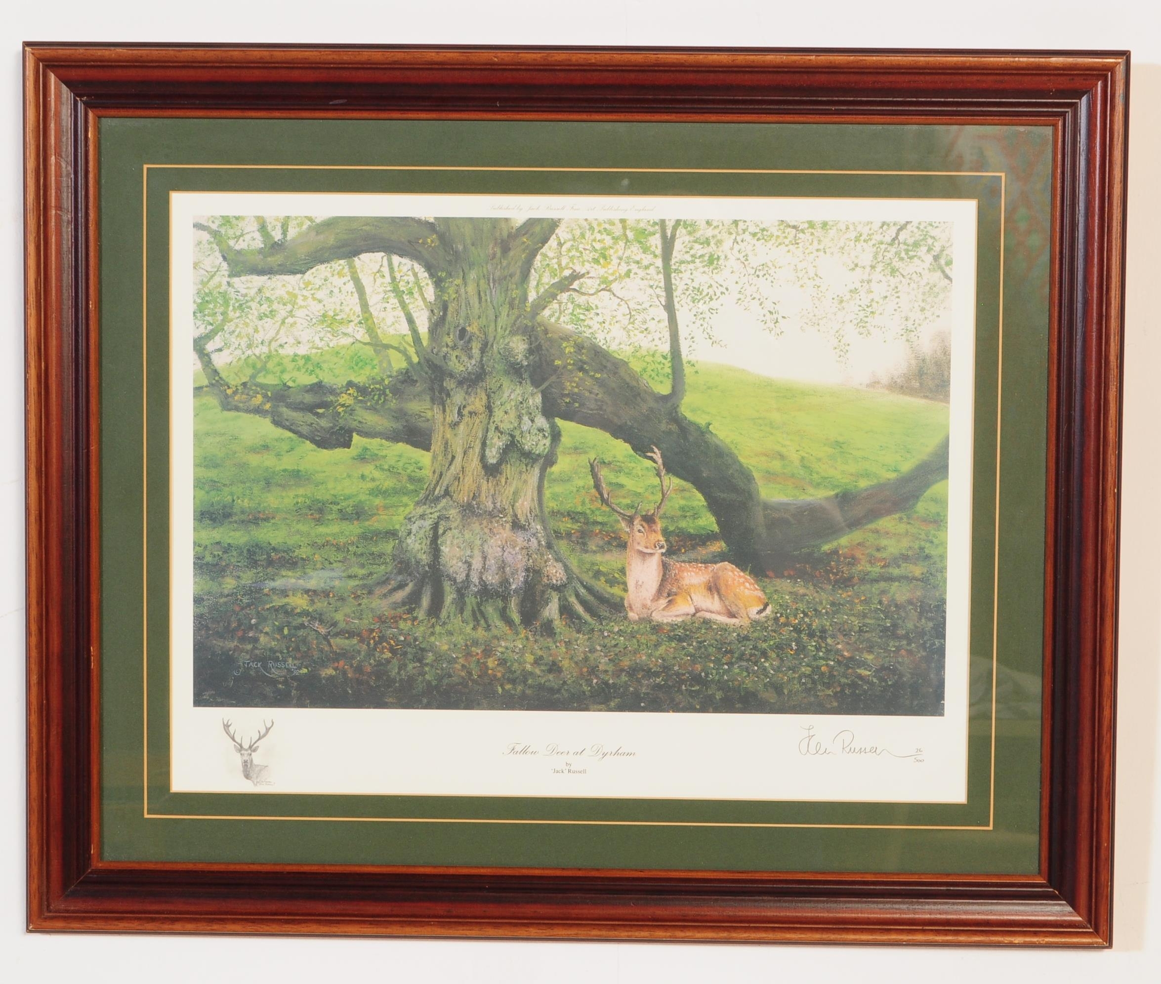 Two mid 20th century prints by Jack Russell - One titled 'The Waterfront, Bristol. The other 'Fallow deer at Dyrham', limited edition signed print. 26 / 500. Published by Goodyer associates, Atherstone, Warwickshire. Both framed and glazed, largest measures approx. 55cm x 62cm