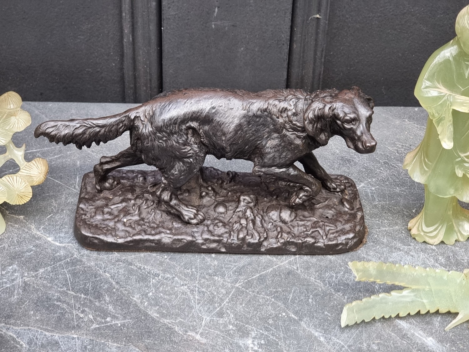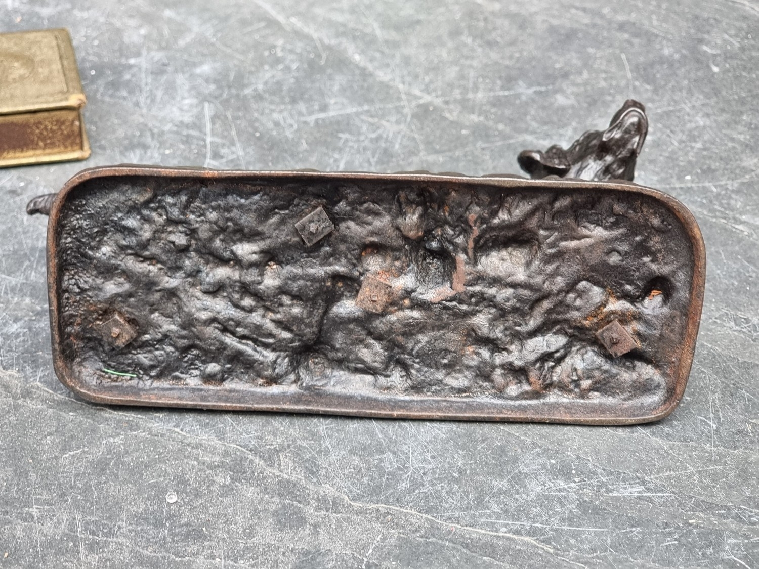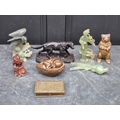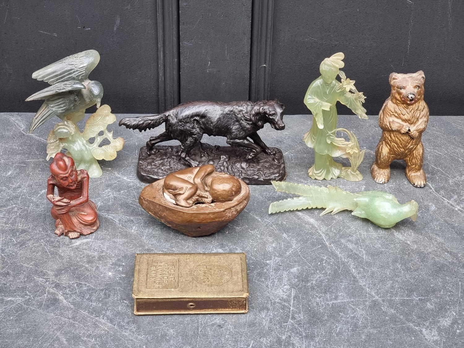A mixed lot, to include: a cast iron hound, 21cm long; a Japanese carved wood figure, 10cm high; Chinese soapstone; and others, (s.d. to one). (8)