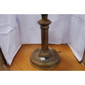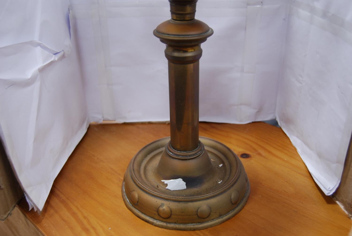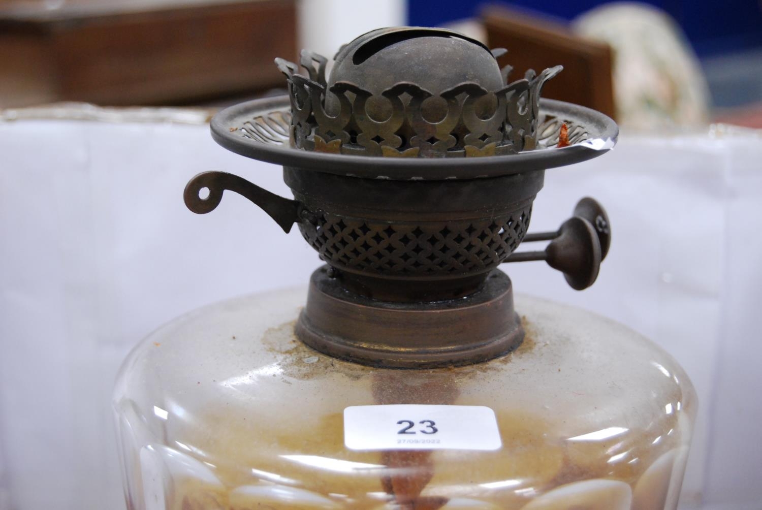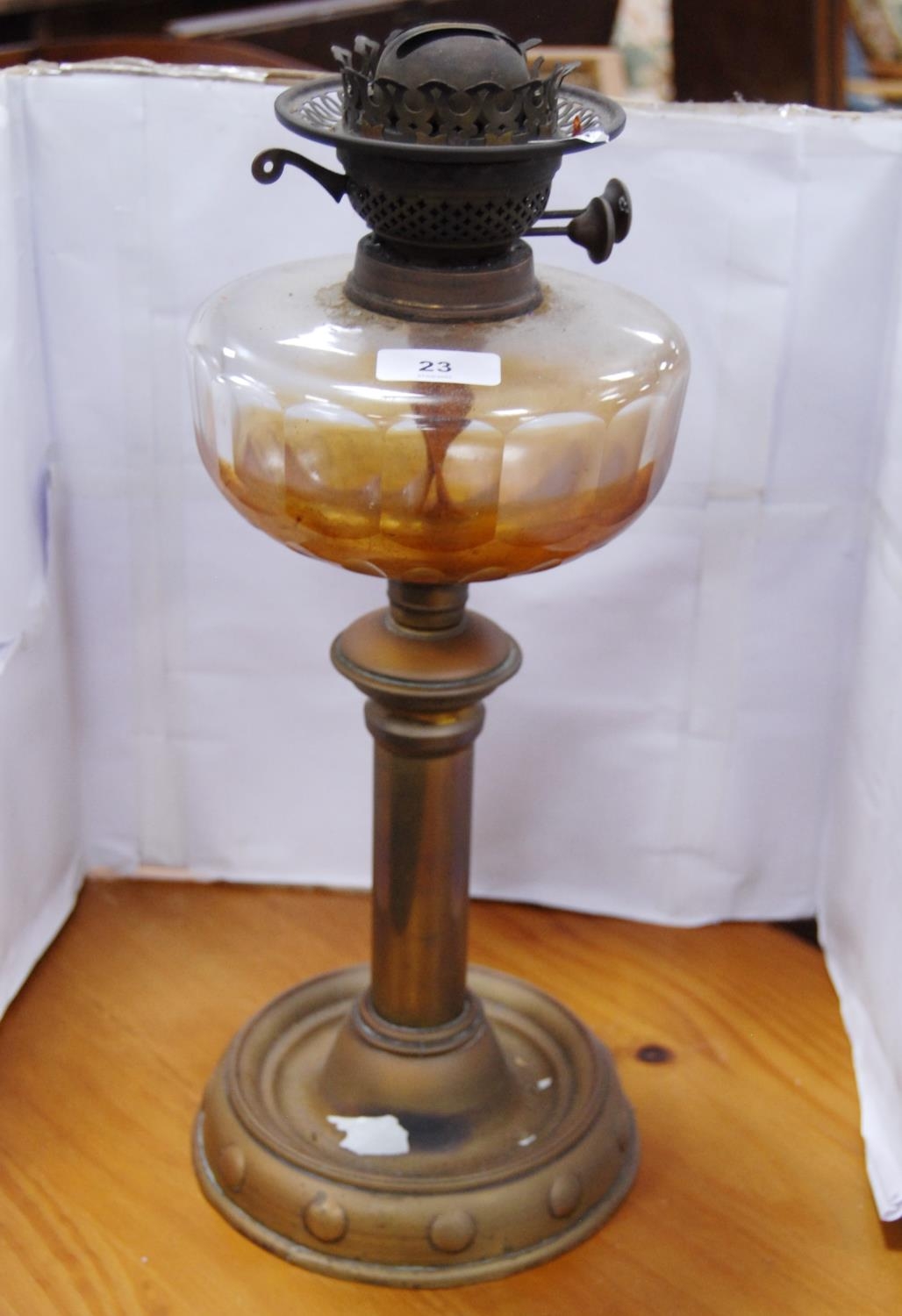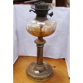 Brass-mounted oil lamp with amber-coloured glass reservoir.