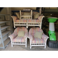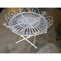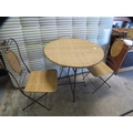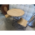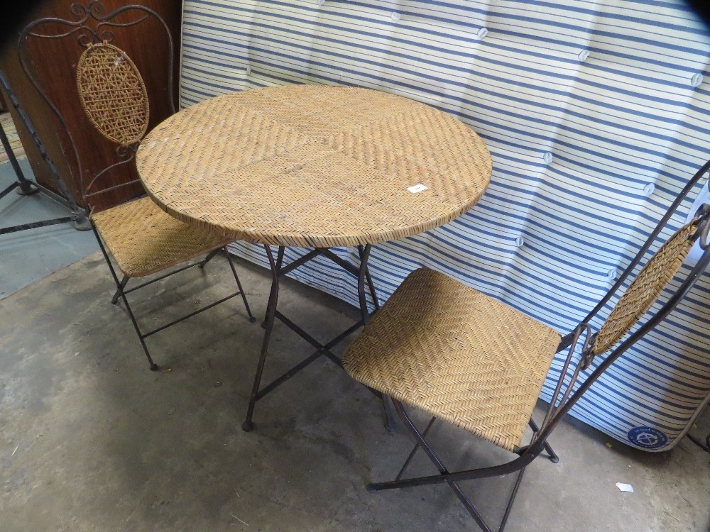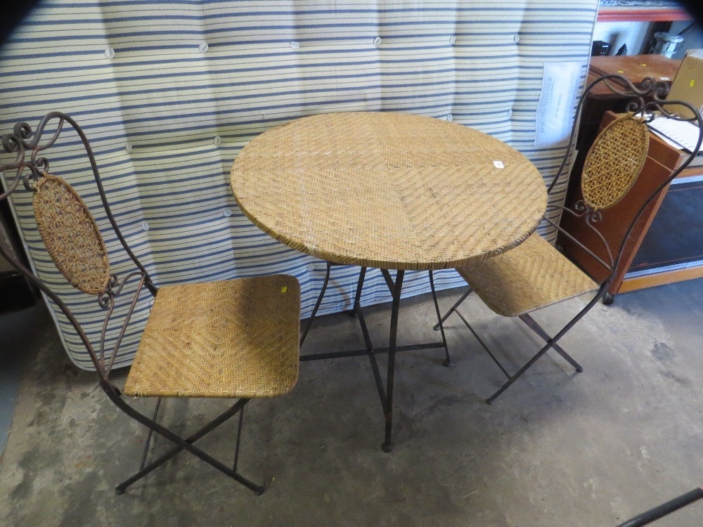 A wrought iron and wicker folding patio garden set comprising a table and two chairs