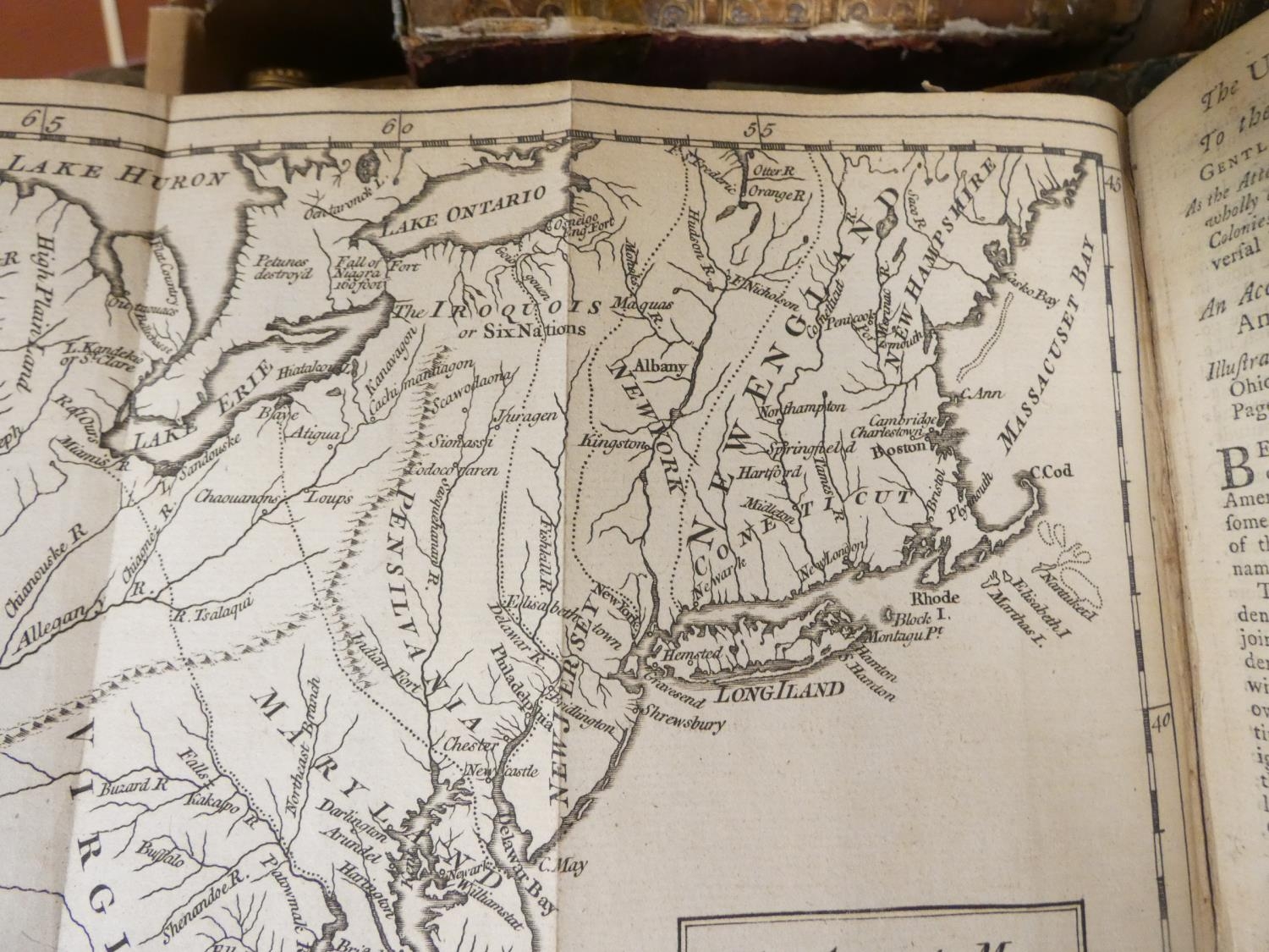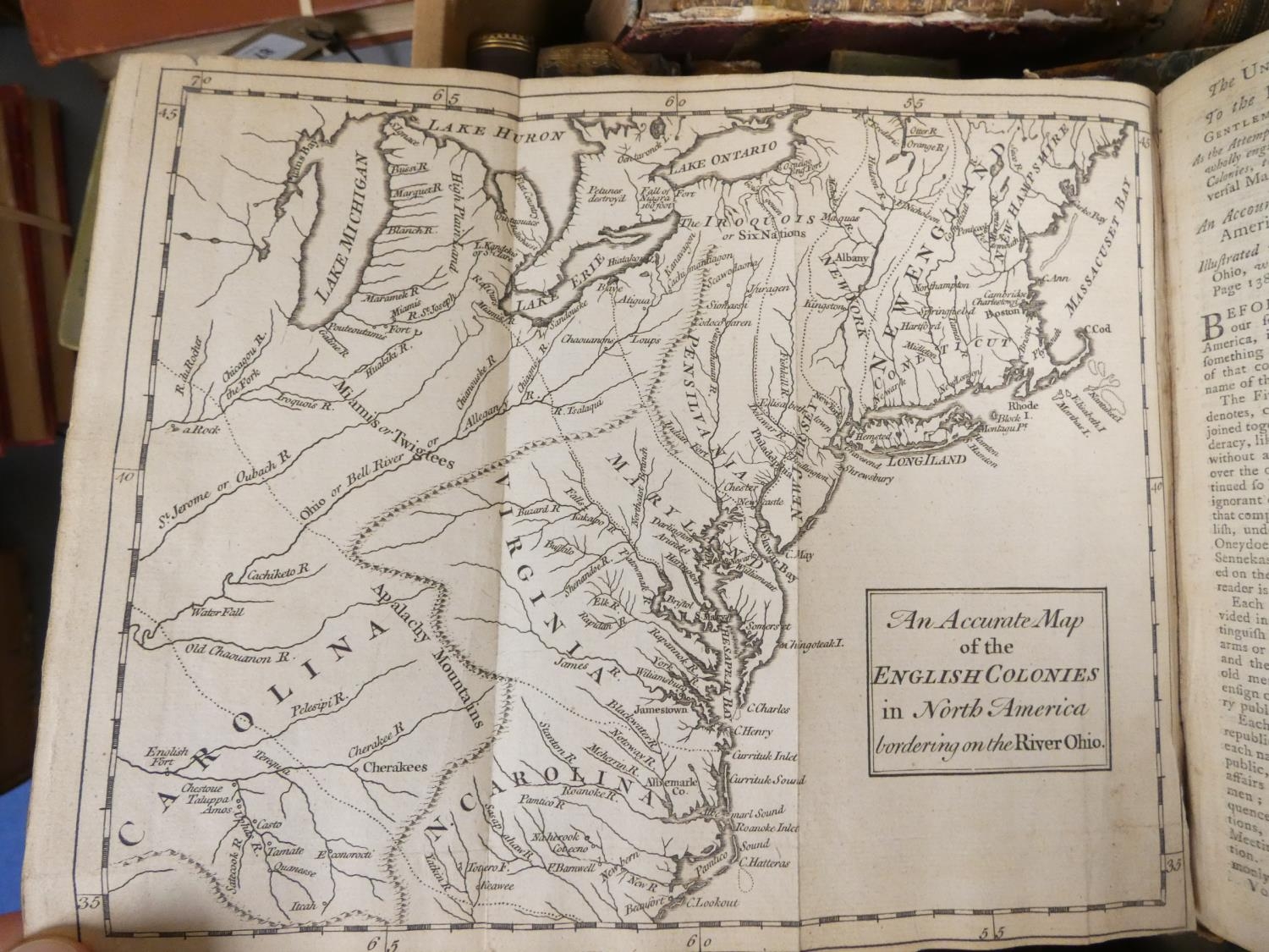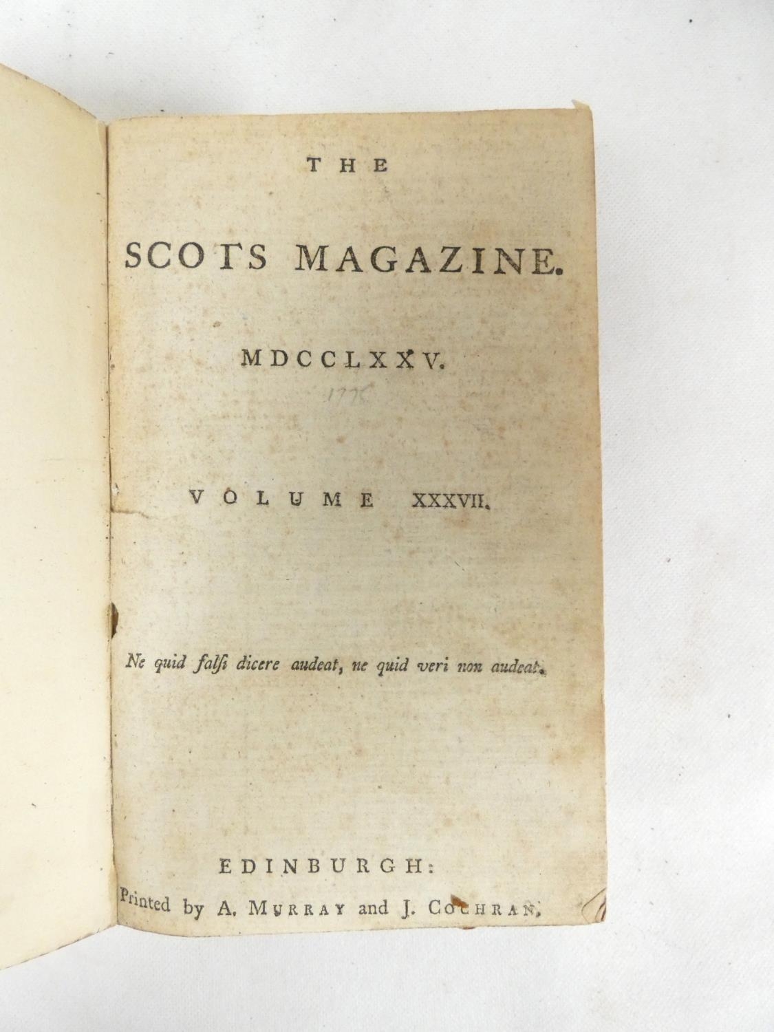 THE SCOTS MAGAZINE. Bound vol. 37. Fldg. eng. map of Thirty-miles round Boston. Poor bdg., brds. det. but present. 1775; also The Universal Magazine of Knowledge & Pleasure, vol. 15, poor cond. but includes eng. map of the English Colonies in North America Bordering on the River Ohio, 1754 & The Annual Register for the Year 1763. All in poor cond. & sold as seen. (3).