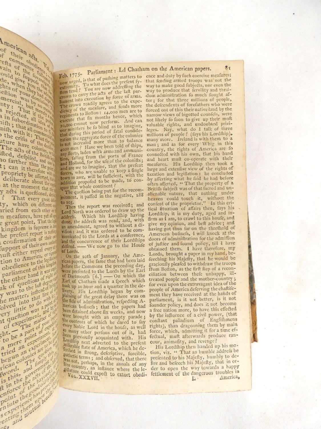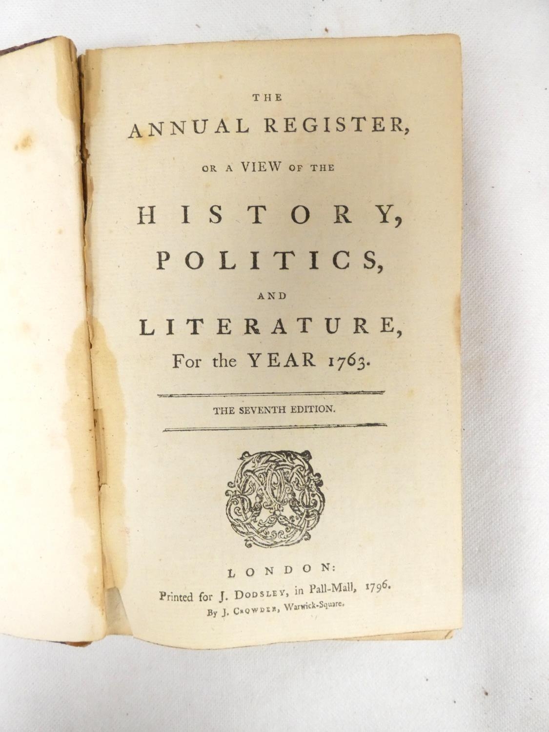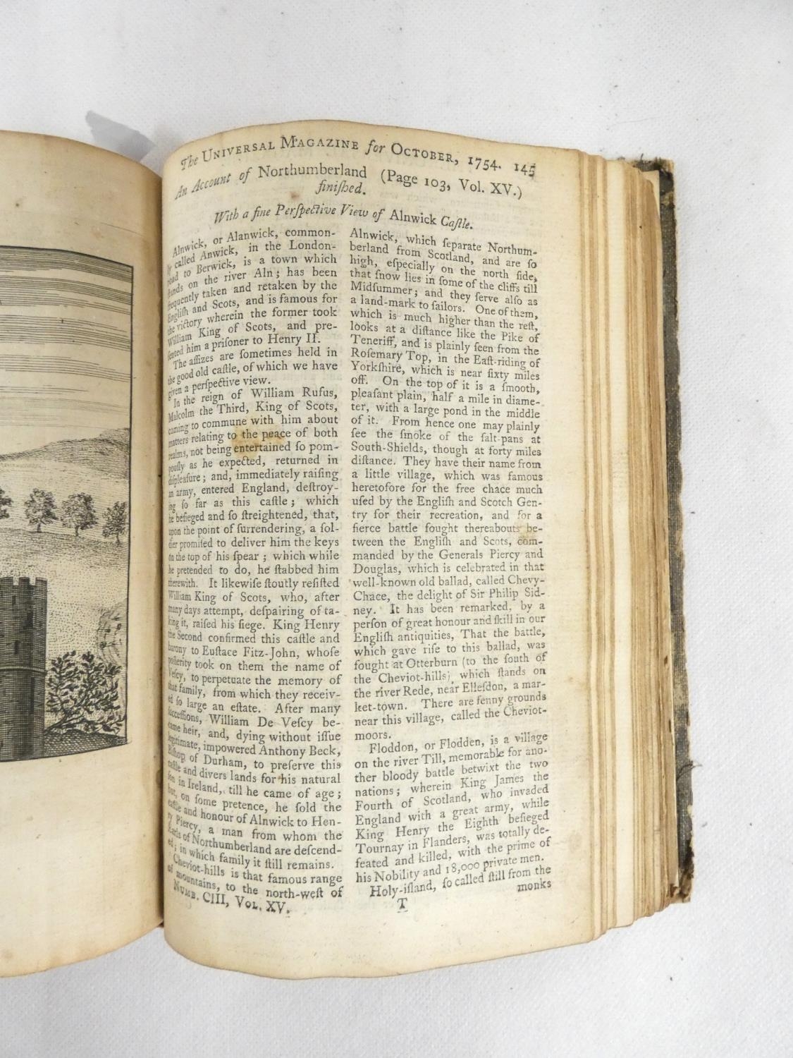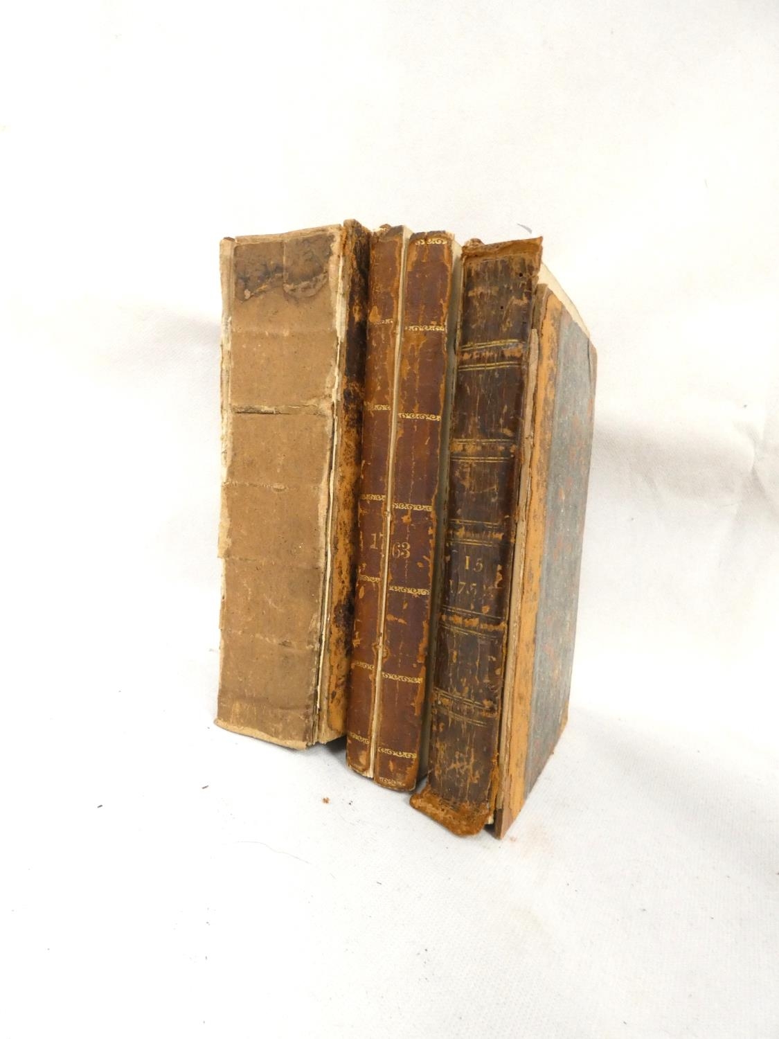 THE SCOTS MAGAZINE. Bound vol. 37. Fldg. eng. map of Thirty-miles round Boston. Poor bdg., brds. det. but present. 1775; also The Universal Magazine of Knowledge & Pleasure, vol. 15, poor cond. but includes eng. map of the English Colonies in North America Bordering on the River Ohio, 1754 & The Annual Register for the Year 1763. All in poor cond. & sold as seen. (3).