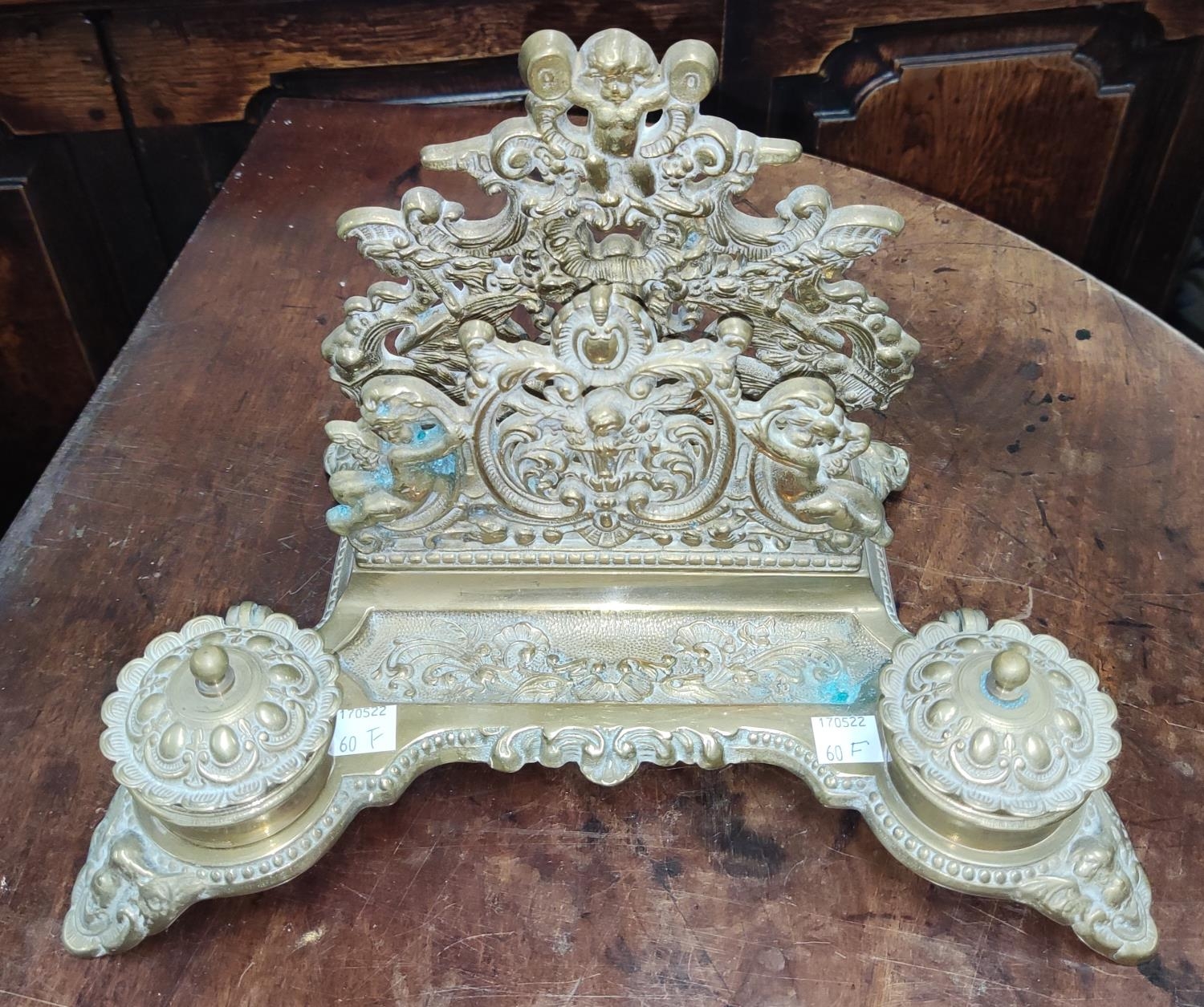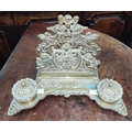 A brass letter rack desk organiser with two inkwells or candle holders, 30cm