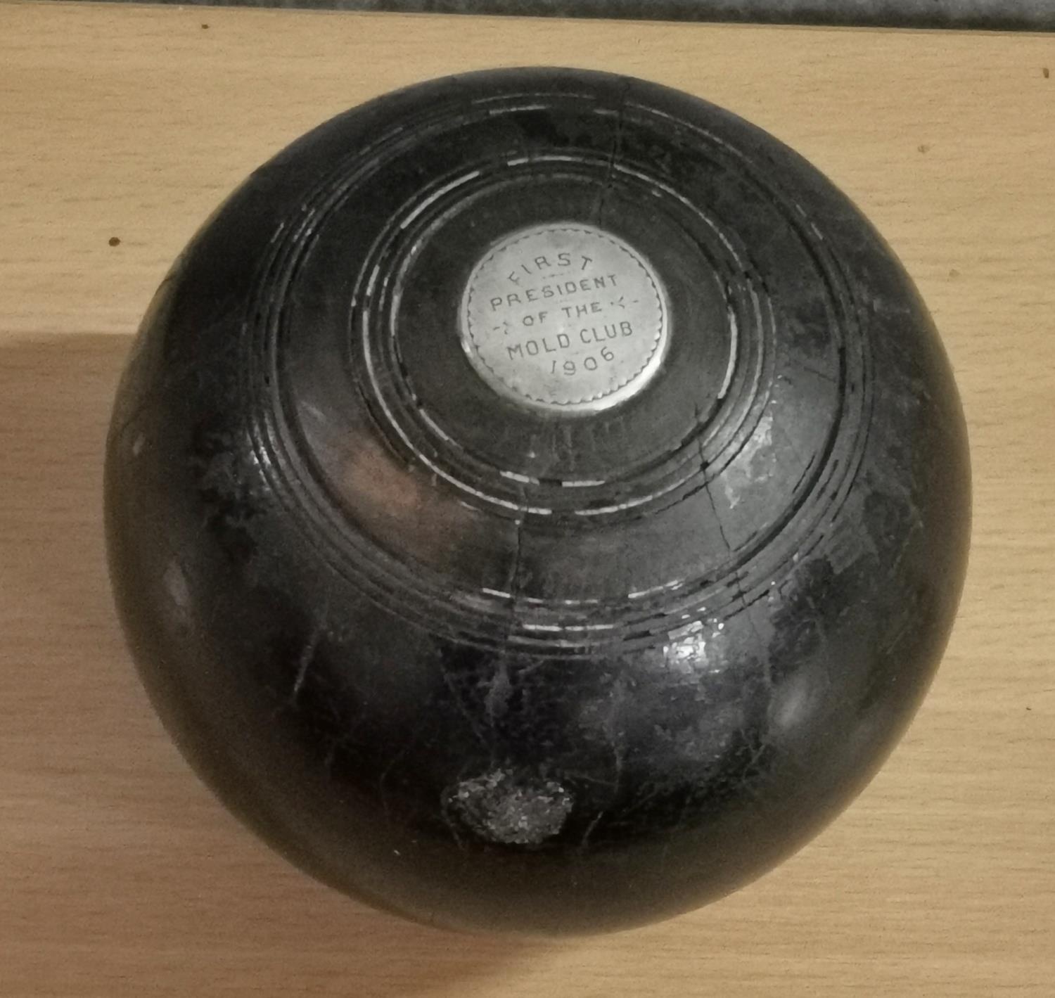 Old bowling ball with engraved and inset silver plaques to Dr Trubshaw 1905 Mold club first president
