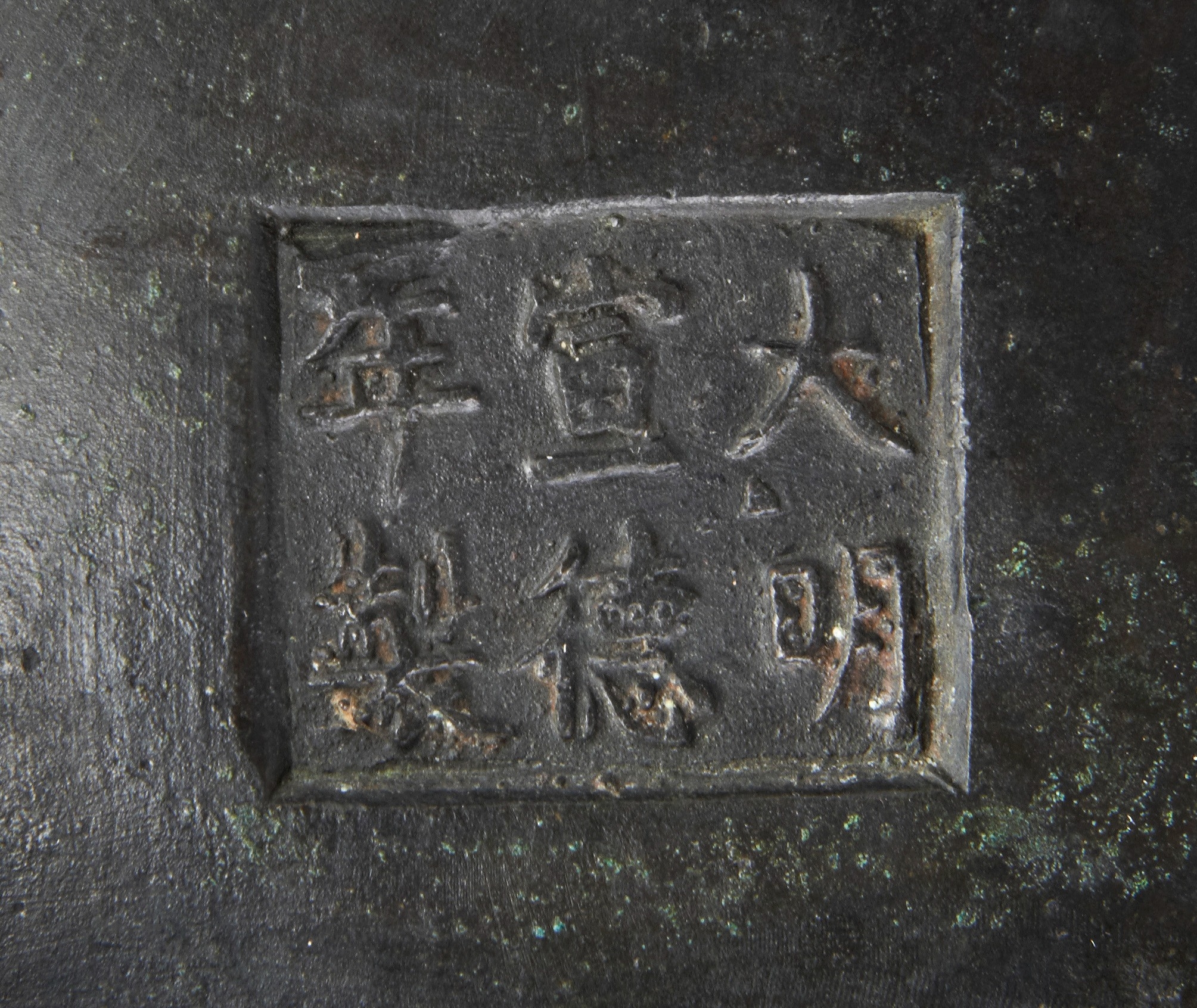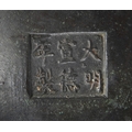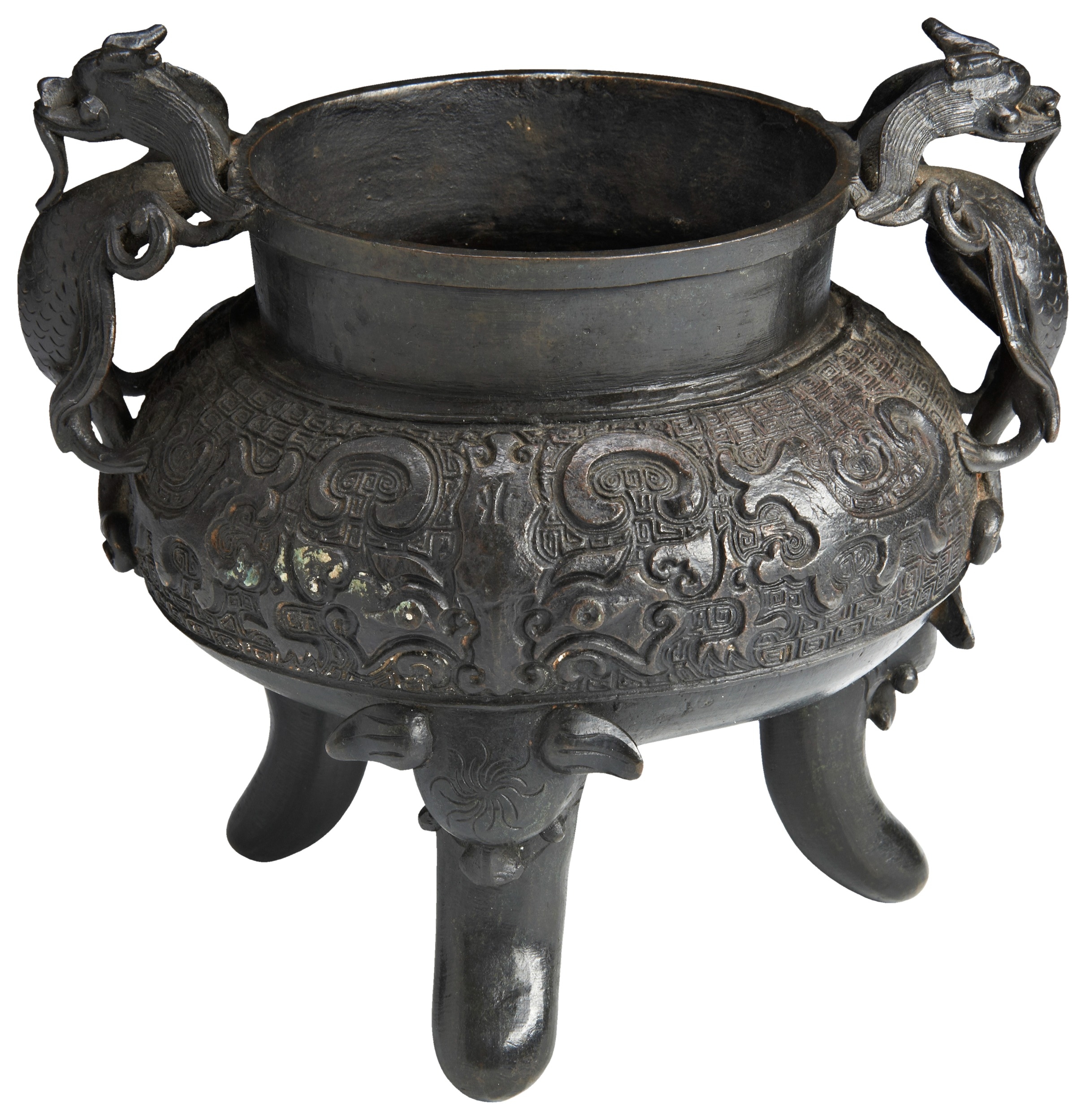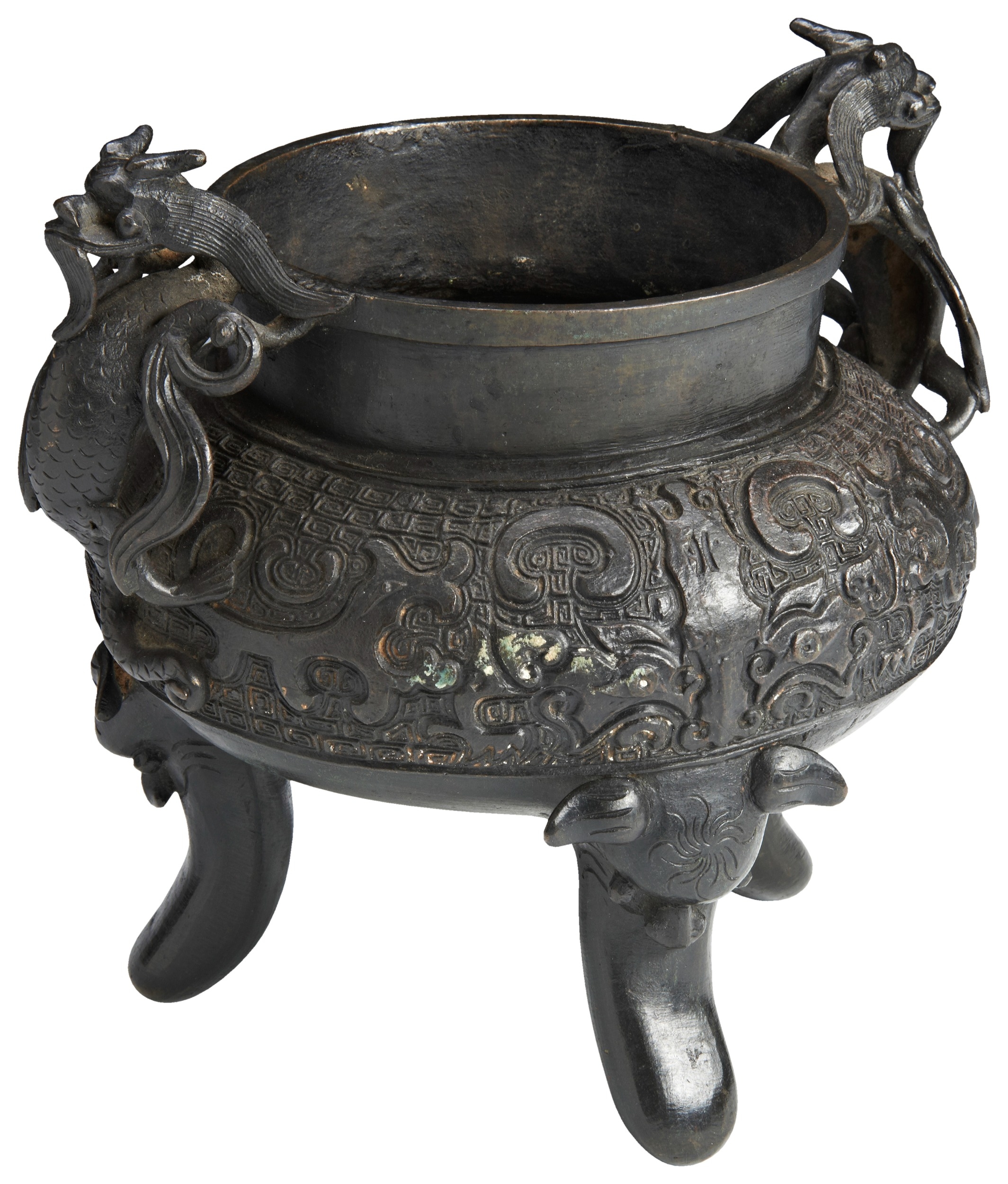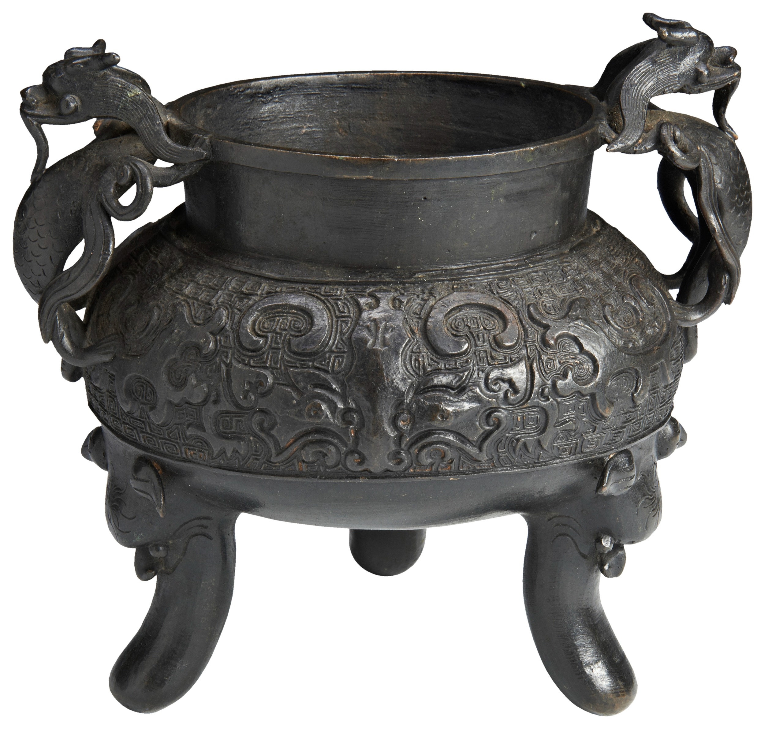 of compressed globular form, the sides cast in relief with stylised taotie masks and dragons, applied with two well cast dragon handles, all raised on three lions mask cast feet, apocryphal Xuande character mark