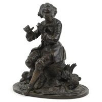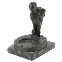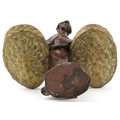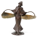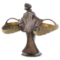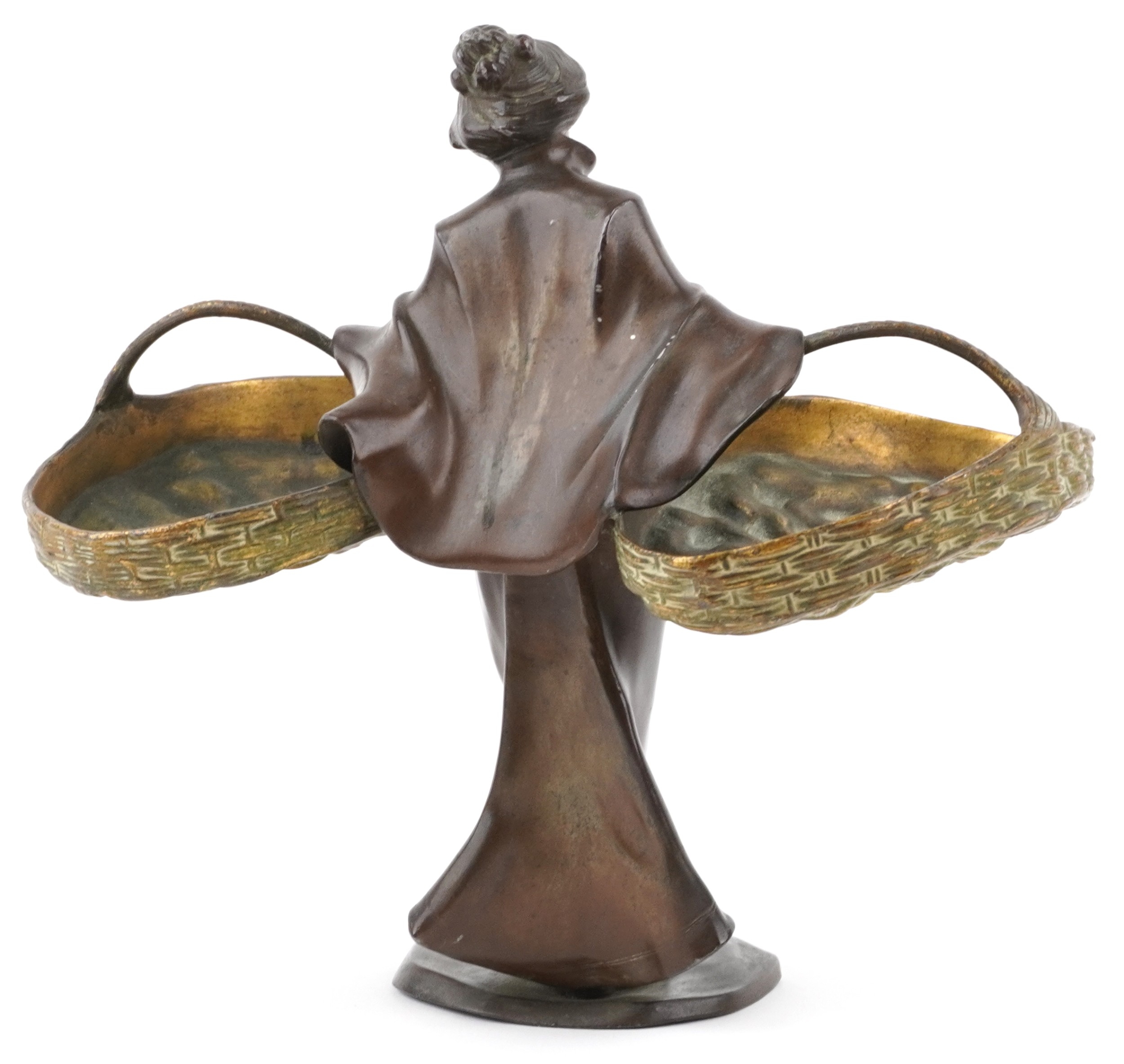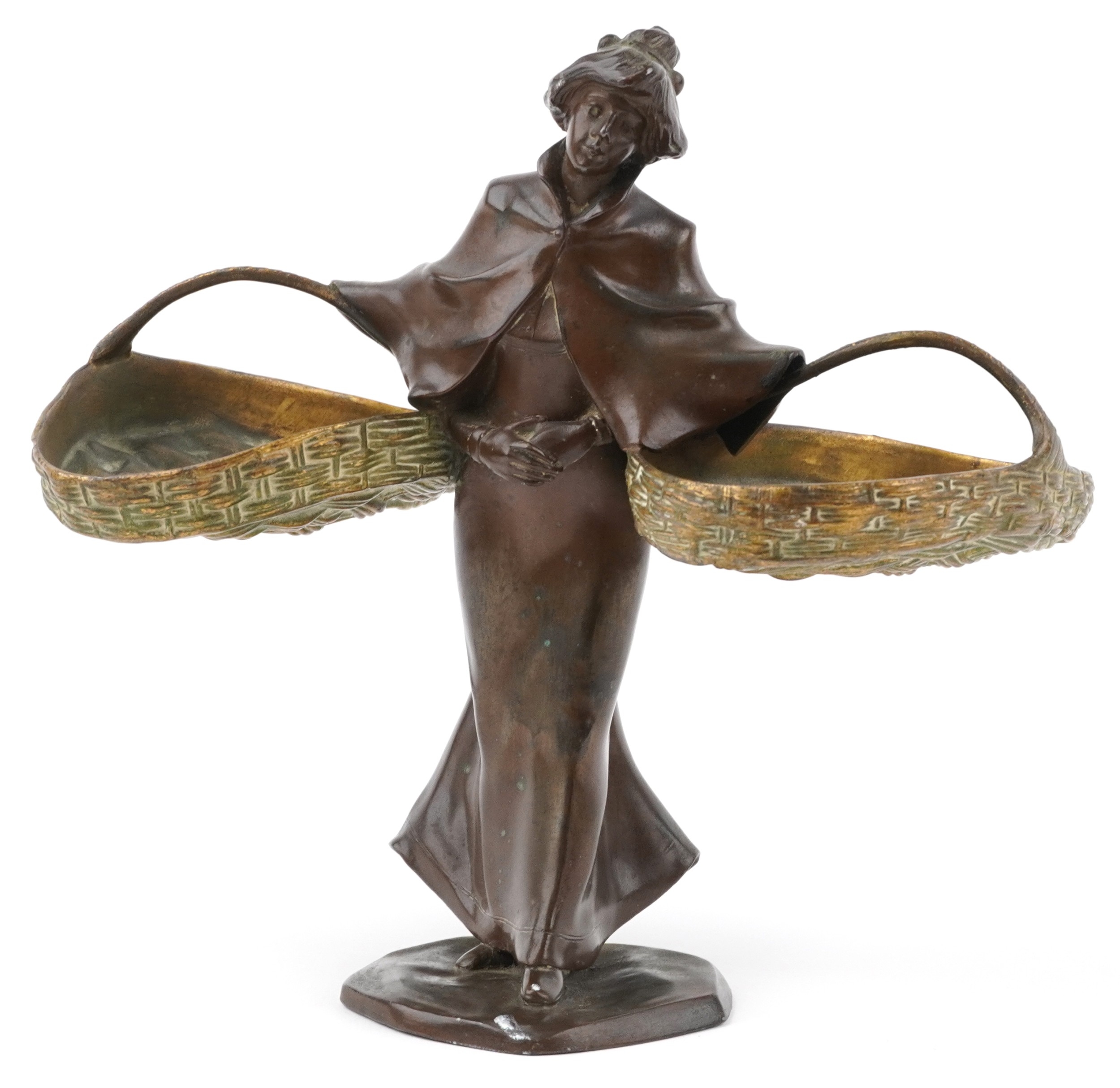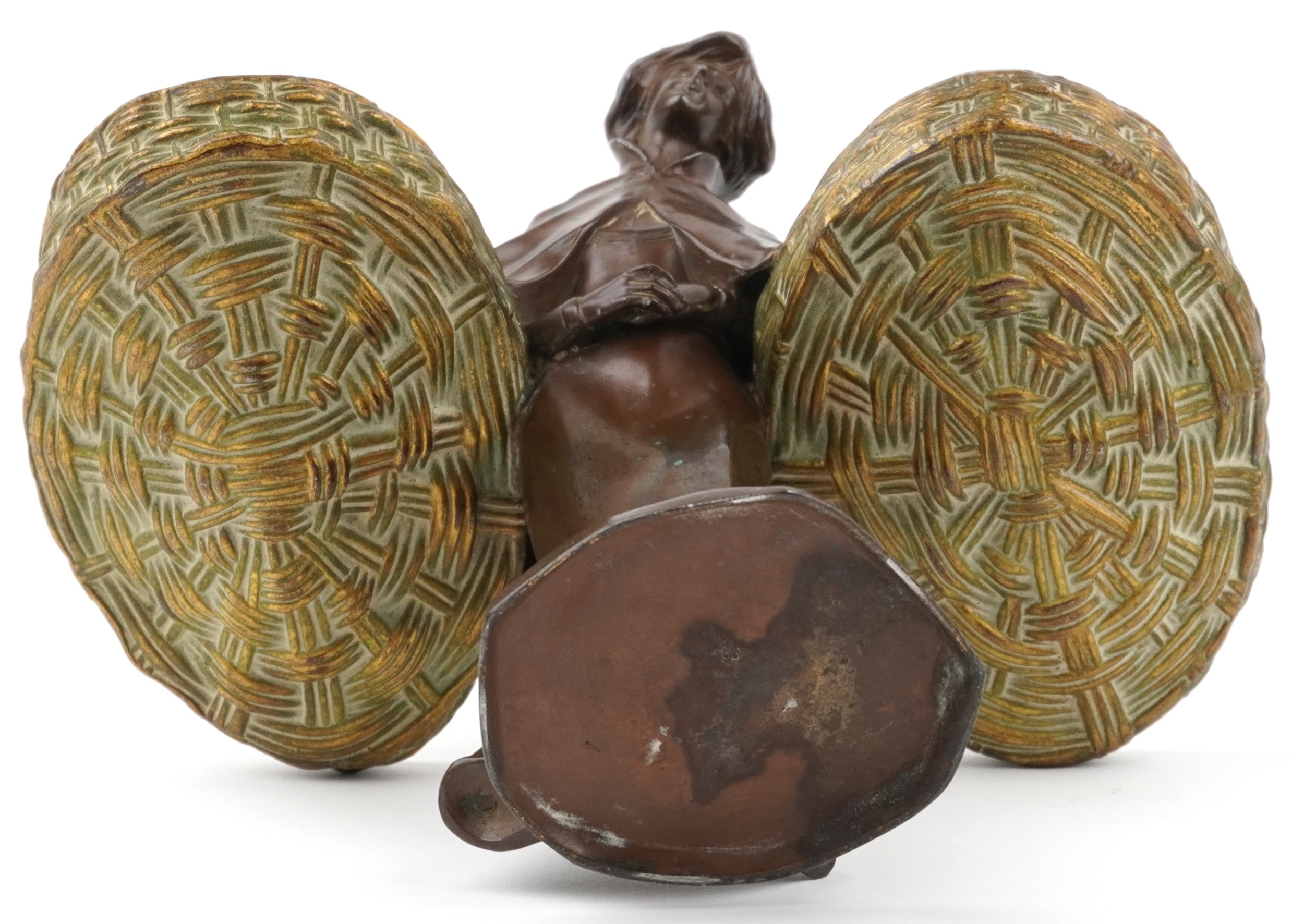 An early 20th century brown patinated bronze figure of a lady carrying two large baskets, unsigned, 22cm high.