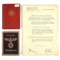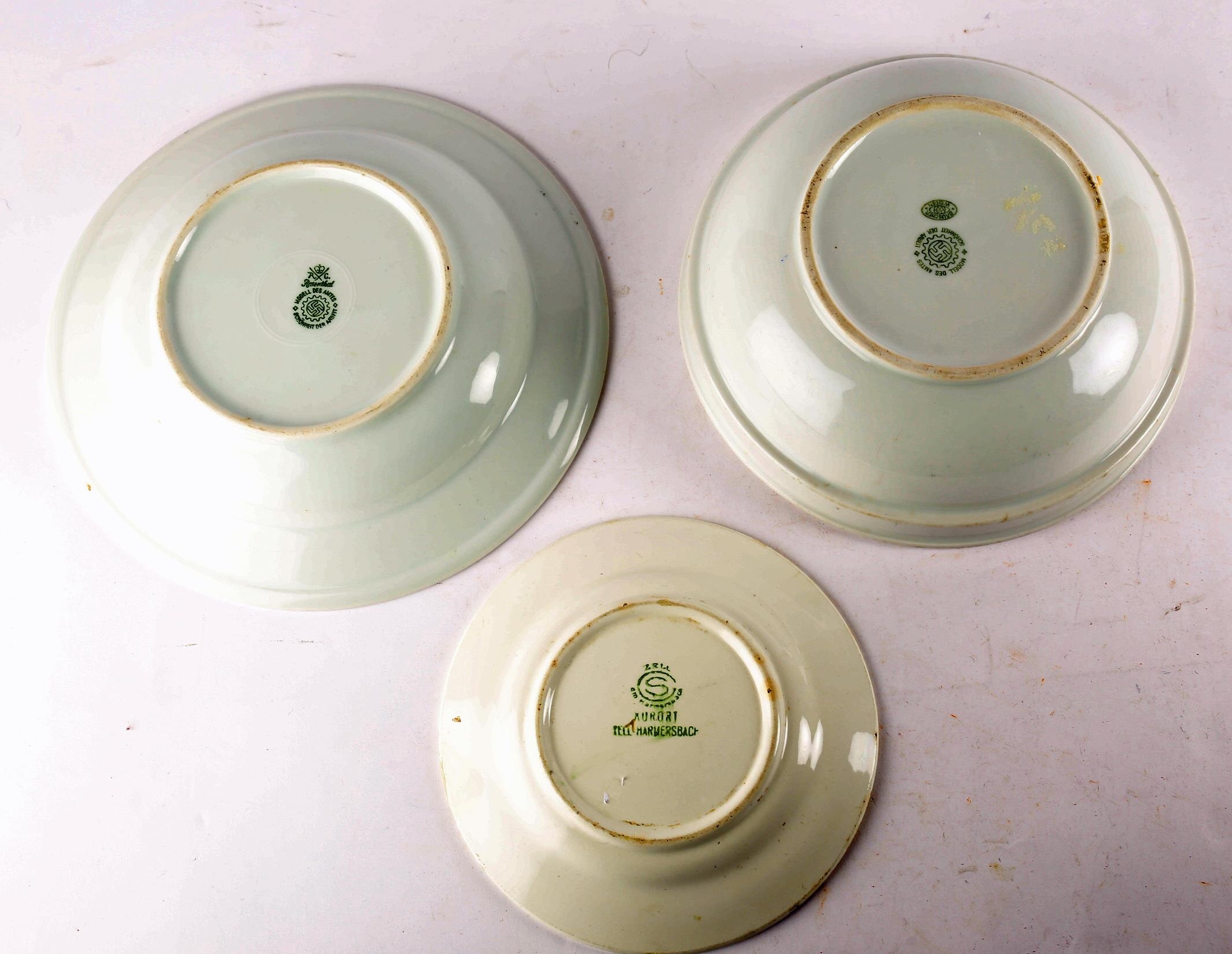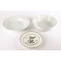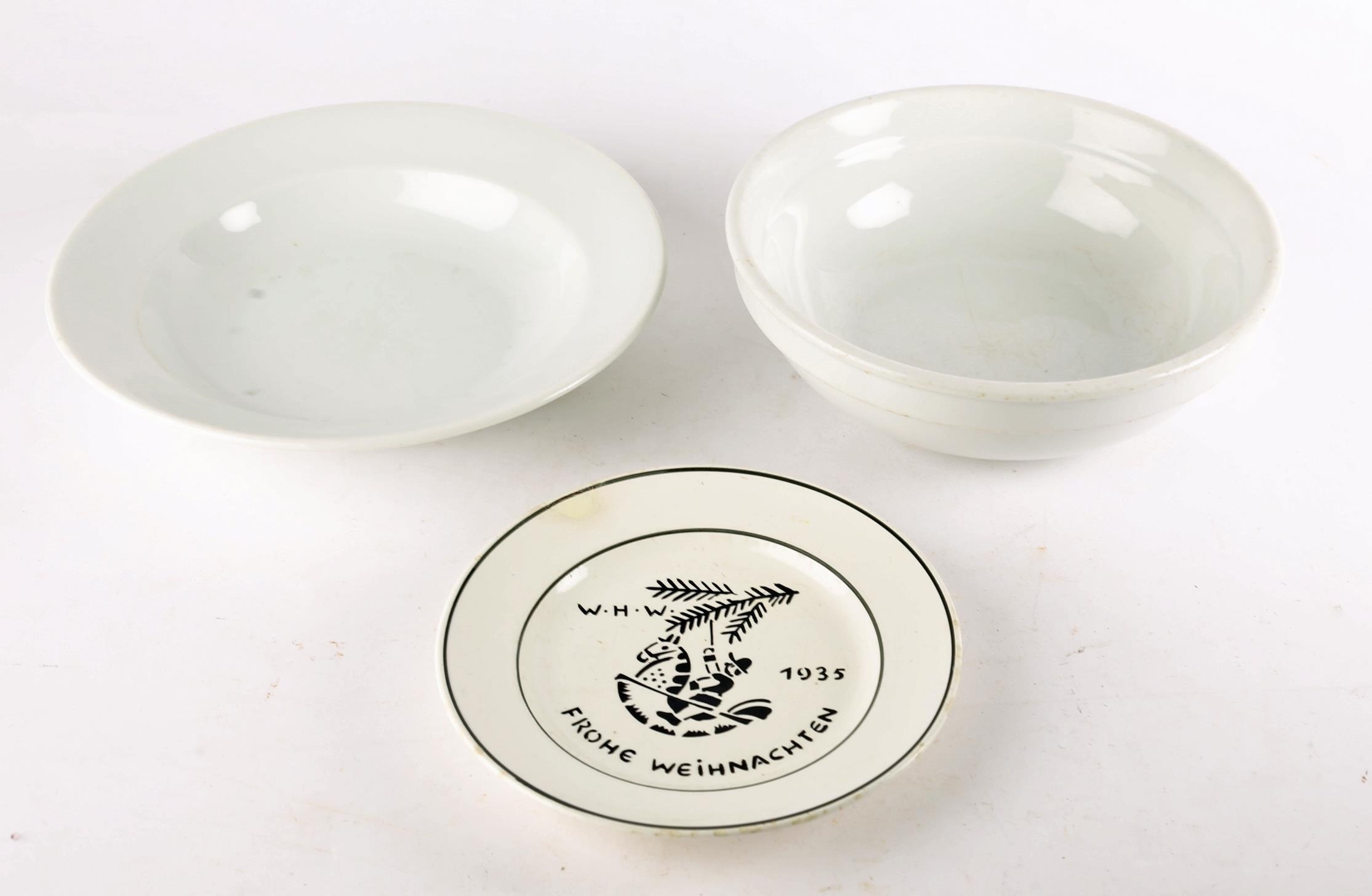 1933-45 Germany, ceramic bowls. A white stoneware bowl by Bauscher, Weiden with underglaze swastika; a white stoneware bowl by Rosenthal with underglaze swastika; and a 1935 WHW Frohe Weihnachten plate. (3)