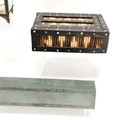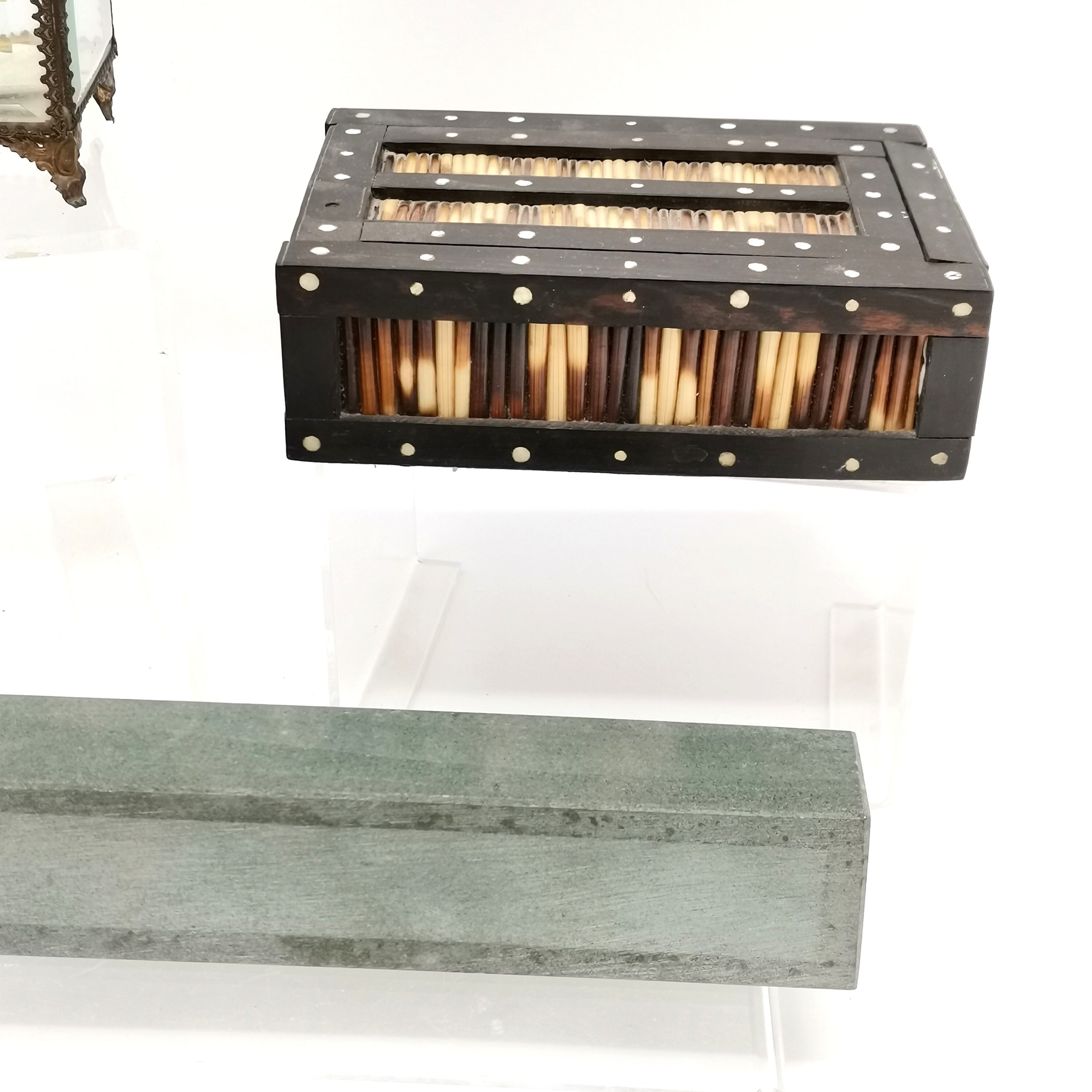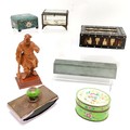 Qty of misc inc 2 x Chinese enamel boxes (slight loss to hinge lidded box), Oriental carved figure (18cm), continental glass trinket box, quill box etc