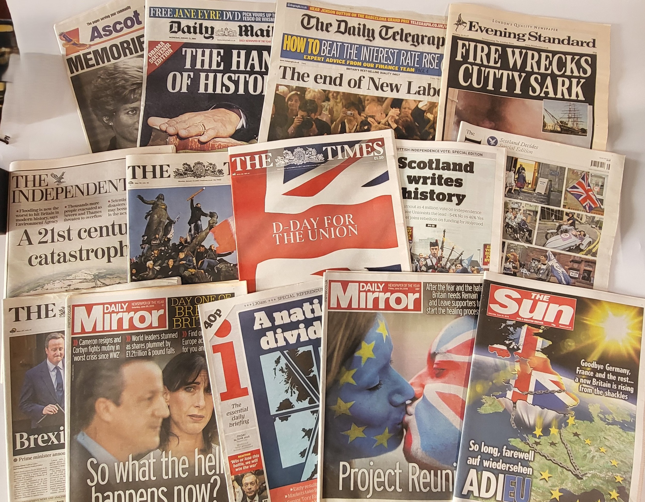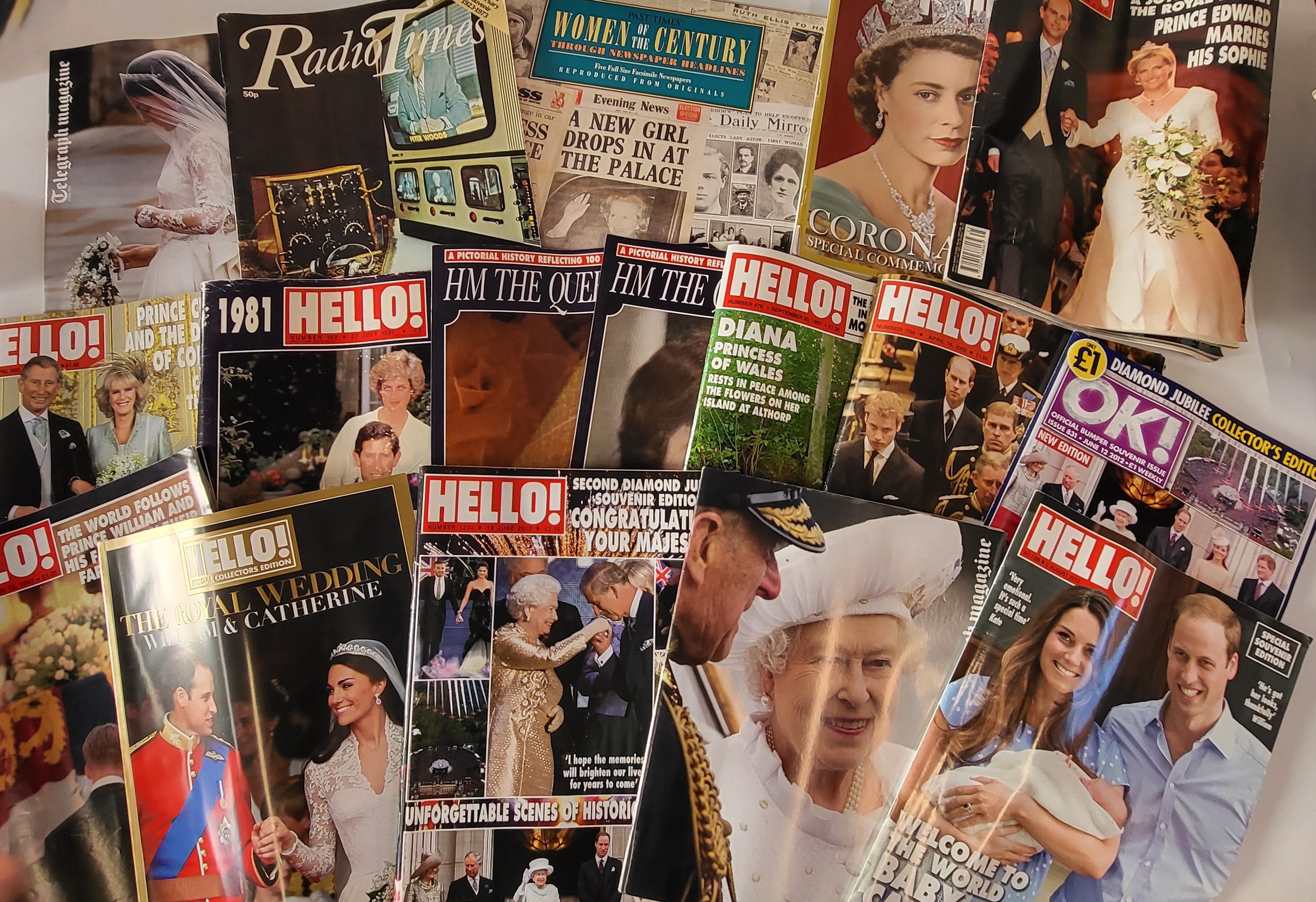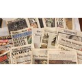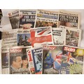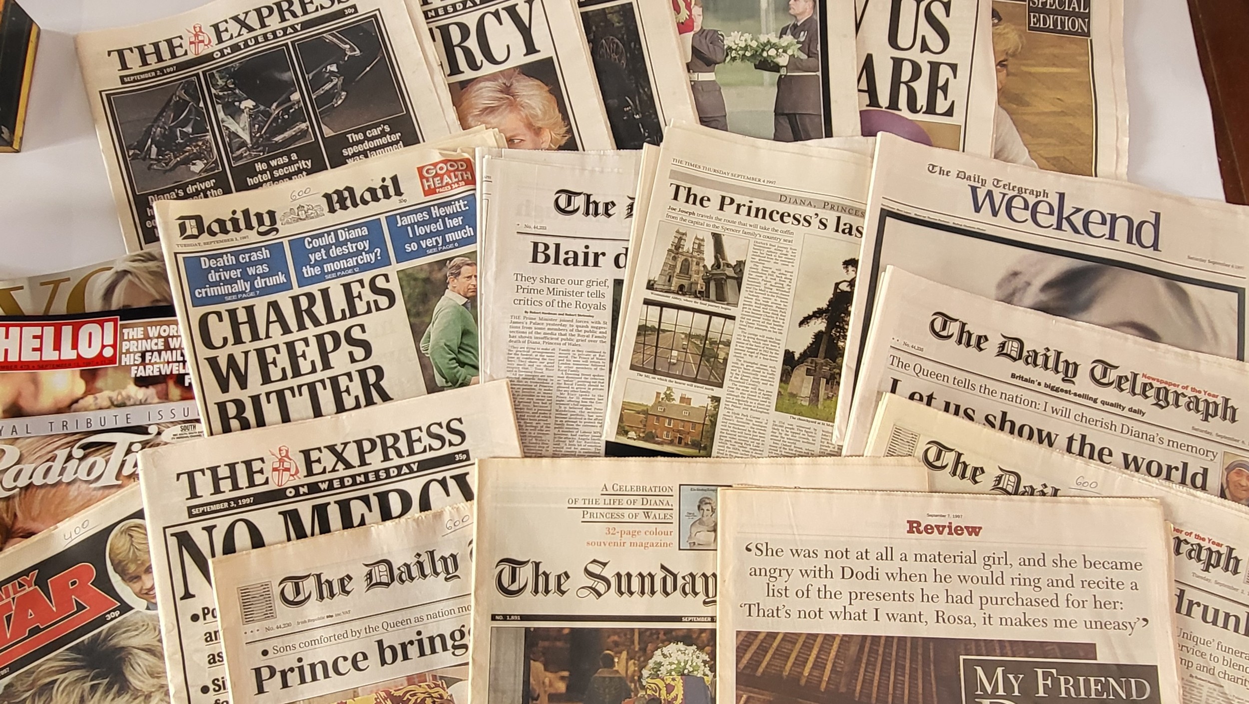 A large collection of old newspapers including the last edition of The News of the World, Princess Diana memorabilia, and a 50th anniversary edition of Radio Times 1923-1973.