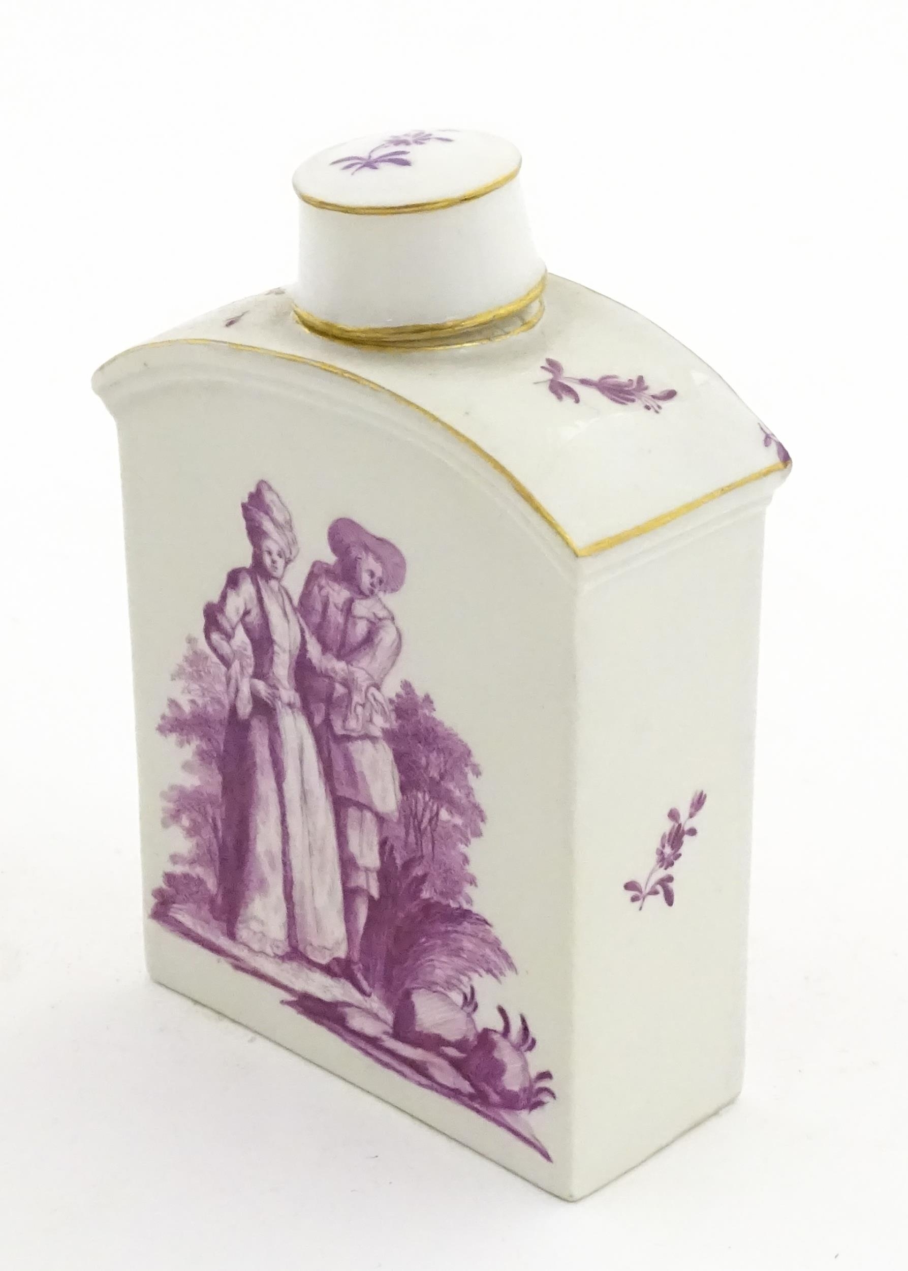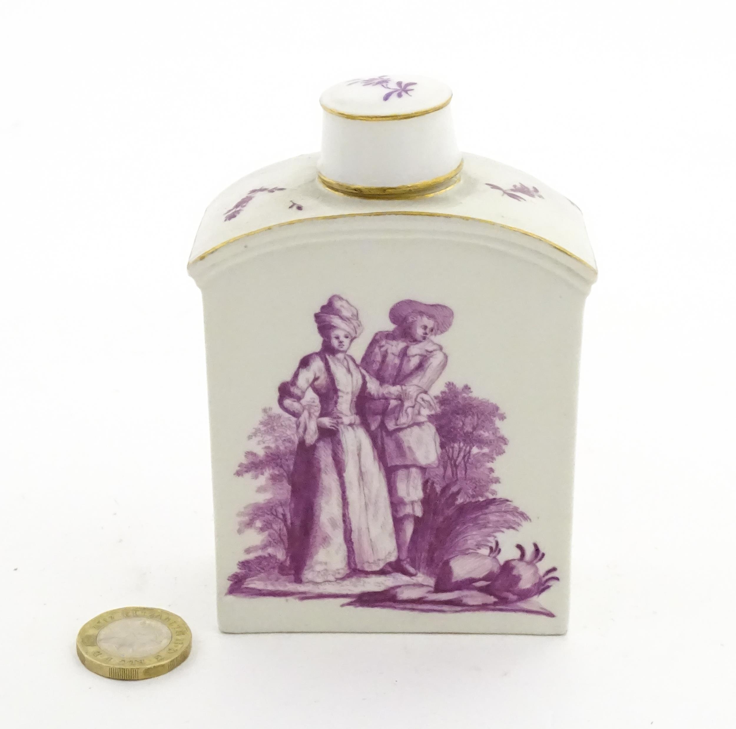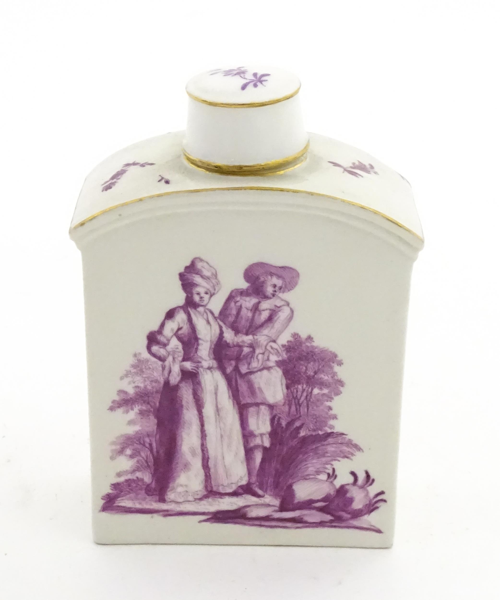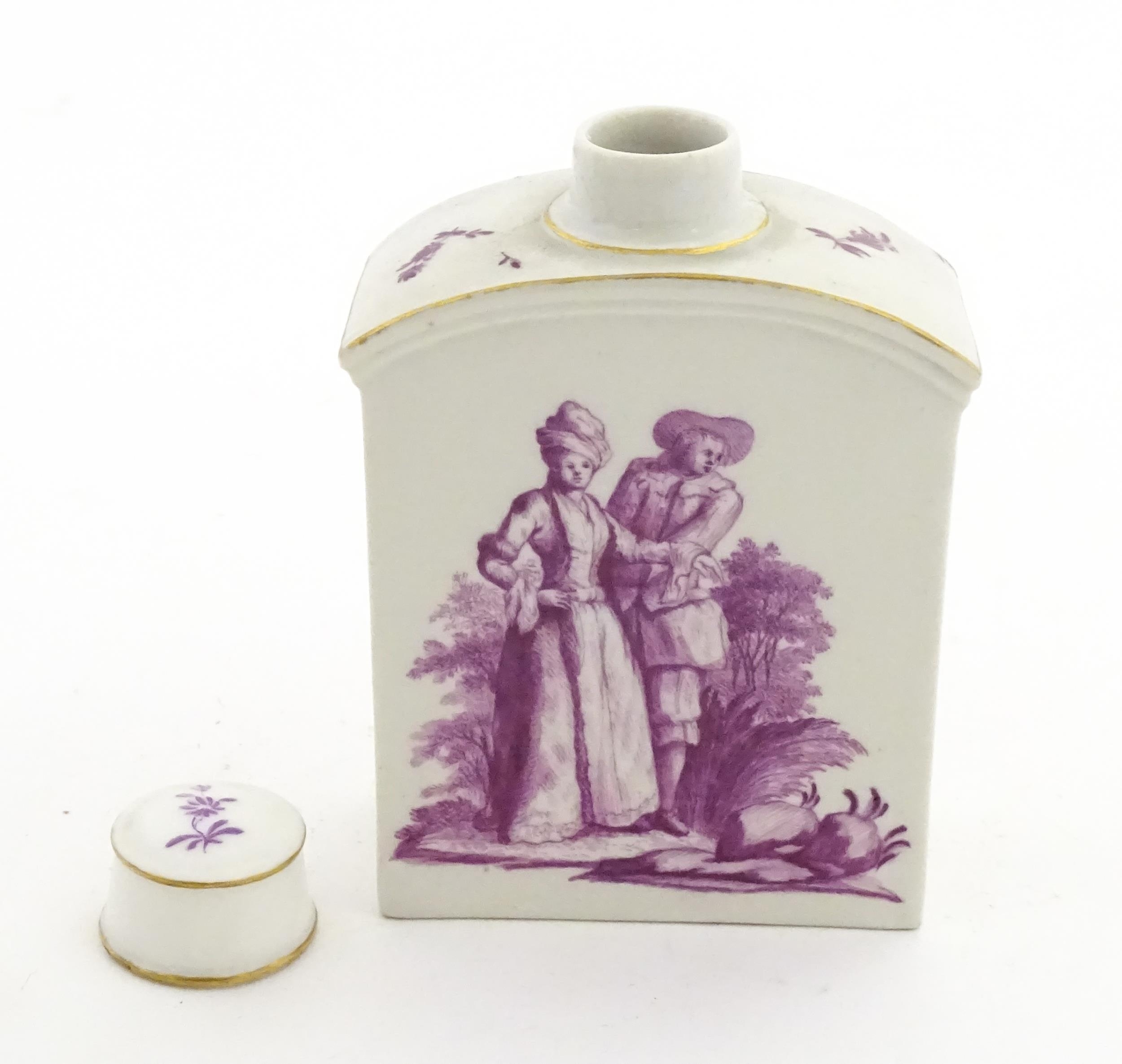 A Meissen style tea canister and cover hand painted in puce depicting a courting couple to one side and figures to the other. Approx. 4 1/2" high
