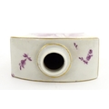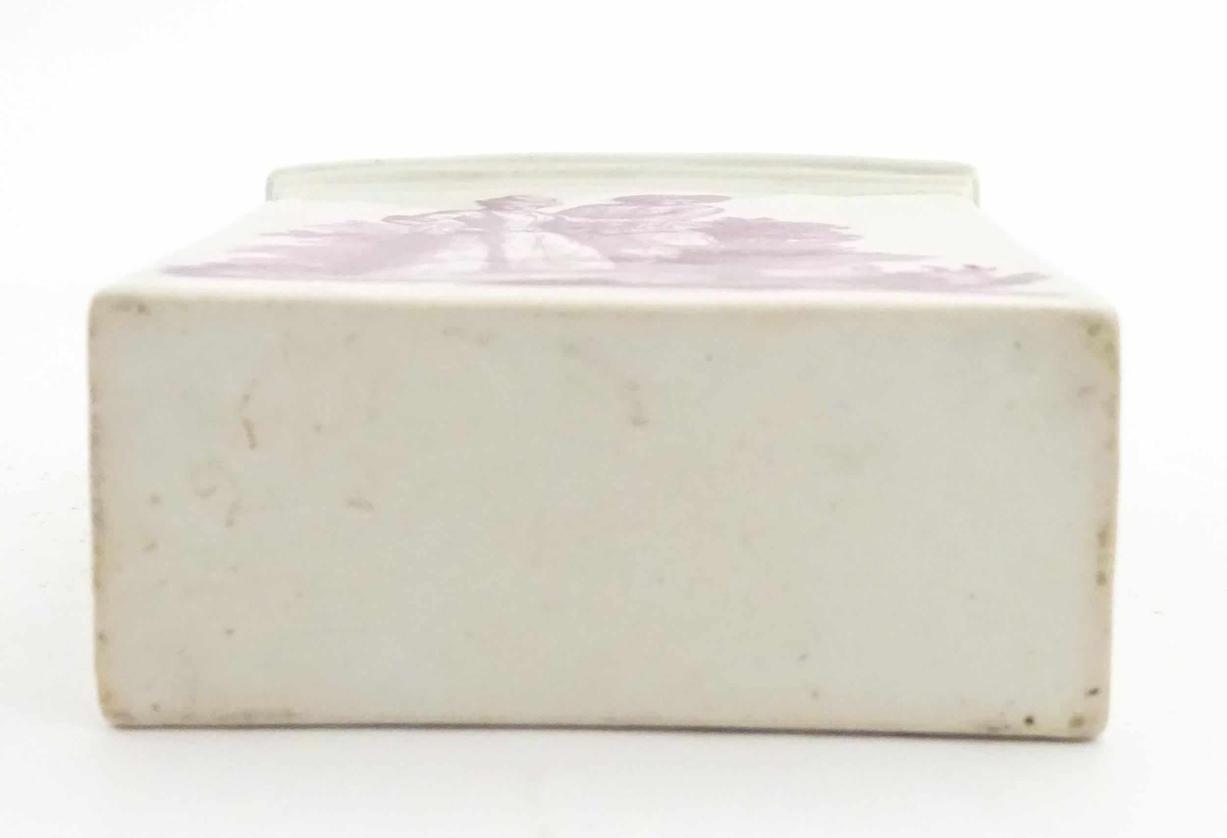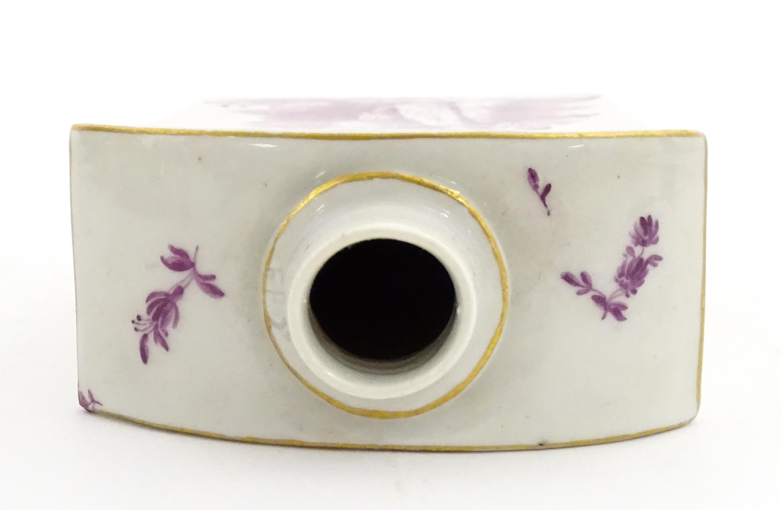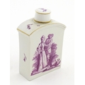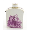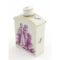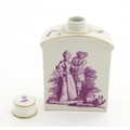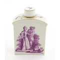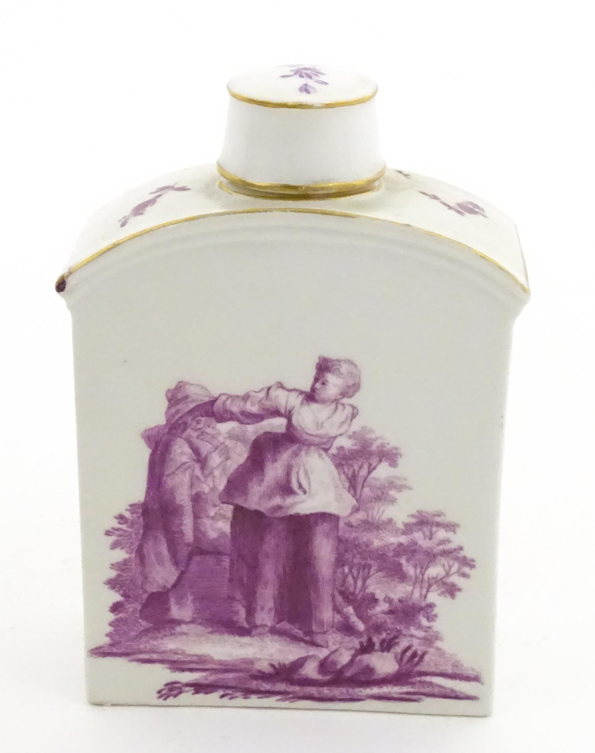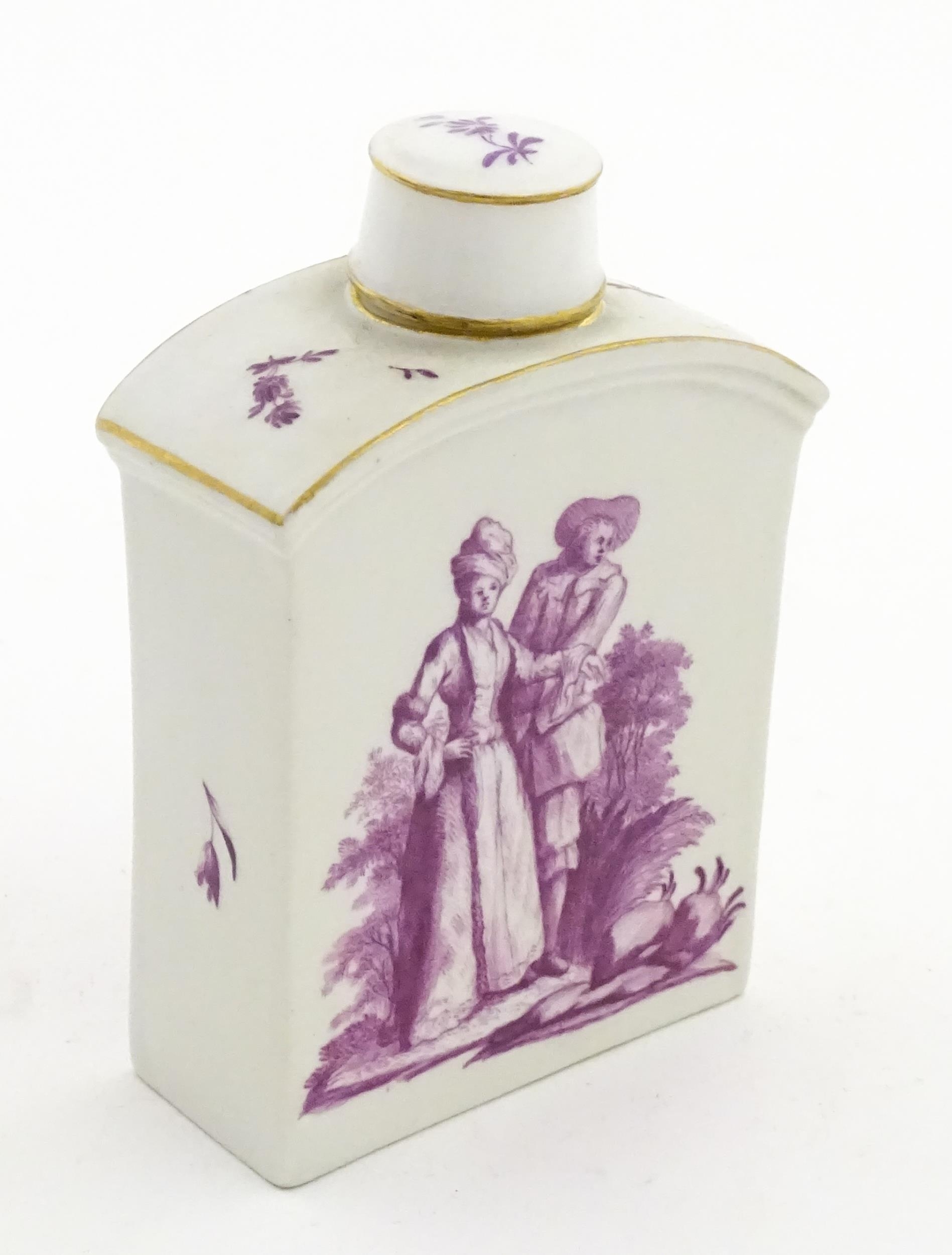 A Meissen style tea canister and cover hand painted in puce depicting a courting couple to one side and figures to the other. Approx. 4 1/2" high