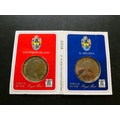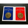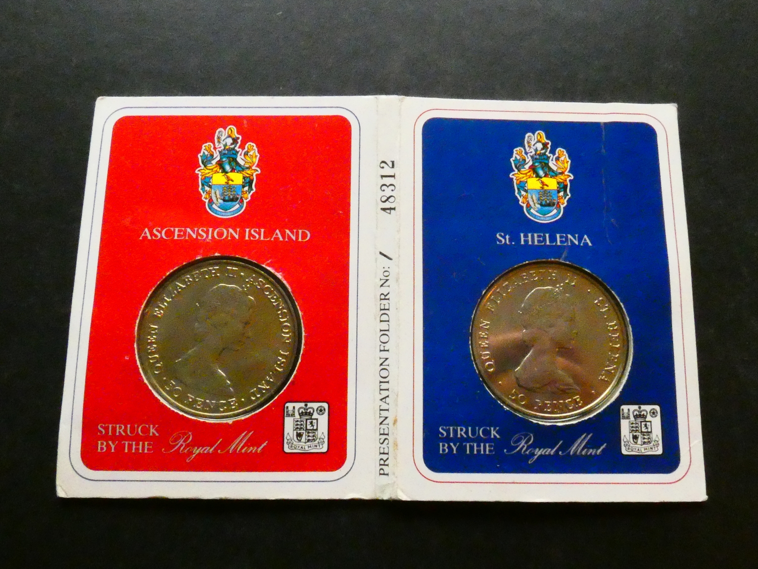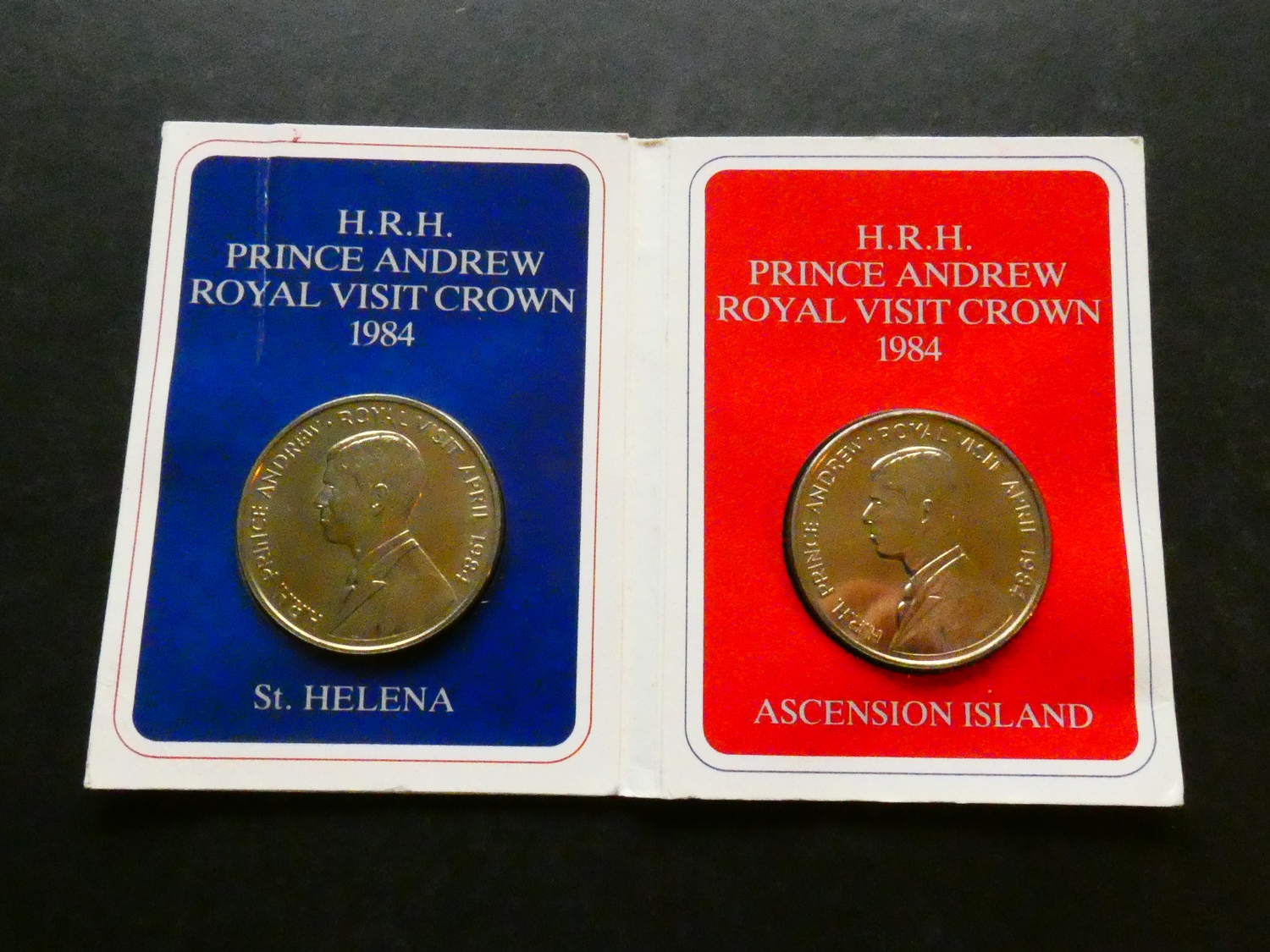 COINS. St. Helena, copper-nickel 50 Pence, 1984, royal visit of Prince Andrew, KM13, together with Ascension Island, copper-nickel 50 Pence, 1984, royal visit of Prince Andrew, KM6, UNCs in card folder, light wear to packaging.