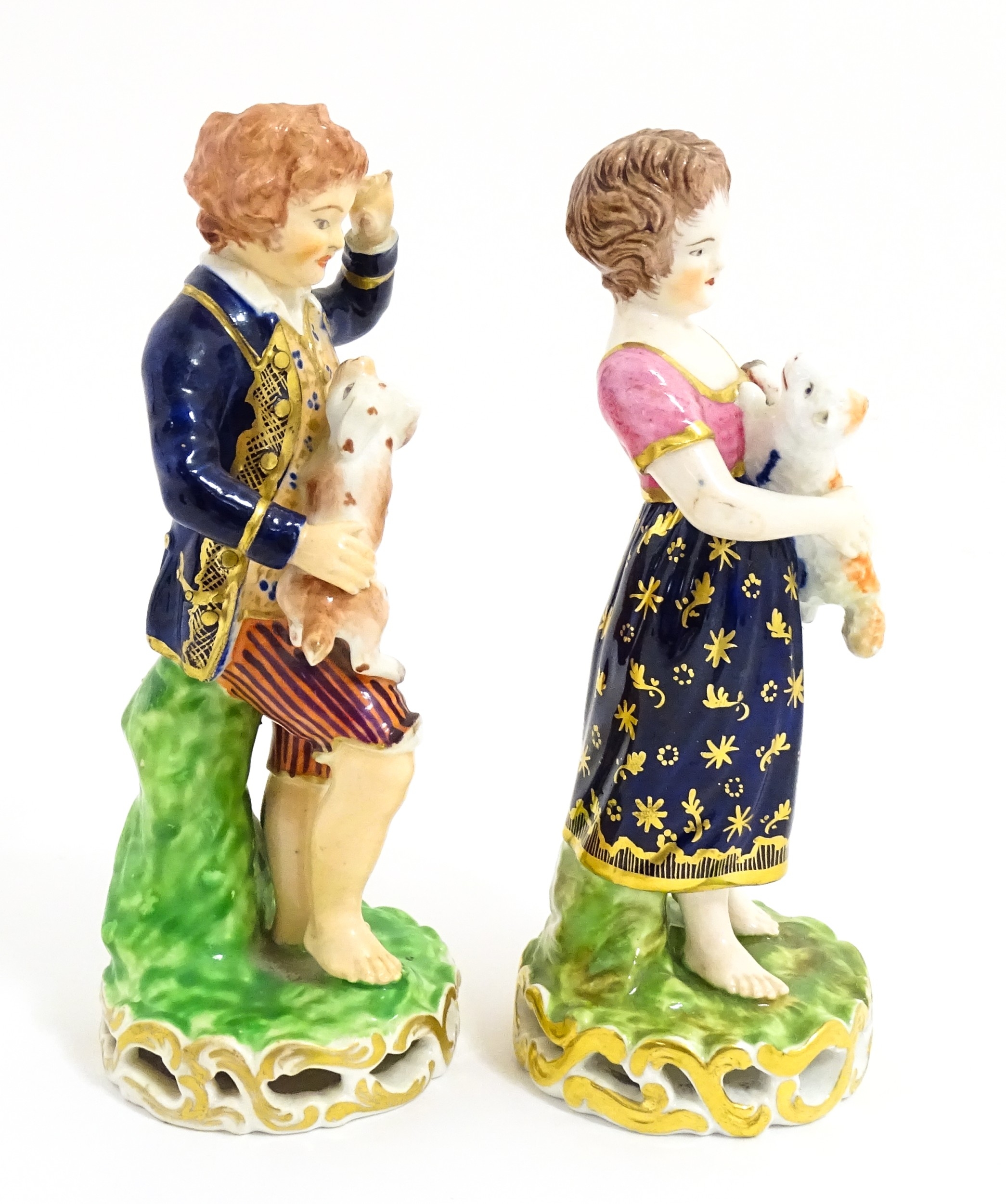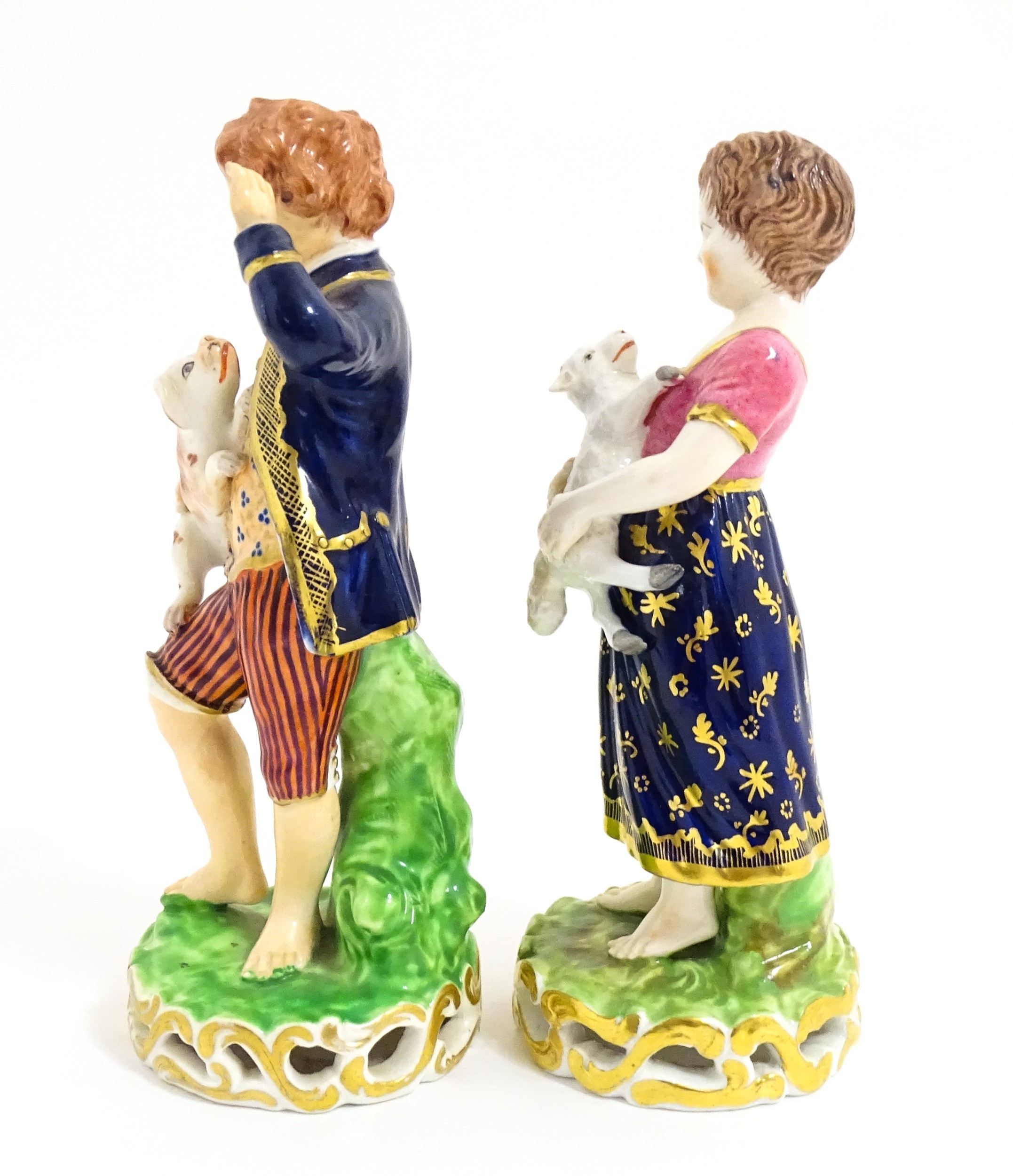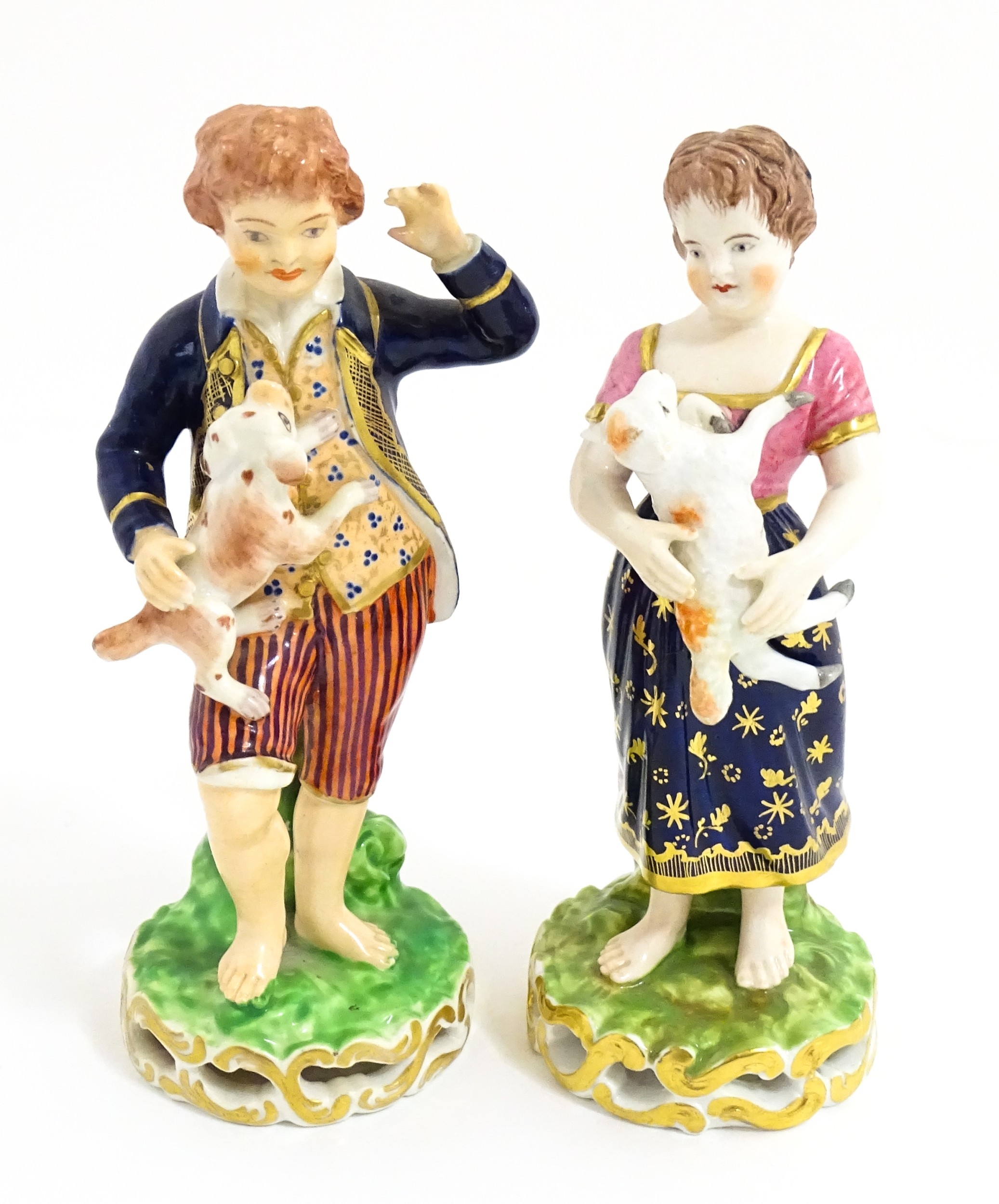 A pair of Derby figures modelled as a boy holding a dog, and a girl holding a lamb. Marked under. Approx. 5 3/4" high (2)