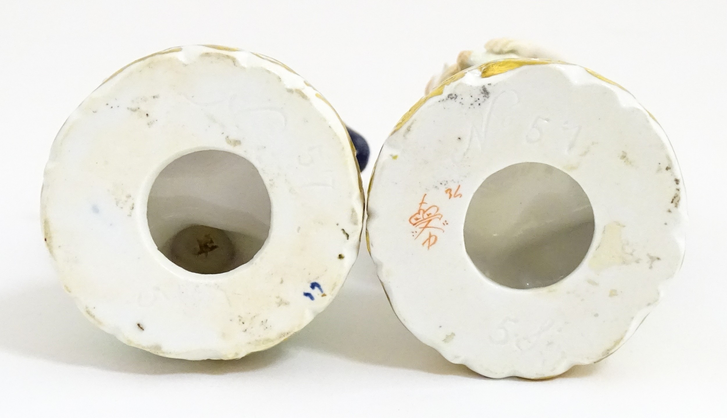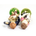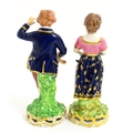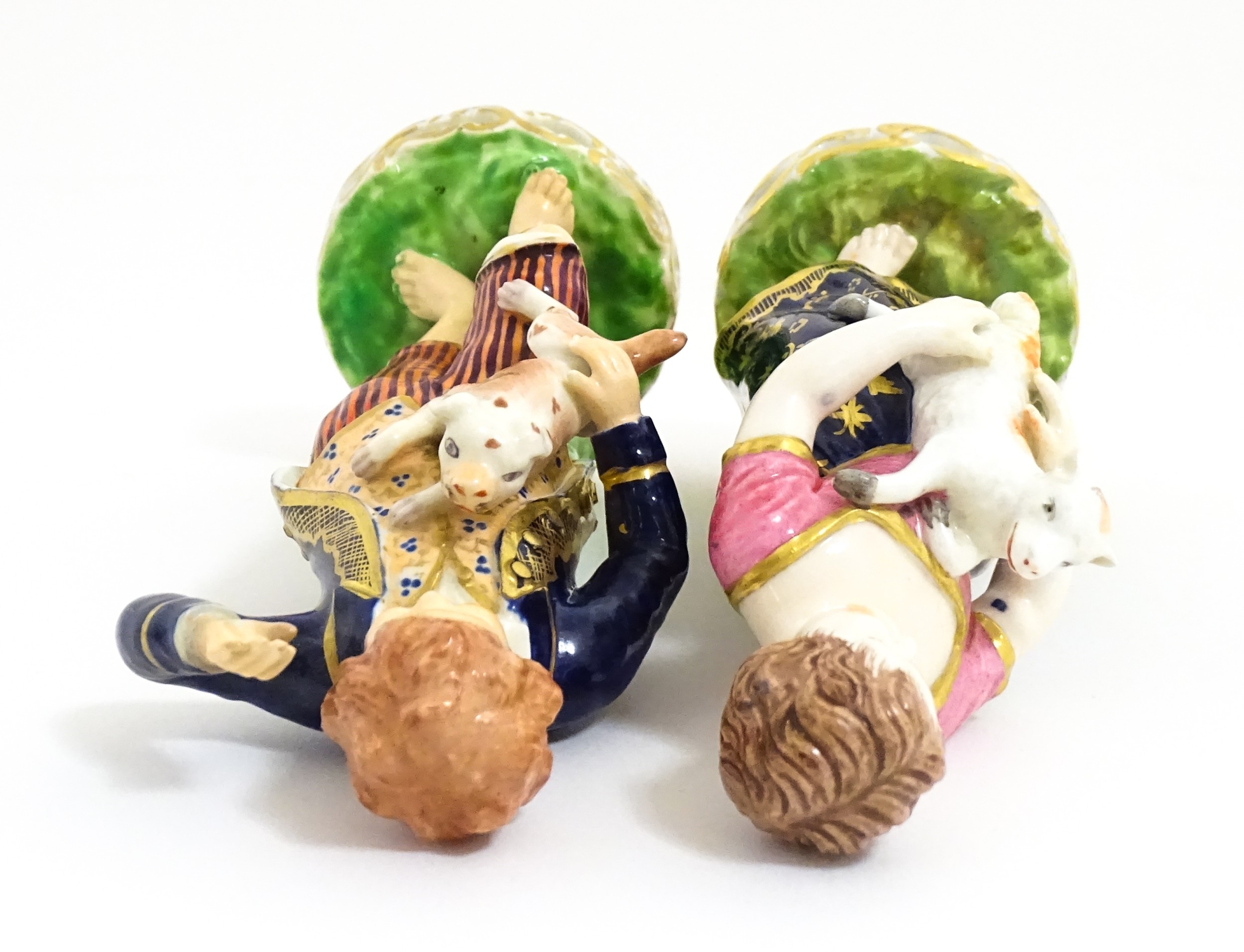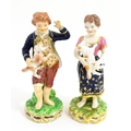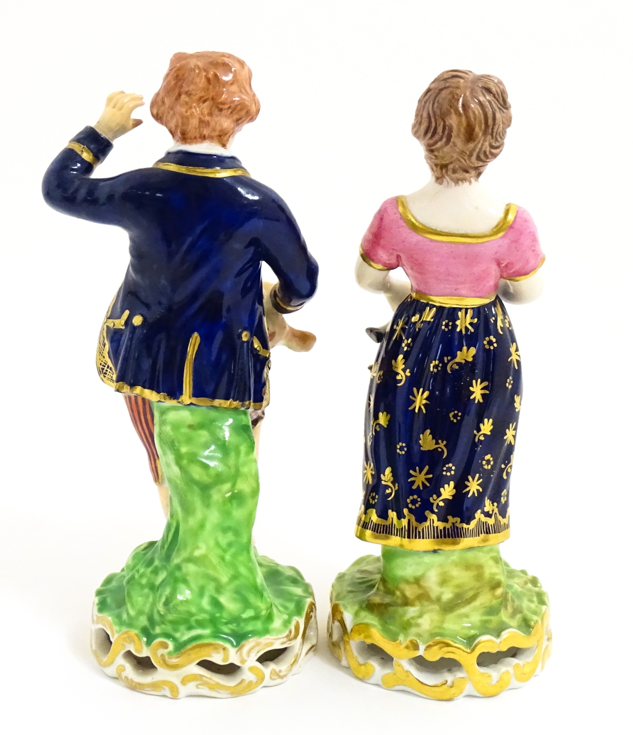 A pair of Derby figures modelled as a boy holding a dog, and a girl holding a lamb. Marked under. Approx. 5 3/4" high (2)