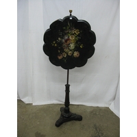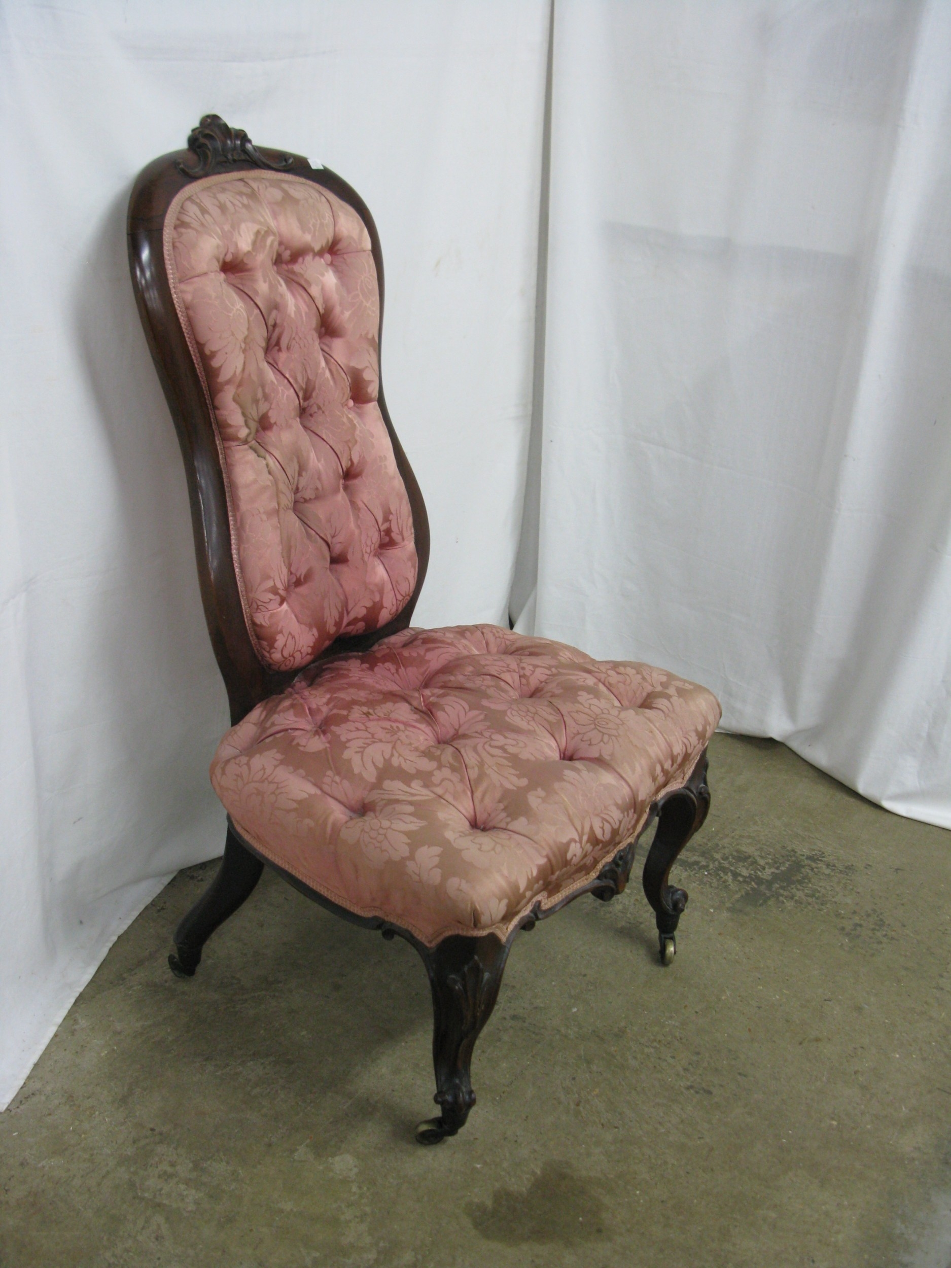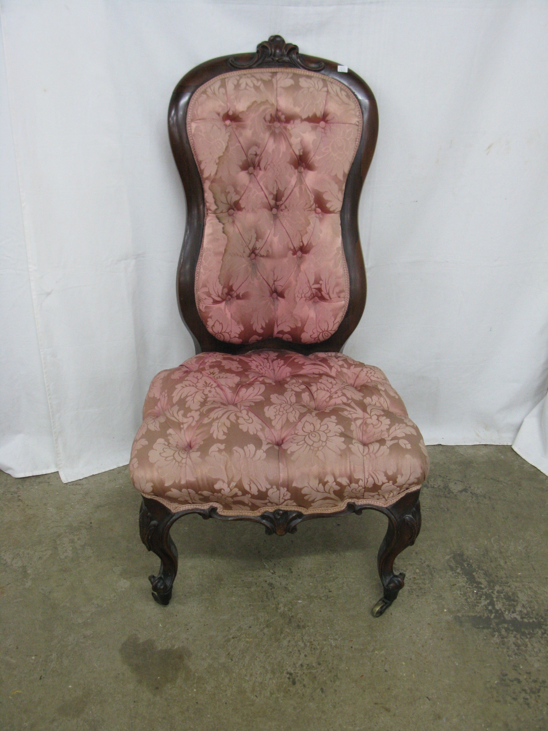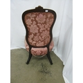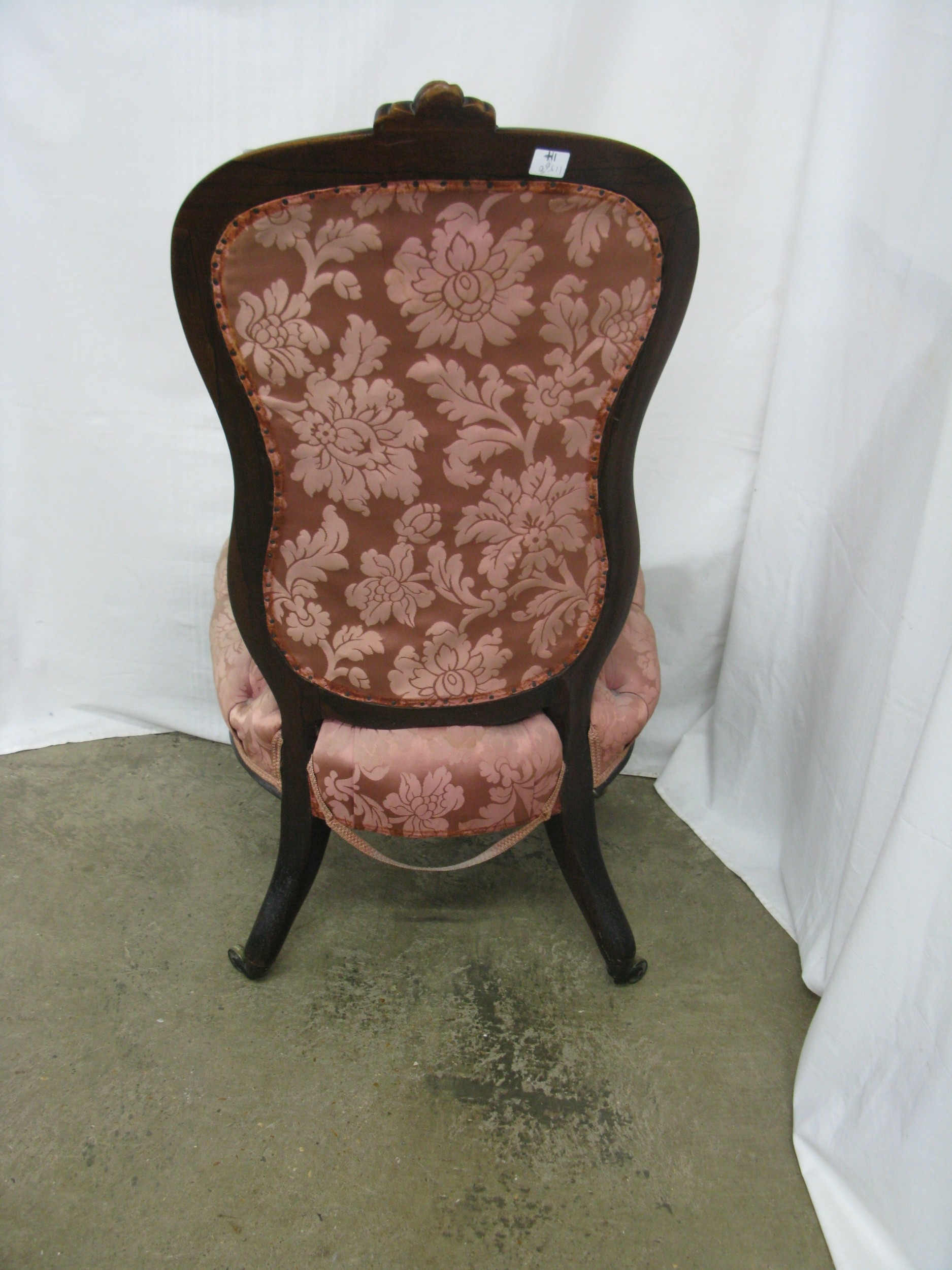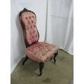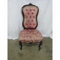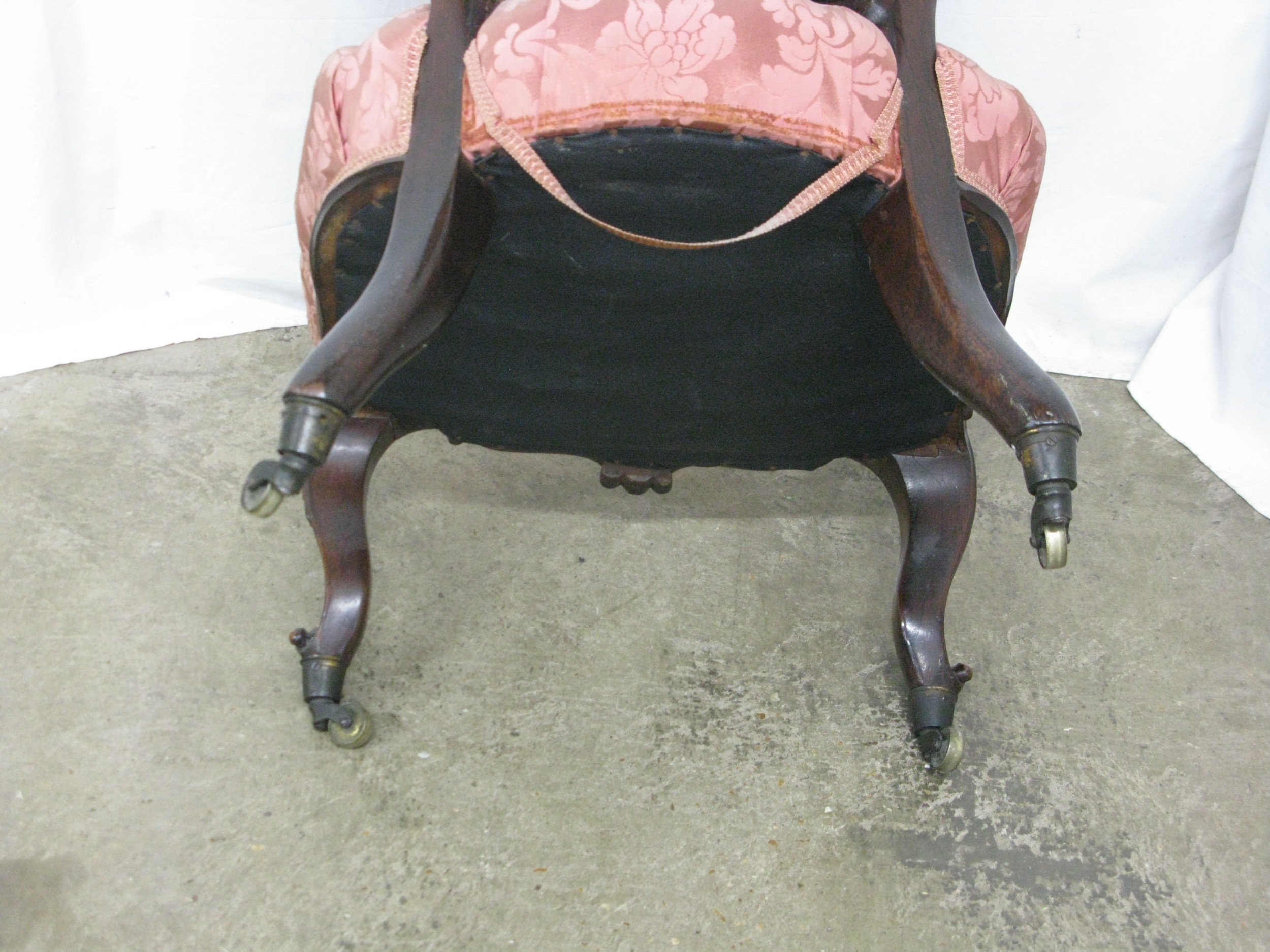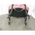 Mahogany frame button pink upholstered bedroom chair with shaped and carved back, cabriole front legs with carved knees and standing on later added castors - 48cm x 52cm x 111cm tall (braiding loose, upholstery faded and marked)