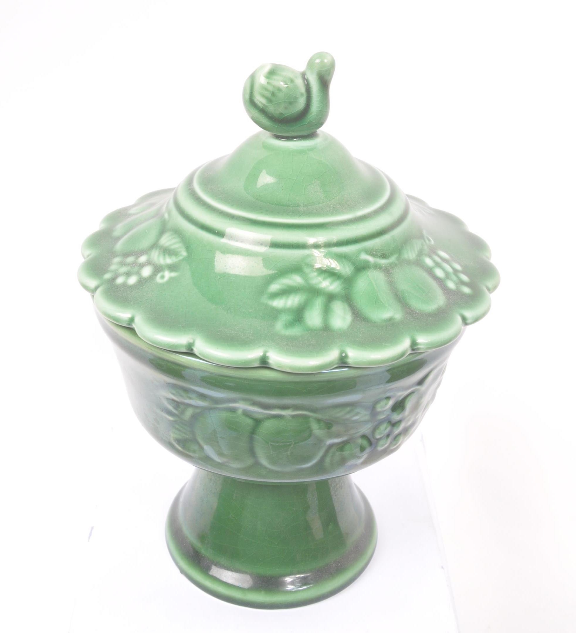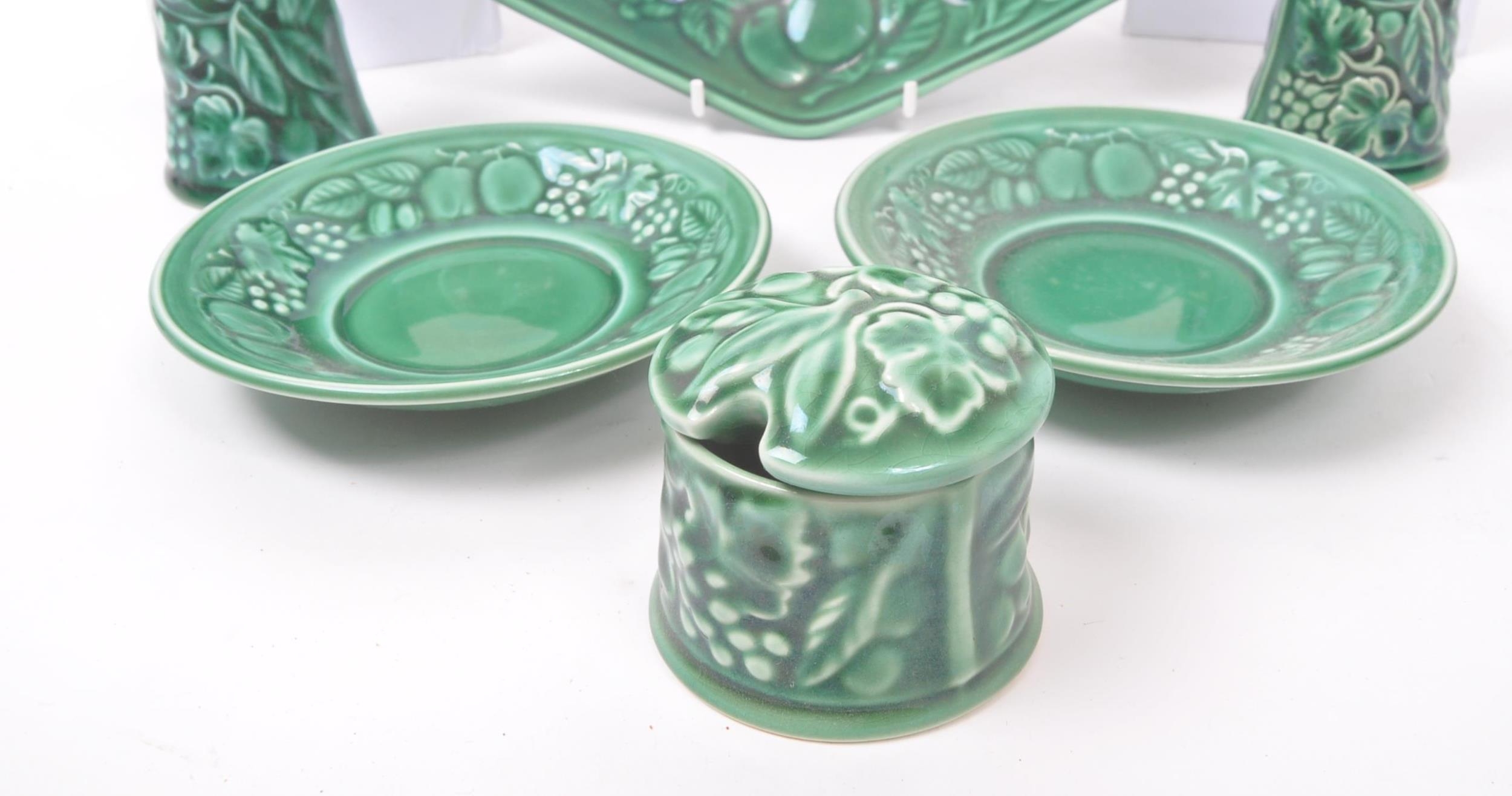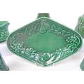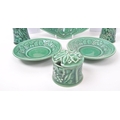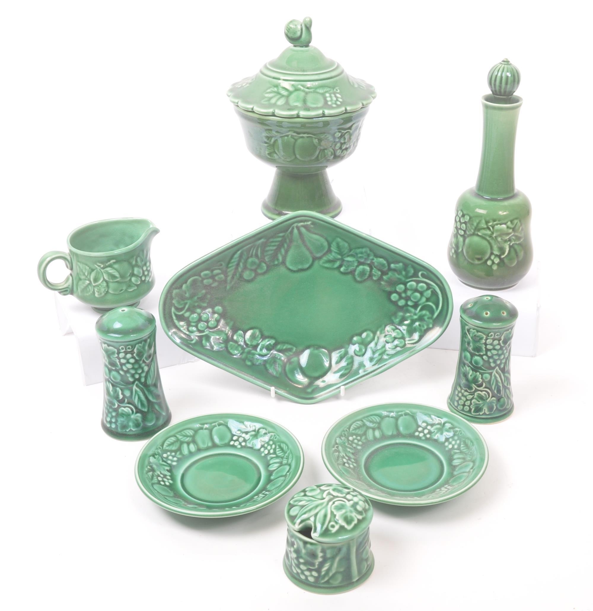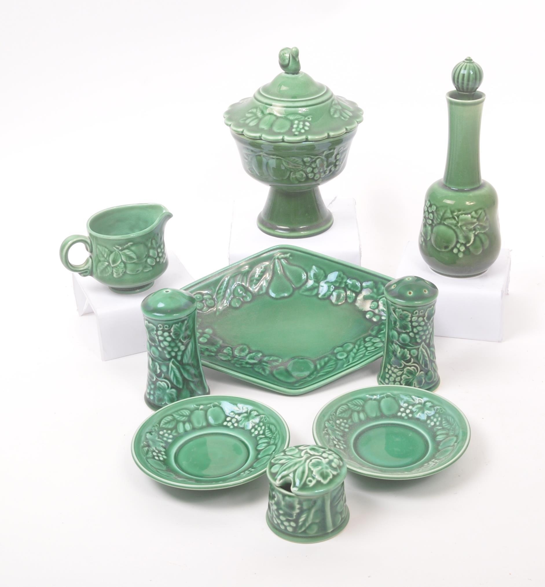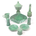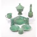 Royal Worcester - Crown Ware - A collection of vintage 20th century green ceramic table / kitchen ware. To include a pair of small dishes, diamond form plate, pair of salt and pepper shakers, sugar bowl, milk jug, scent / decanter and bowl on stand with lid. Tallest measures approx. 21cm