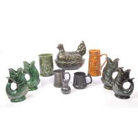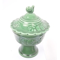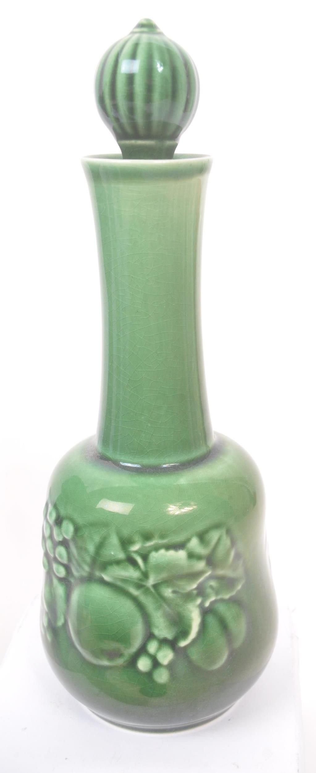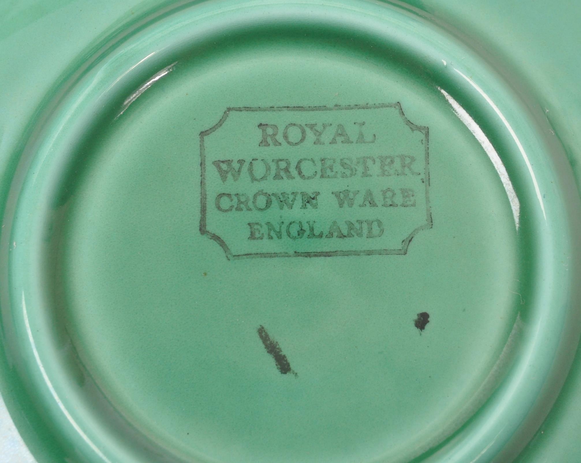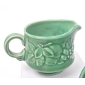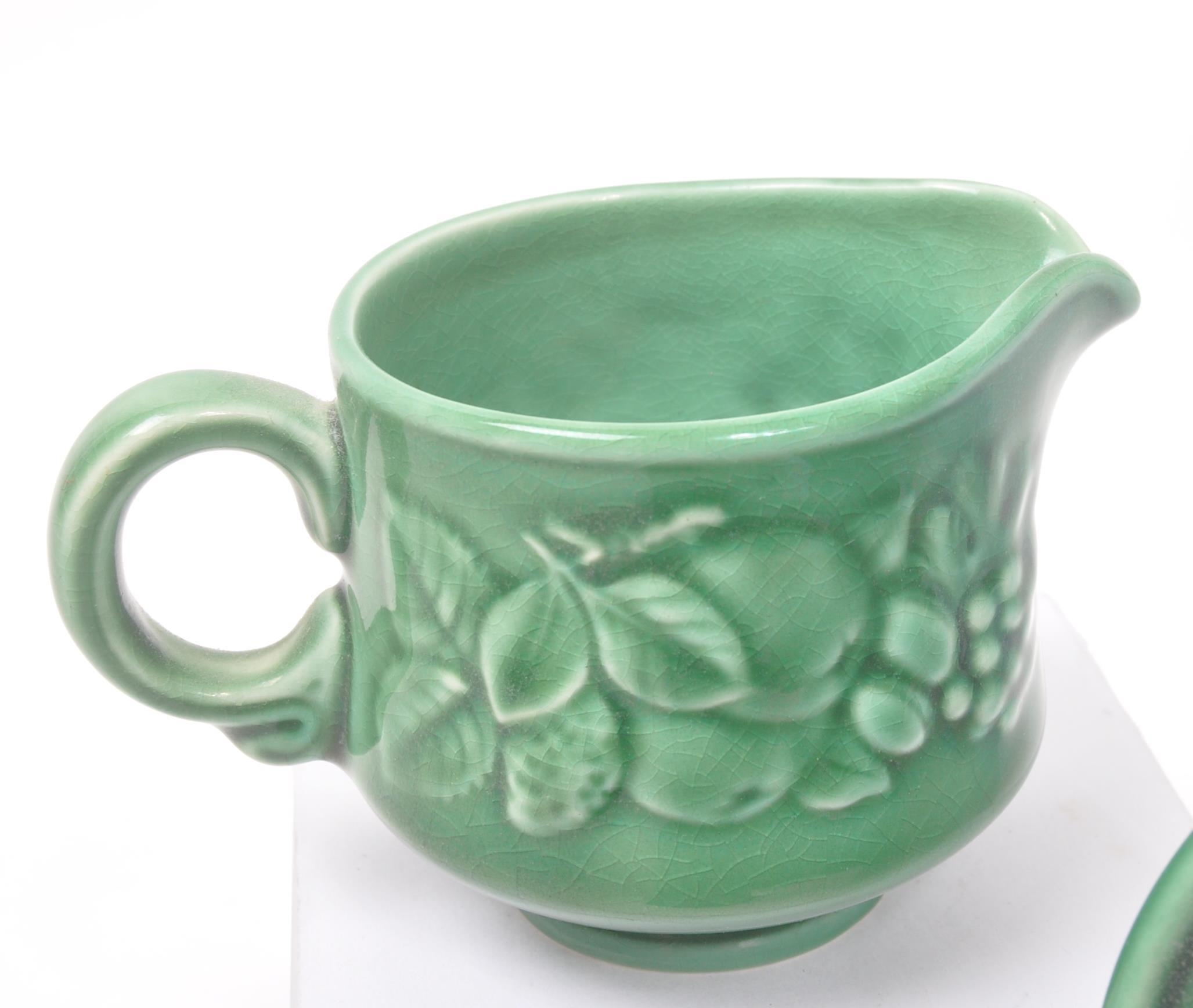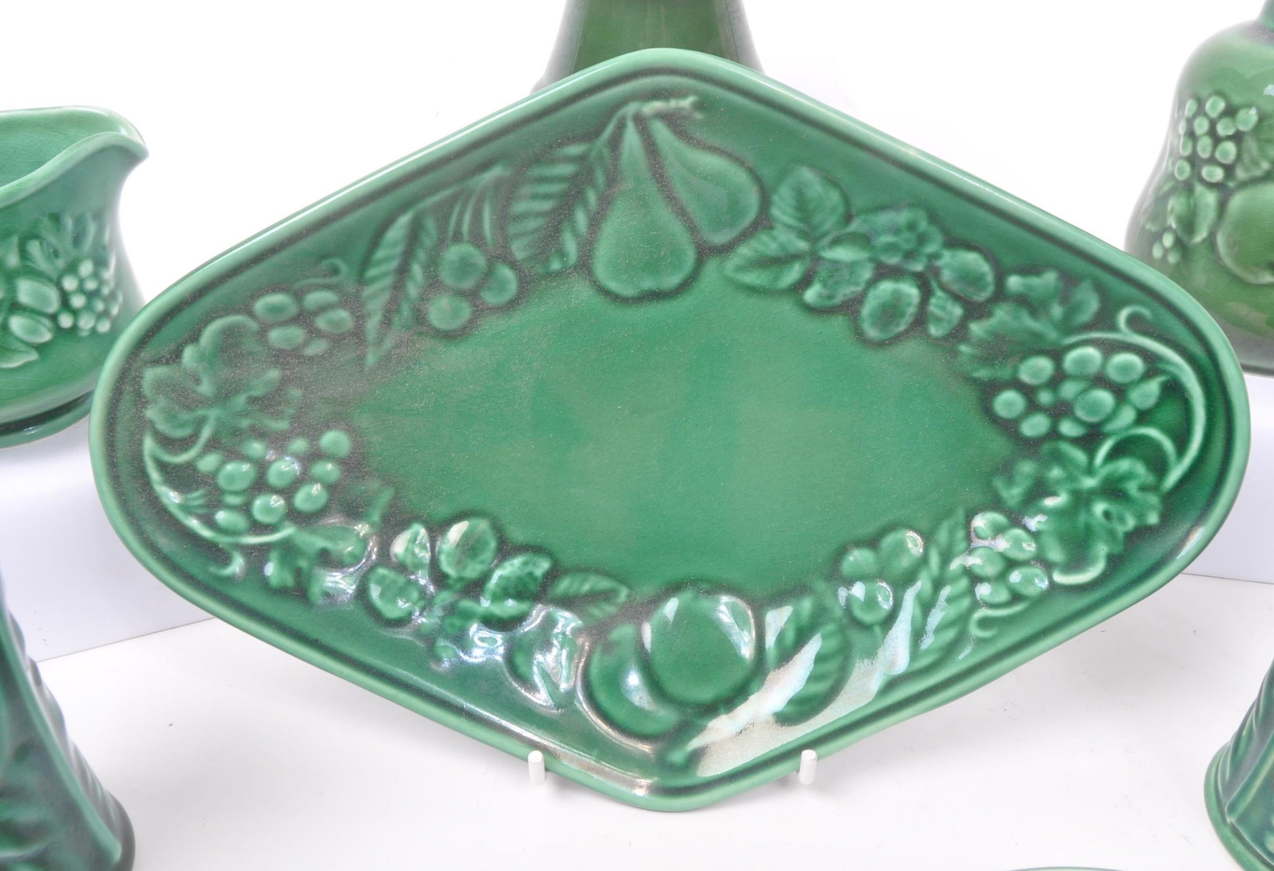 Royal Worcester - Crown Ware - A collection of vintage 20th century green ceramic table / kitchen ware. To include a pair of small dishes, diamond form plate, pair of salt and pepper shakers, sugar bowl, milk jug, scent / decanter and bowl on stand with lid. Tallest measures approx. 21cm