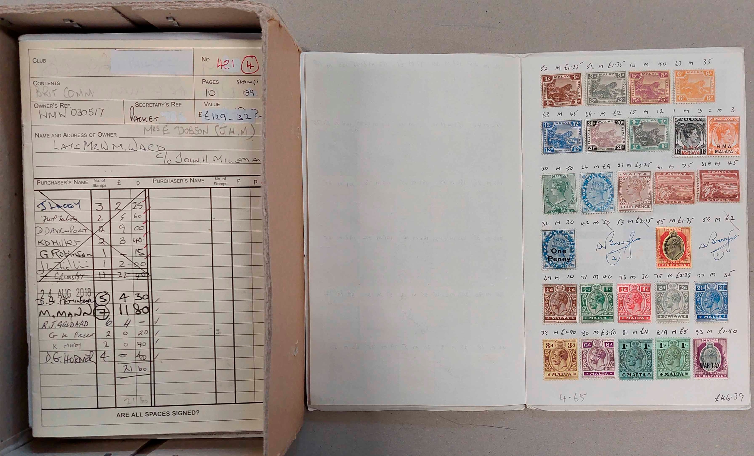 OLD WORLDWIDE CLUB BOOKS: Small box holding 19 remaindered club books. Mostly still well filled with strength in early mint Br. Empire. Remaining content priced to sell at £1,200+ (Few 1,000s)