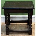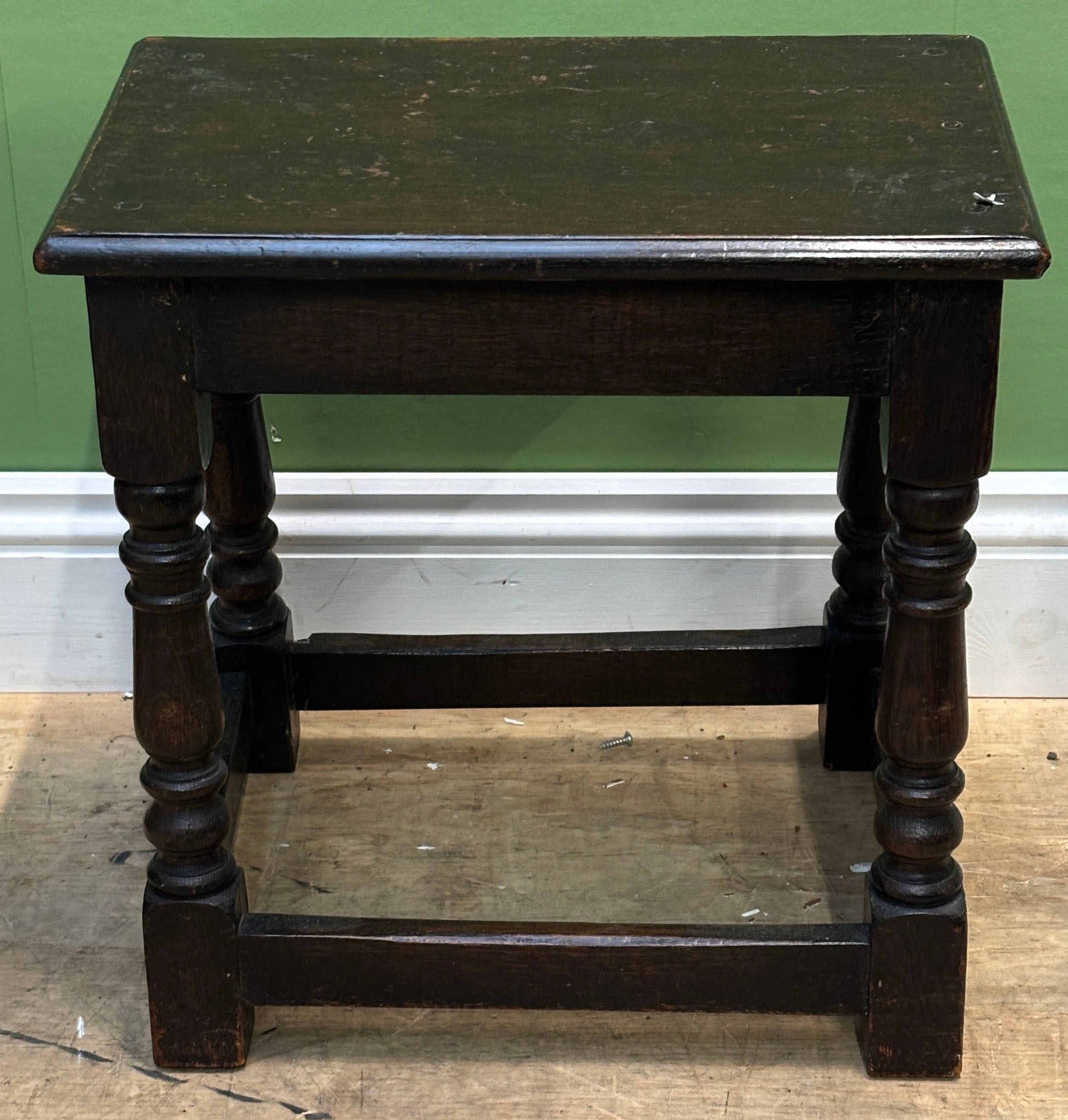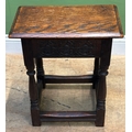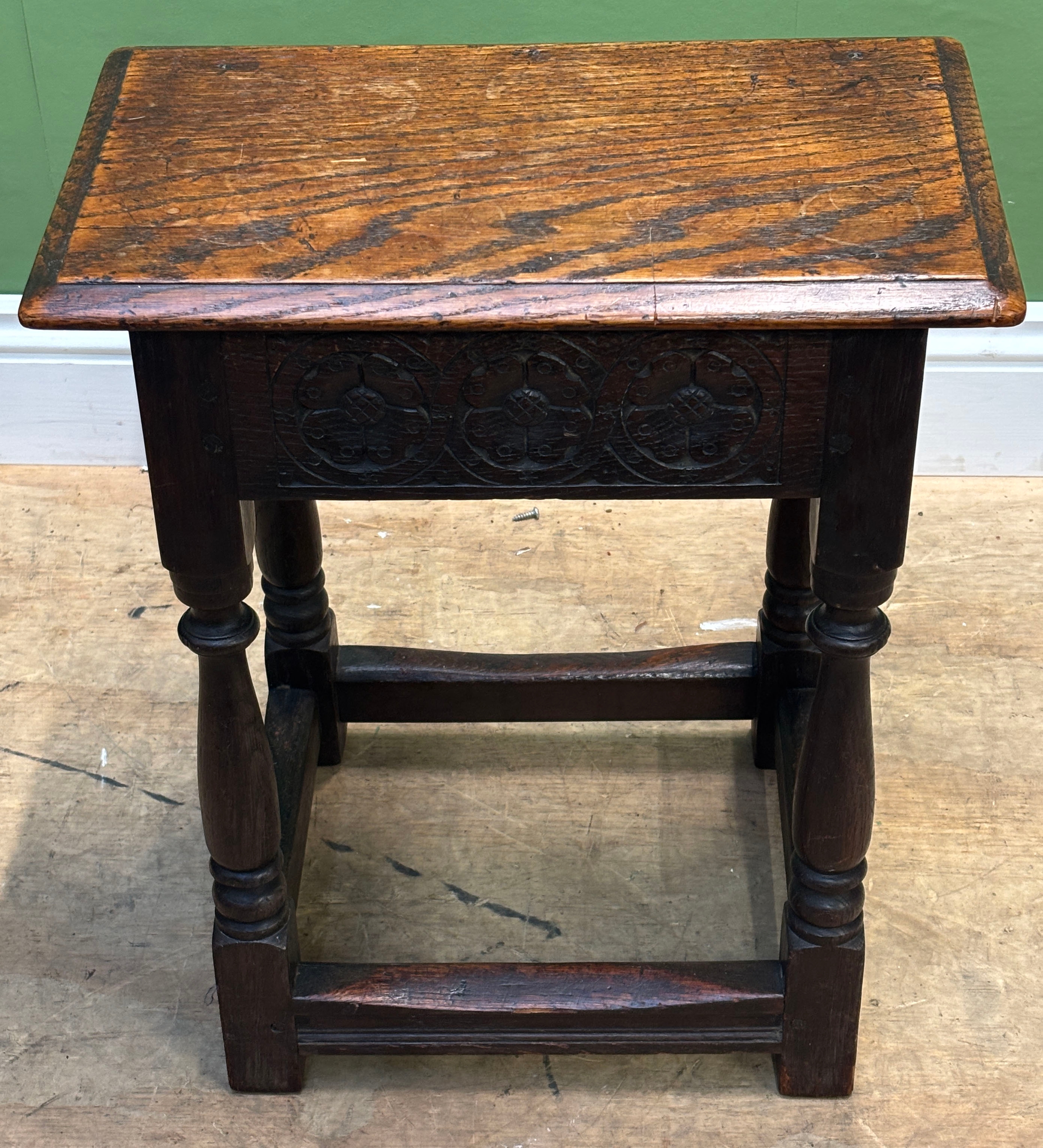 Two oak joint stools in 18th century style, one with carved frieze, 46x27x54cmH; the other a little smaller 45x29x45cmH