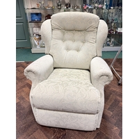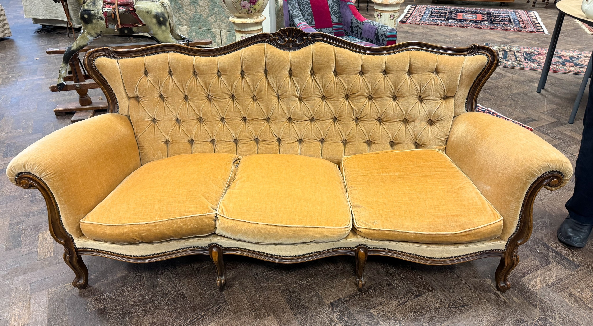 A French style mahogany button backed three seater settee on cabriole style legs with loose seat cushions