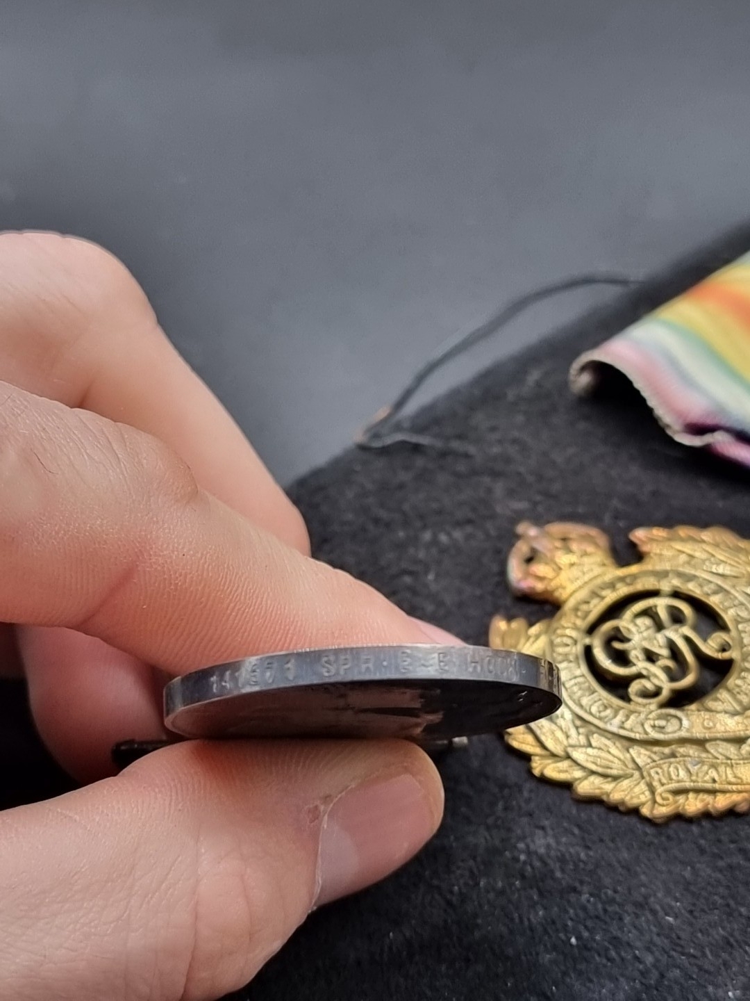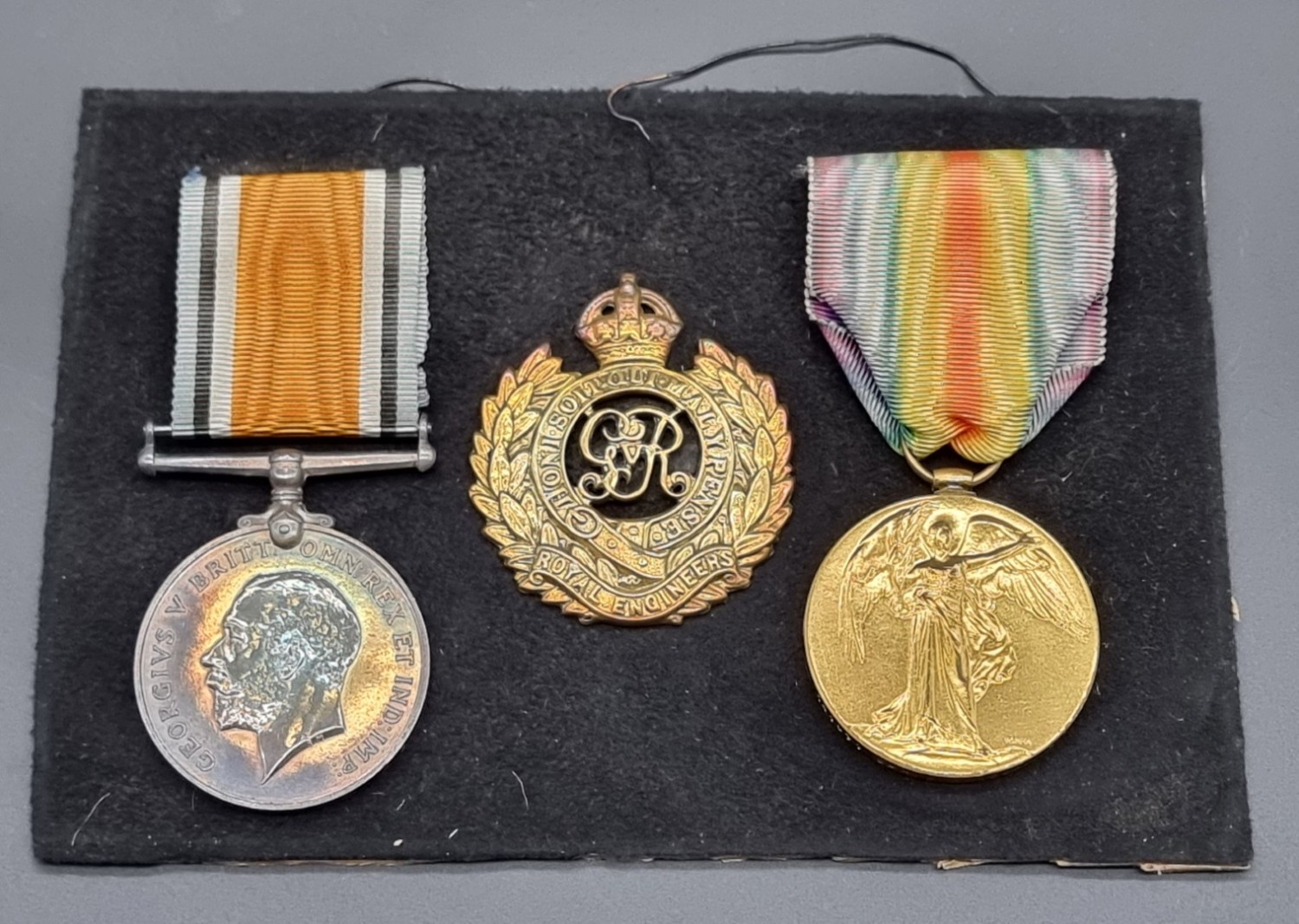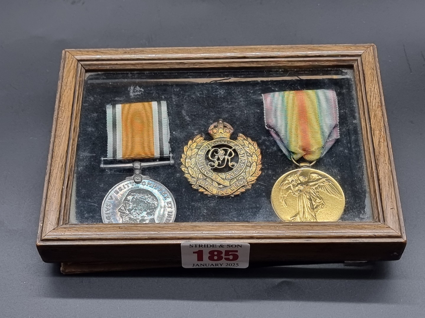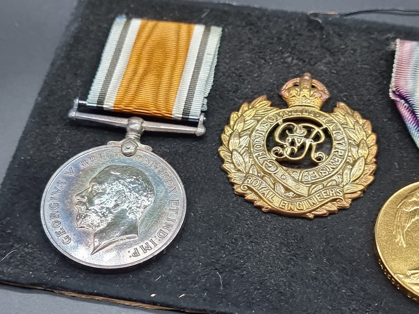 Medals: a framed WWI pair, to 141571 Spr E.E. Hook. R.E; together with Royal Engineers cap badge.