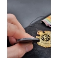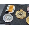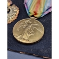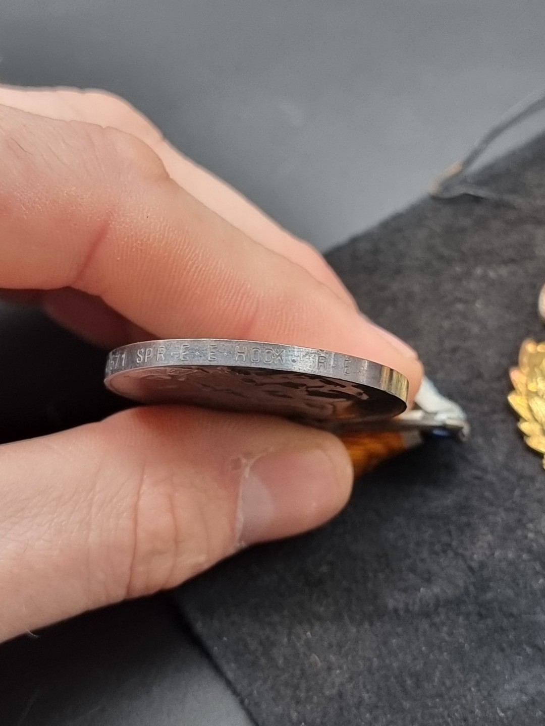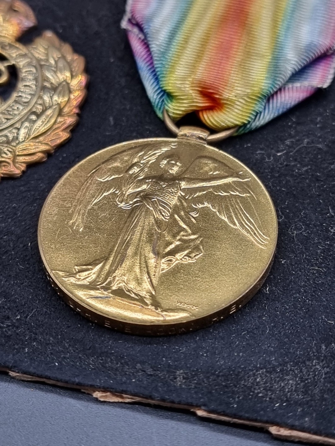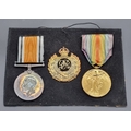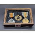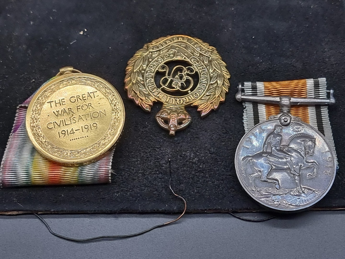 Medals: a framed WWI pair, to 141571 Spr E.E. Hook. R.E; together with Royal Engineers cap badge.