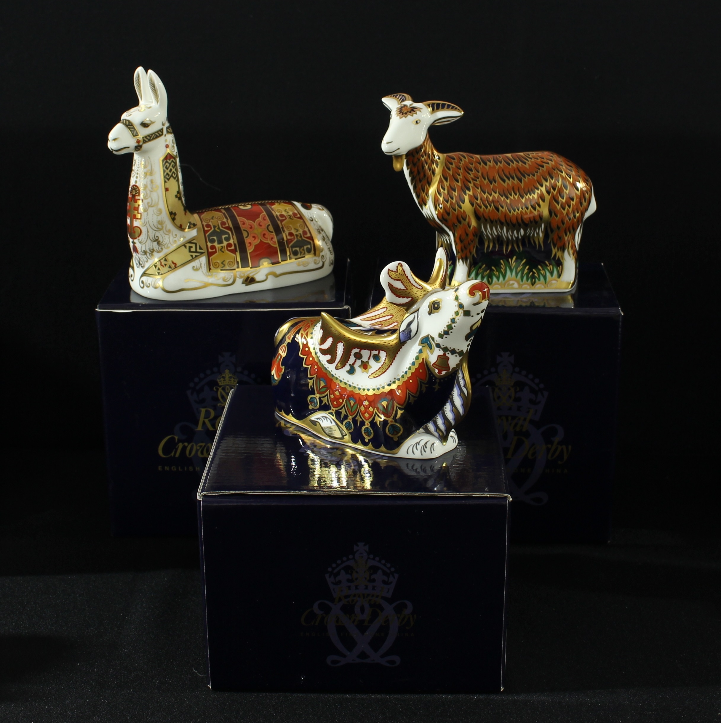 A Royal Crown Derby paperweight, Llama, signed, gold stopper, boxed; others, reindeer, signed, gold stopper, boxed; Nanny Goat, Visitor Centre exclusive, signed, gold stopper, boxed (3)