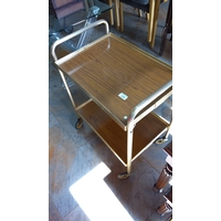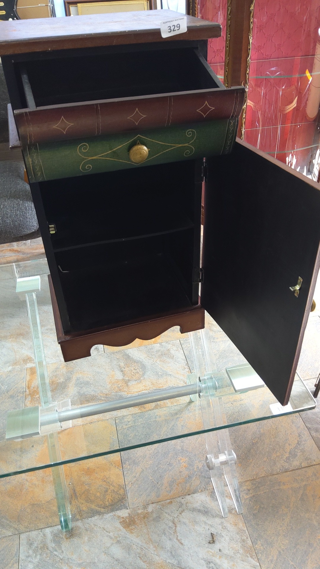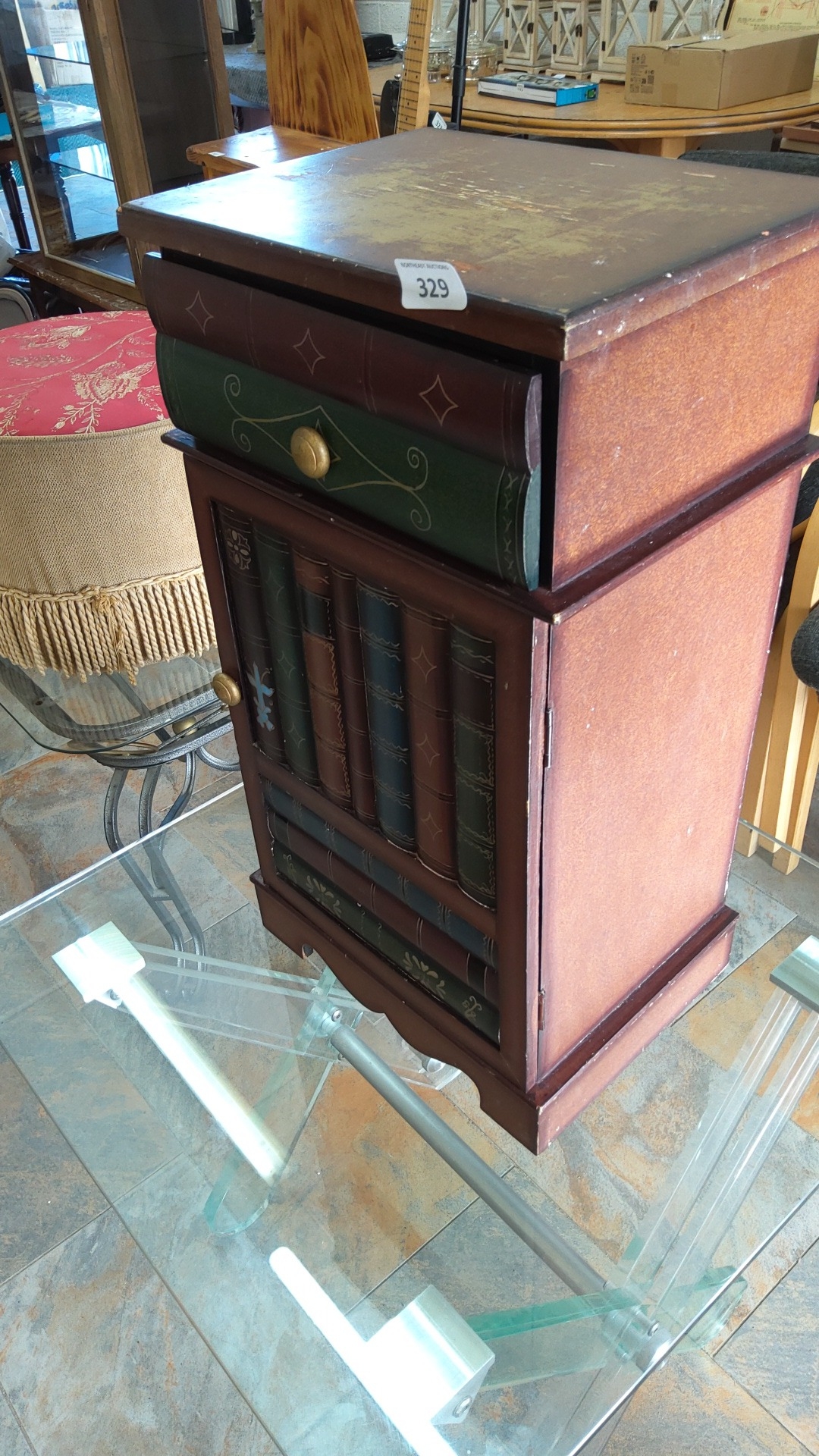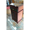 Decorated bedside cabinet, the drawer front with stylised foliate scrolls and quatrefoils, above a single cupboard door painted as book spines; fitted with a drawer and shelved interior, on a shaped plinth base.