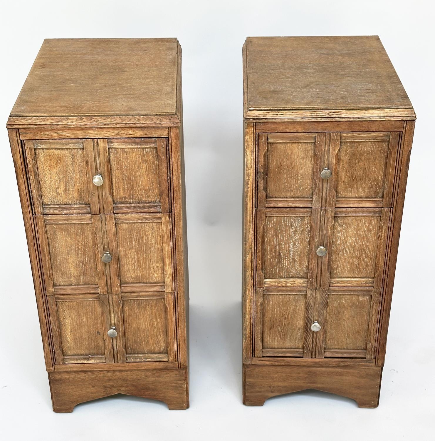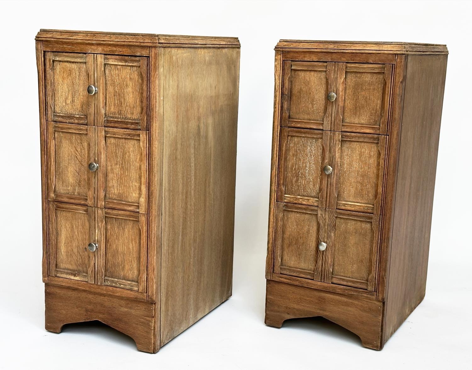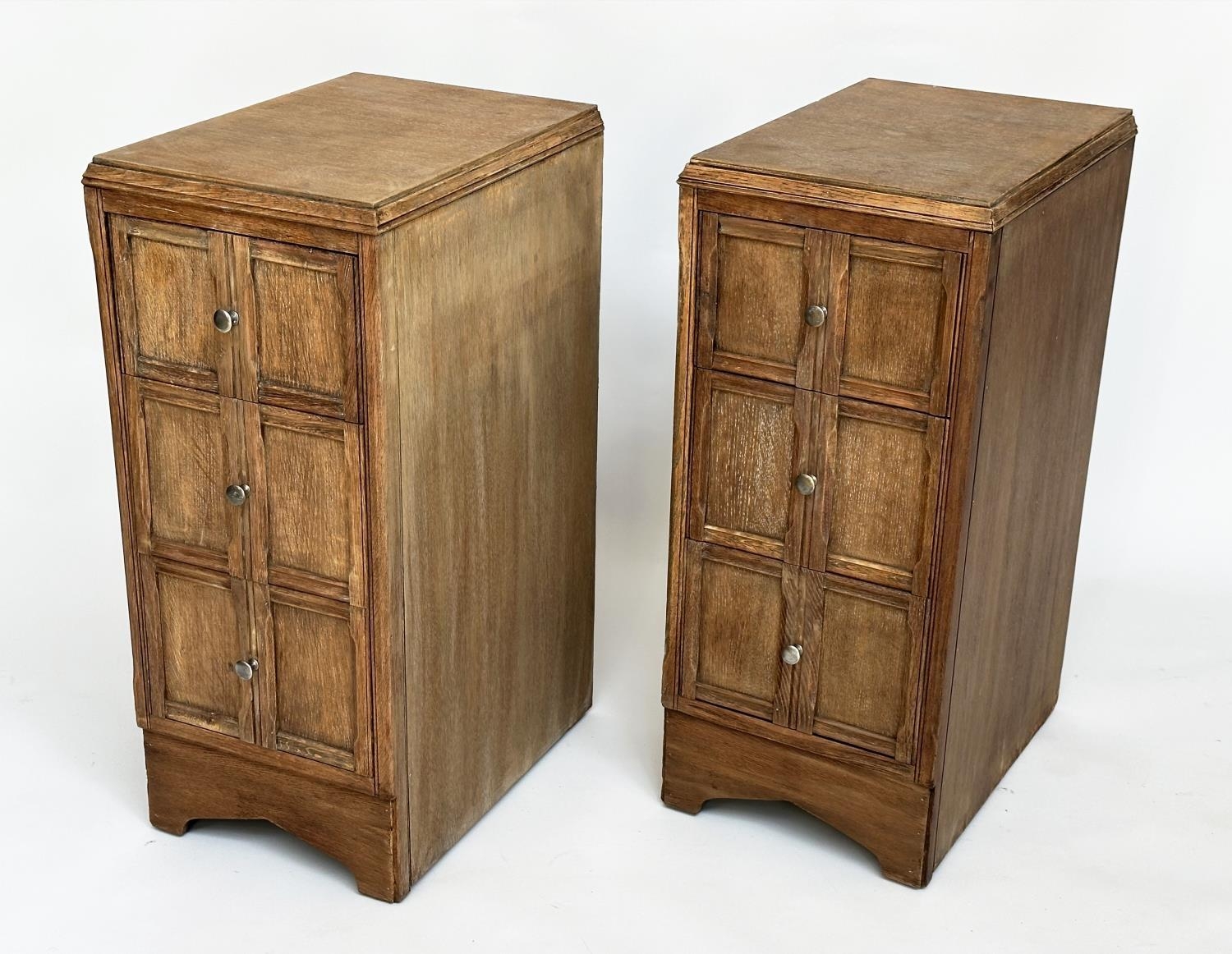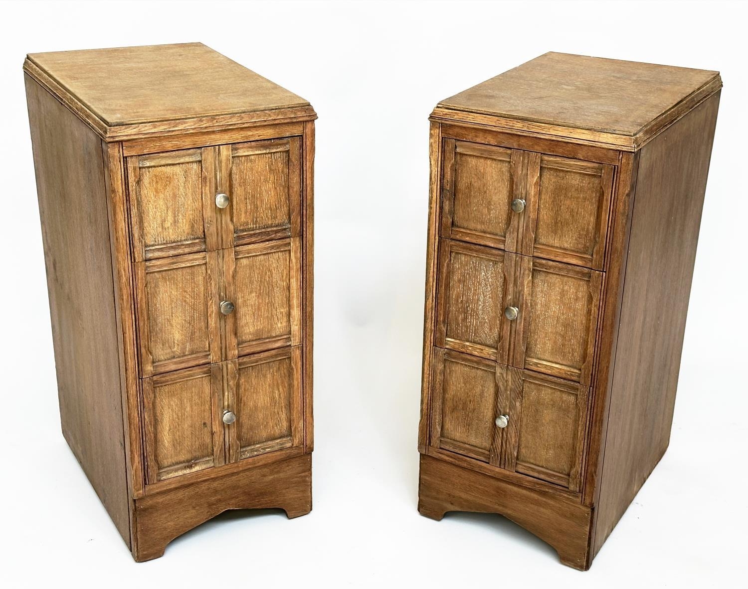 ART DECO BEDSIDE CHESTS, a pair, Heals style limed oak, each with three drawers, 78cm H x 50cm D x 28cm W. (2)