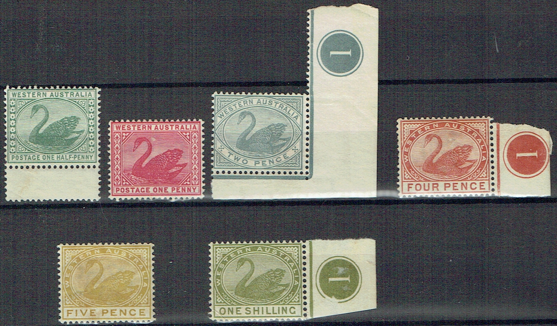 AUSTRALIAN STATES - Western Australia: 1885-93 Mint assembly incl ½d, 1d, 2d (marginal pl.1), 4d (marginal pl.1), 5d & 1s (marginal pl.1). Cat £174.