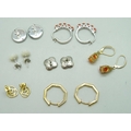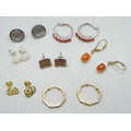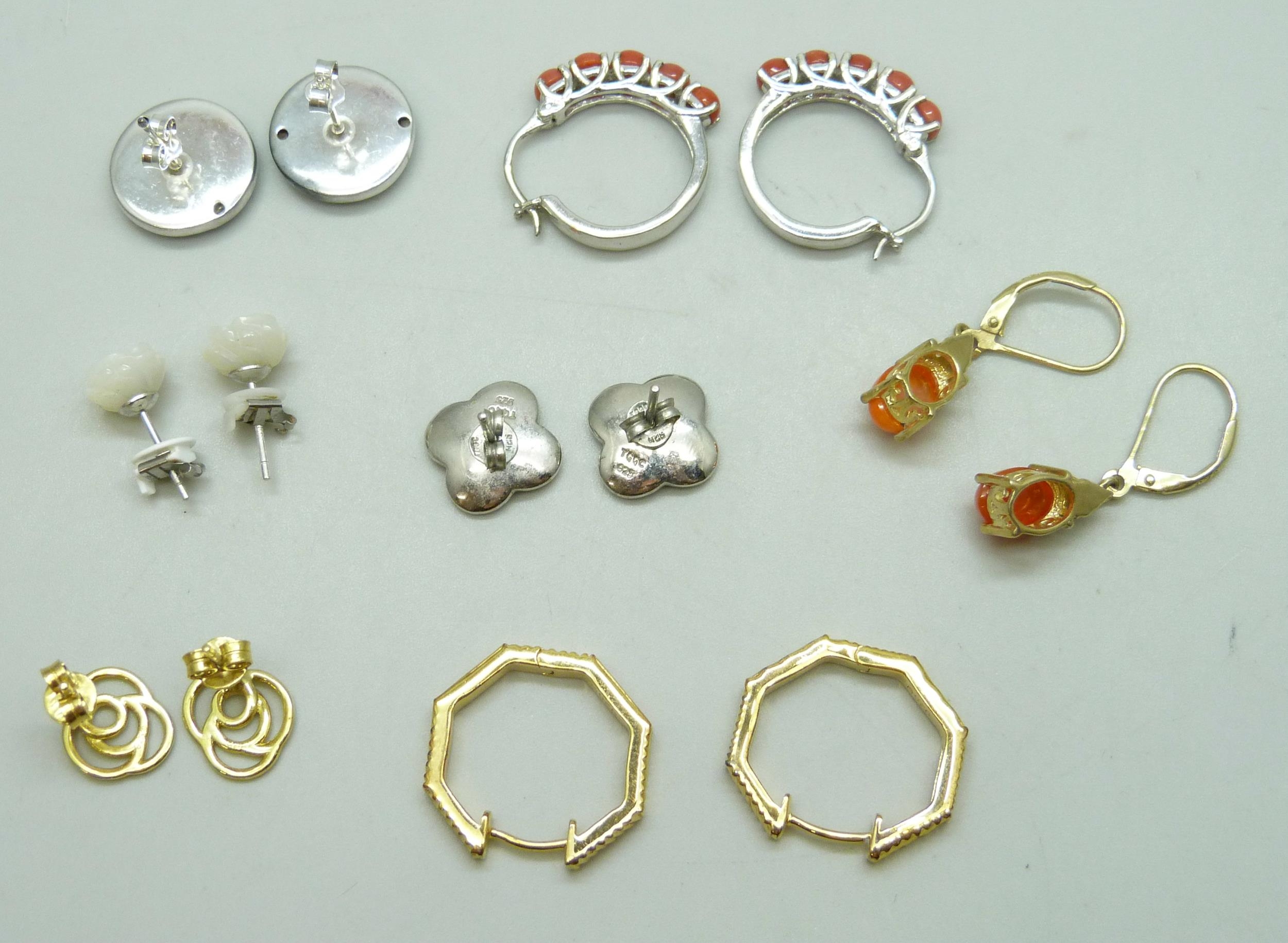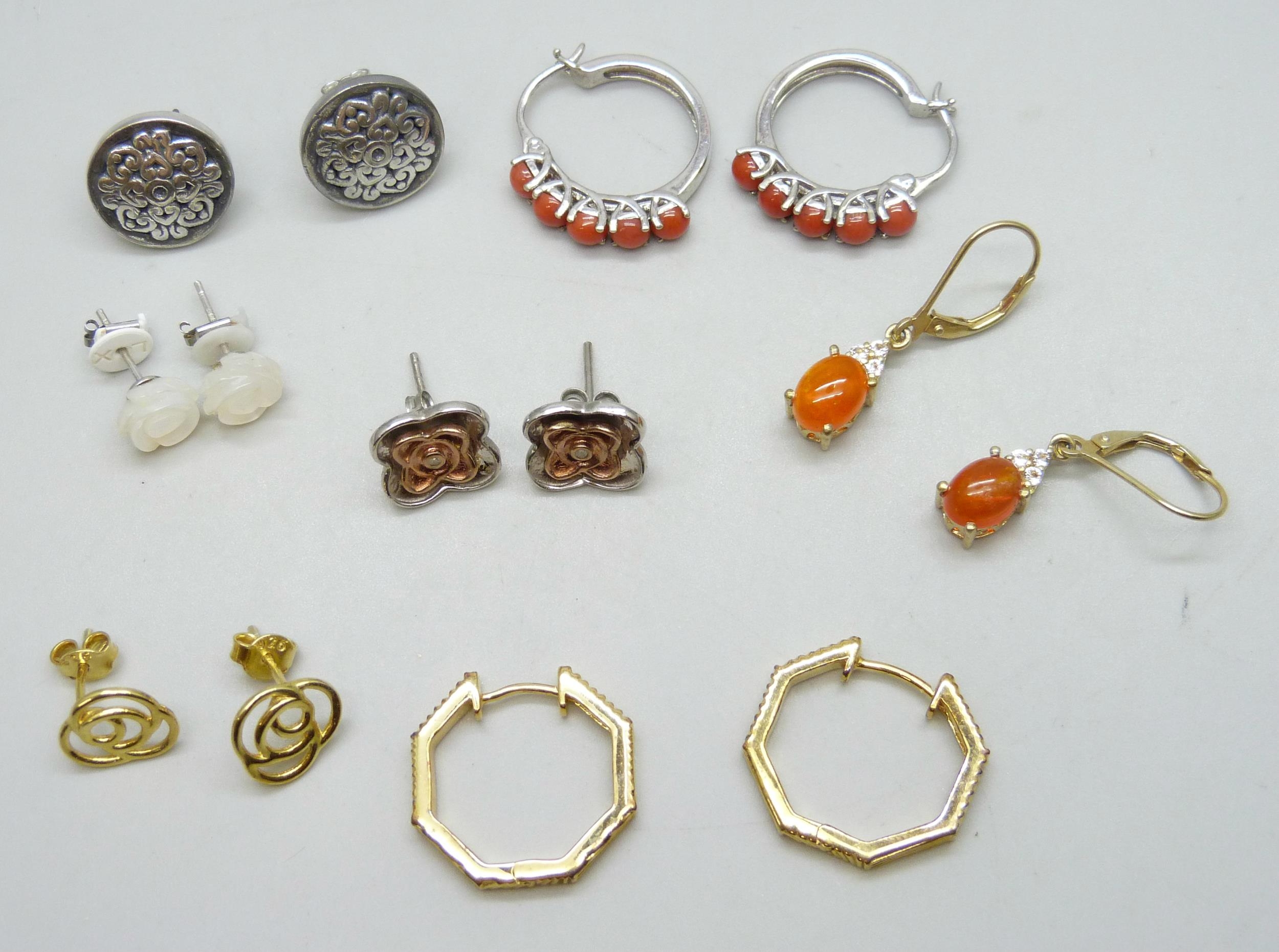 Seven pairs of silver earrings set with coral, opal, a pair of Celtic design studs, etc.