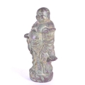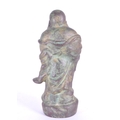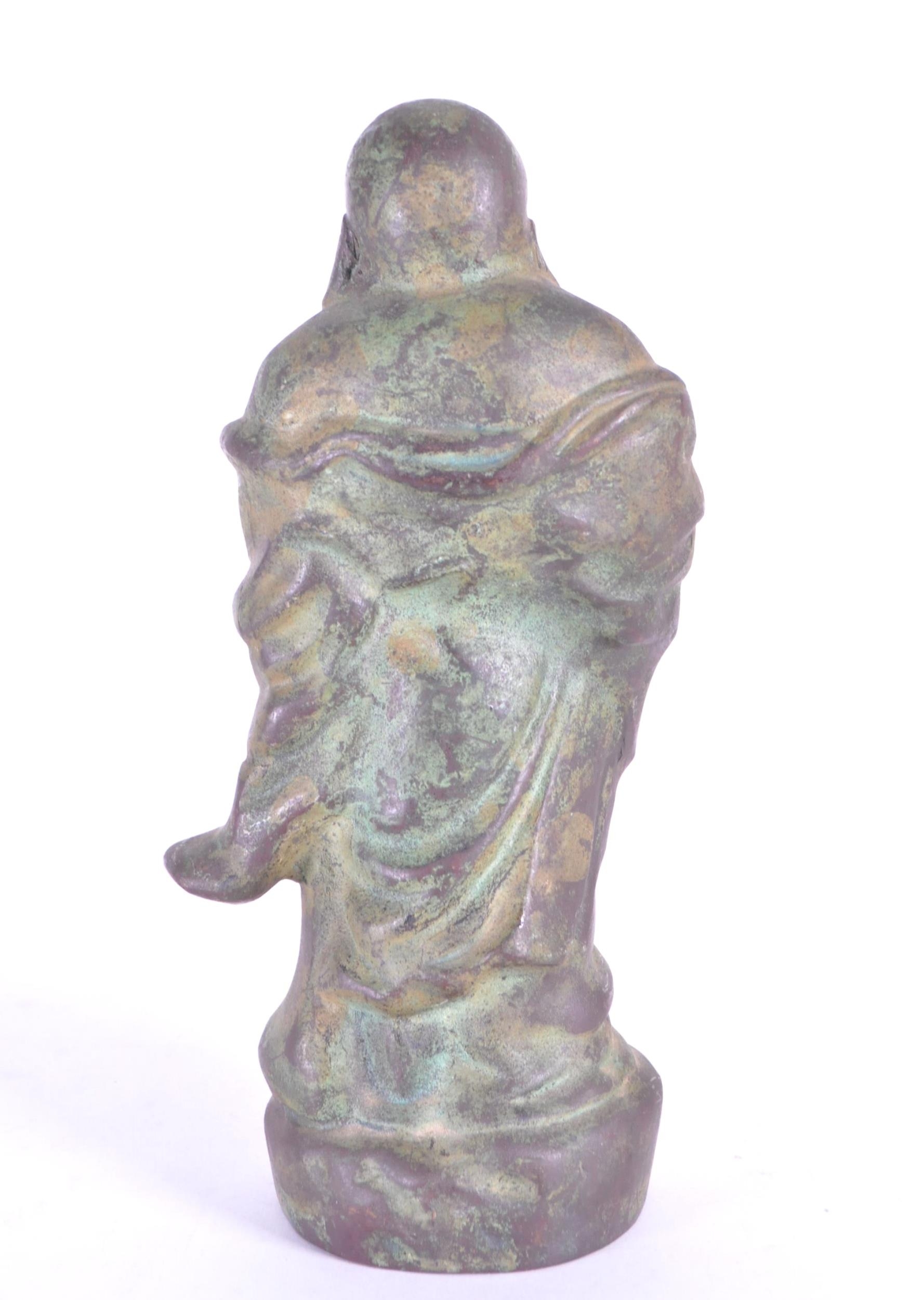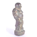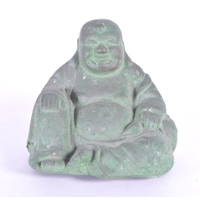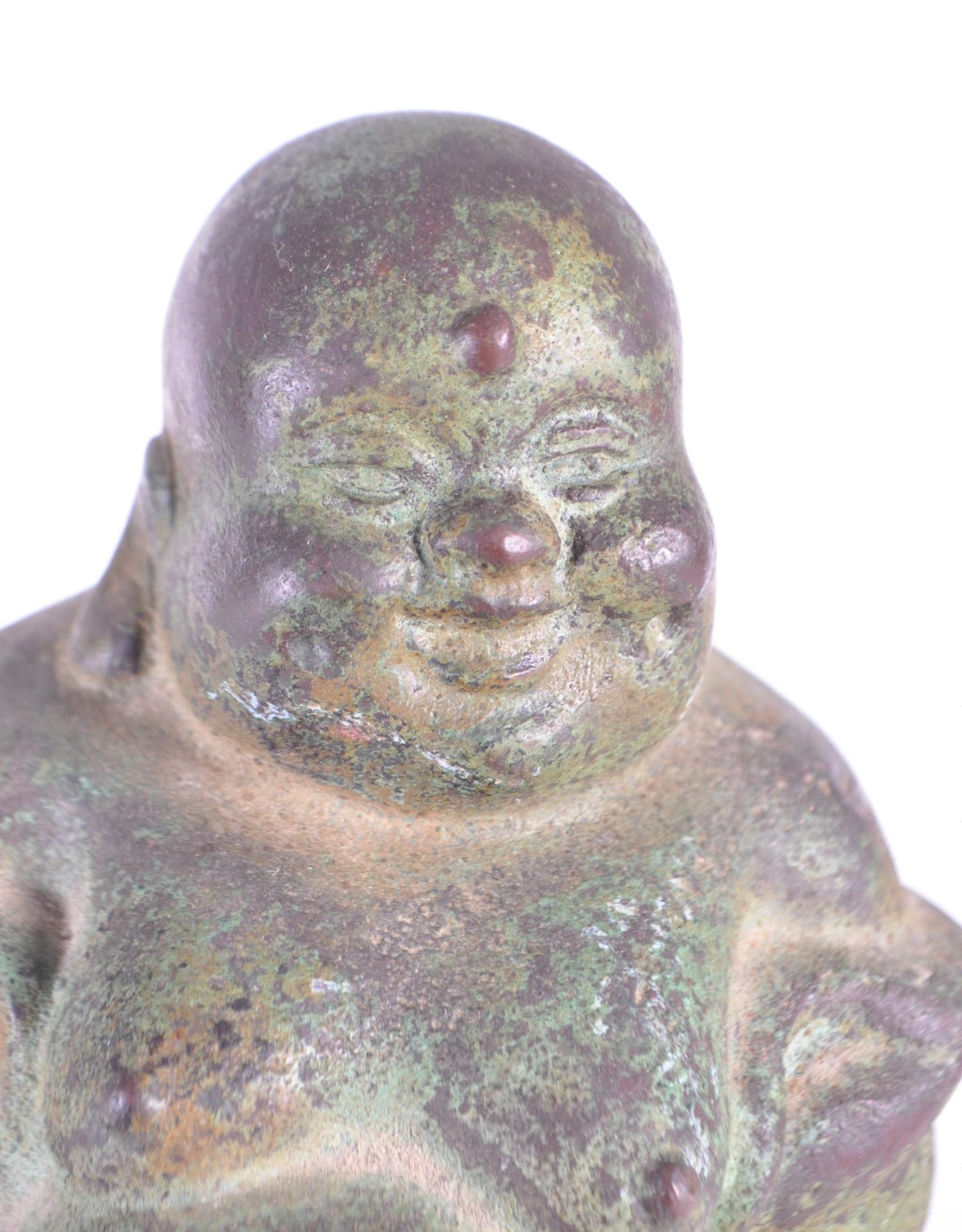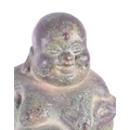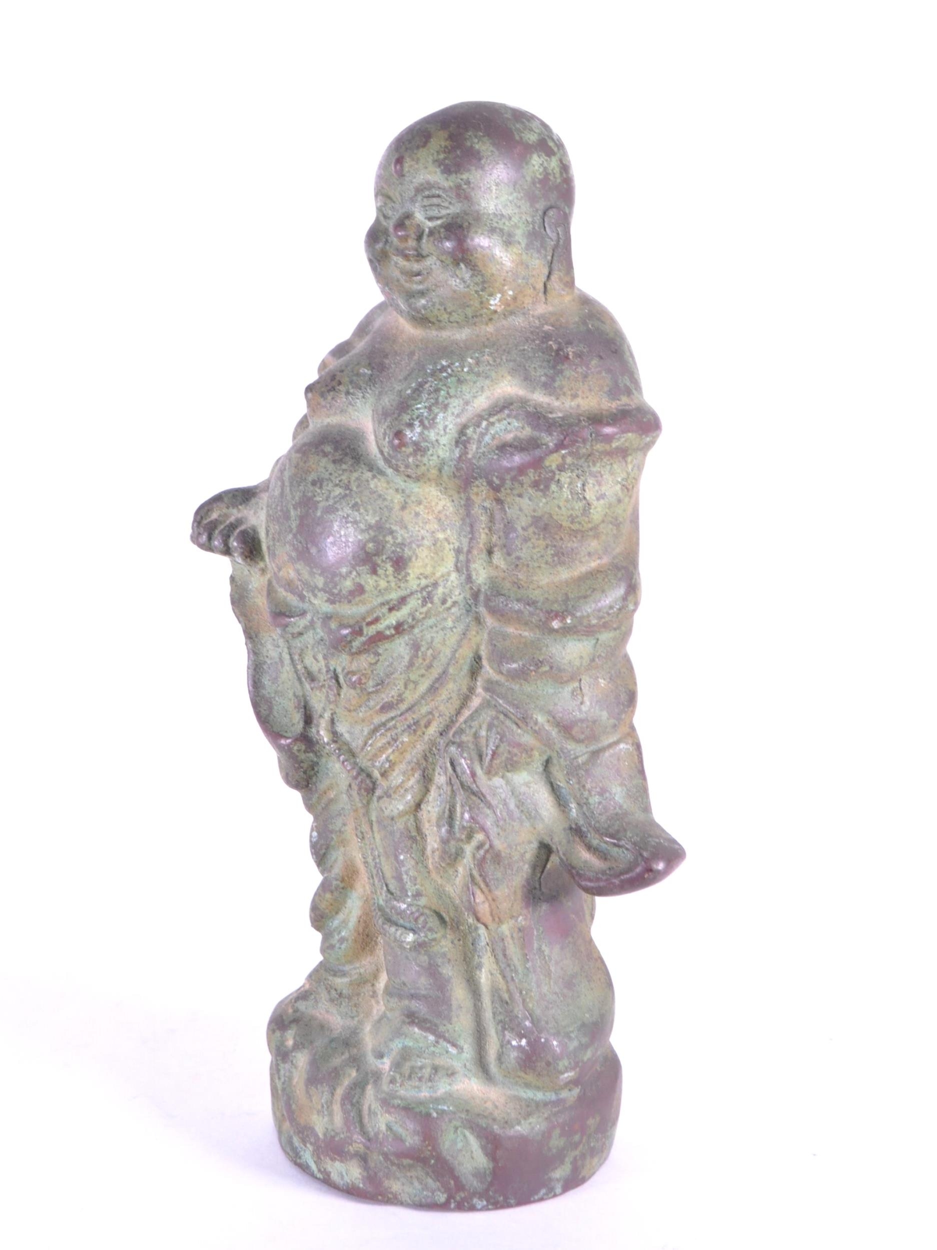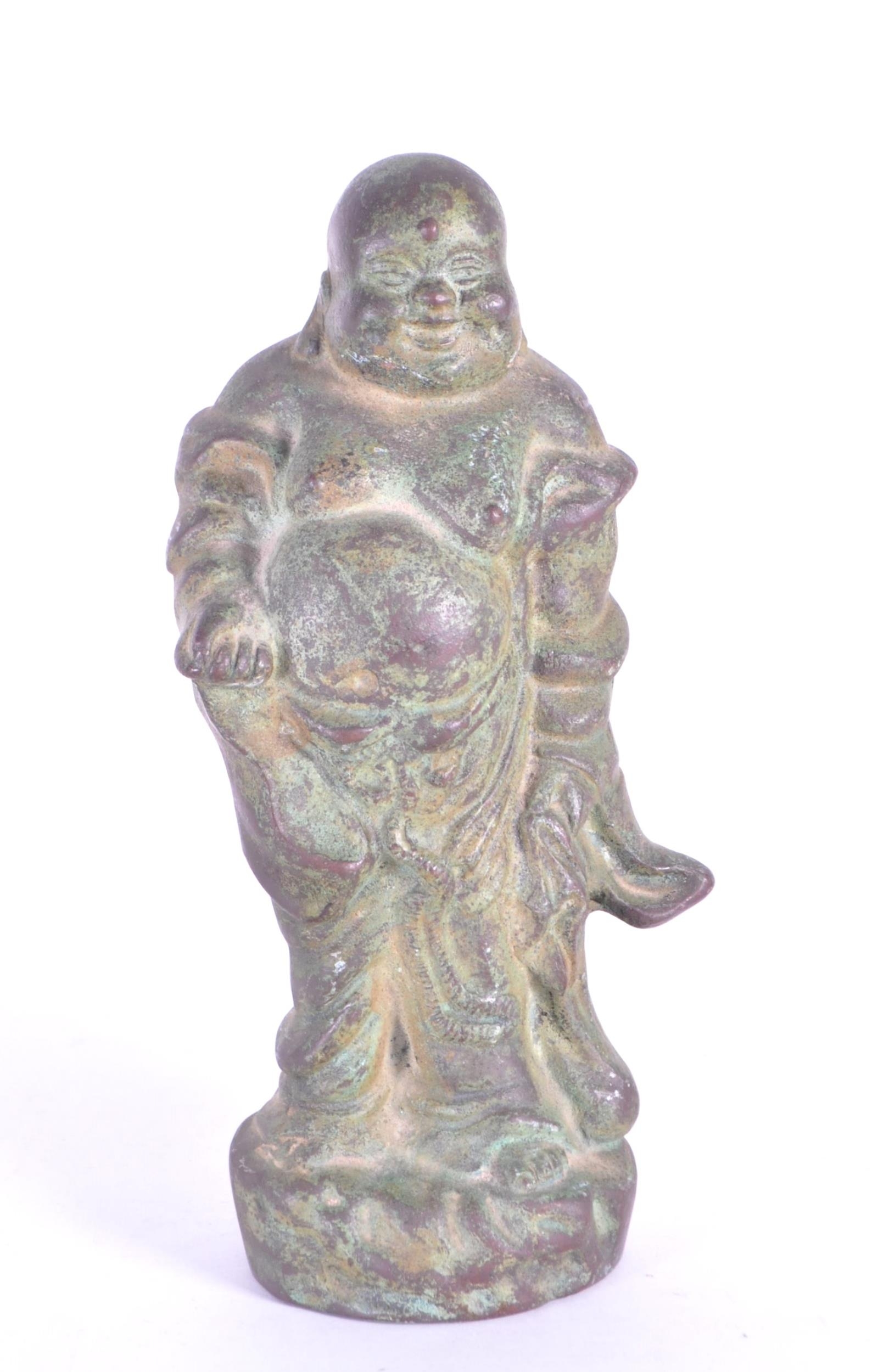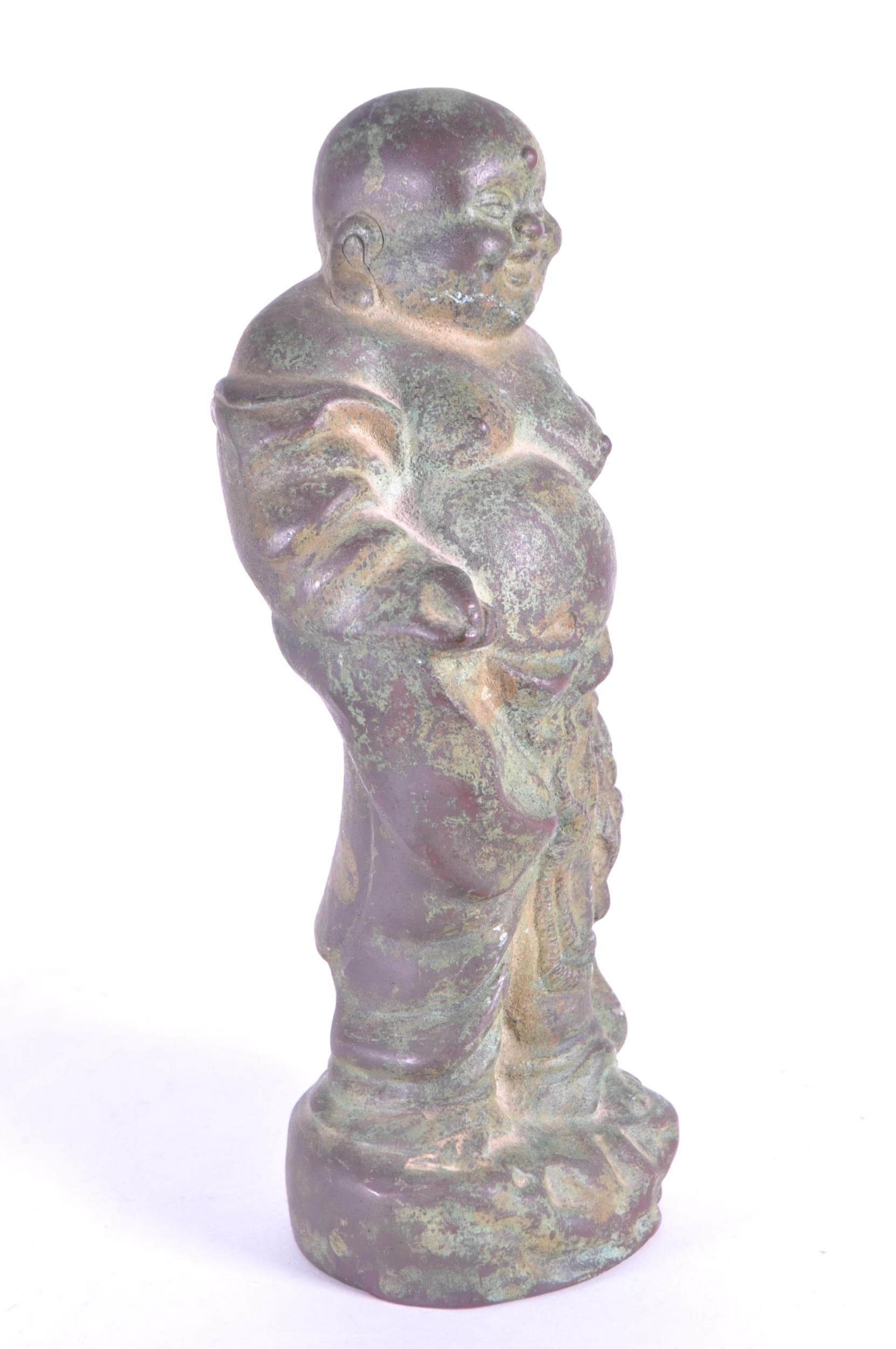 A vintage 20th century metal standing Chinese laughing Buddha. Measures approx. 22cm tall - Patina throughout in a standing position on a naturalistic base.